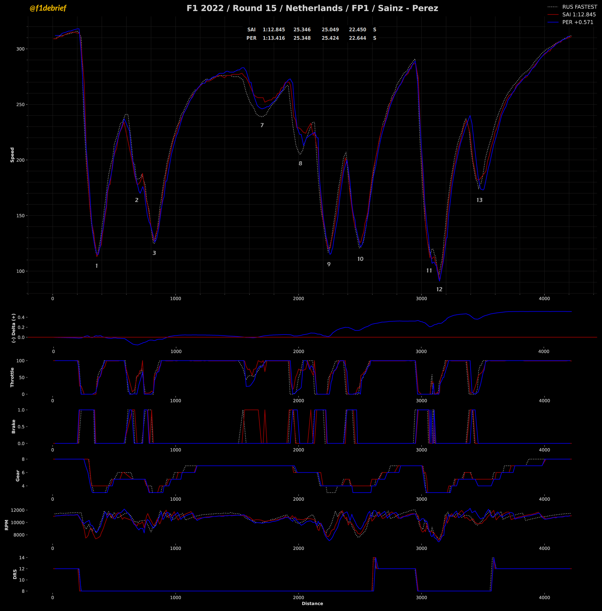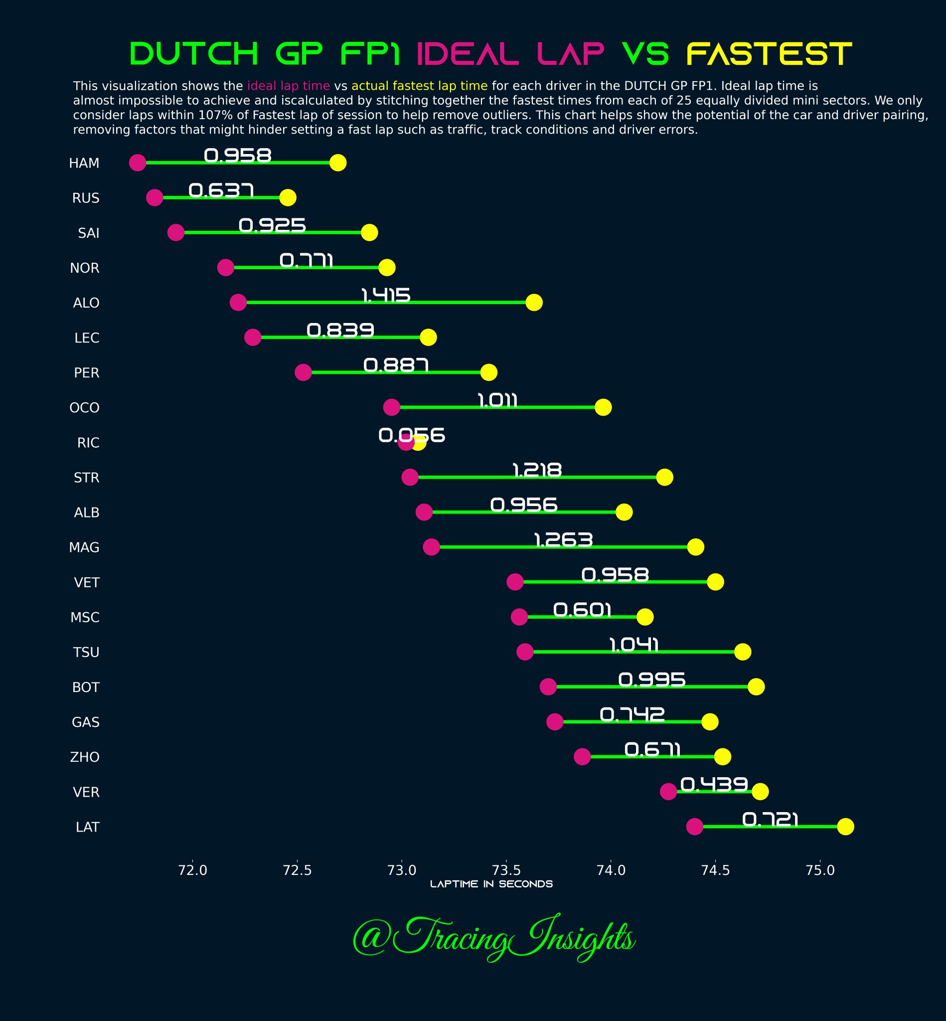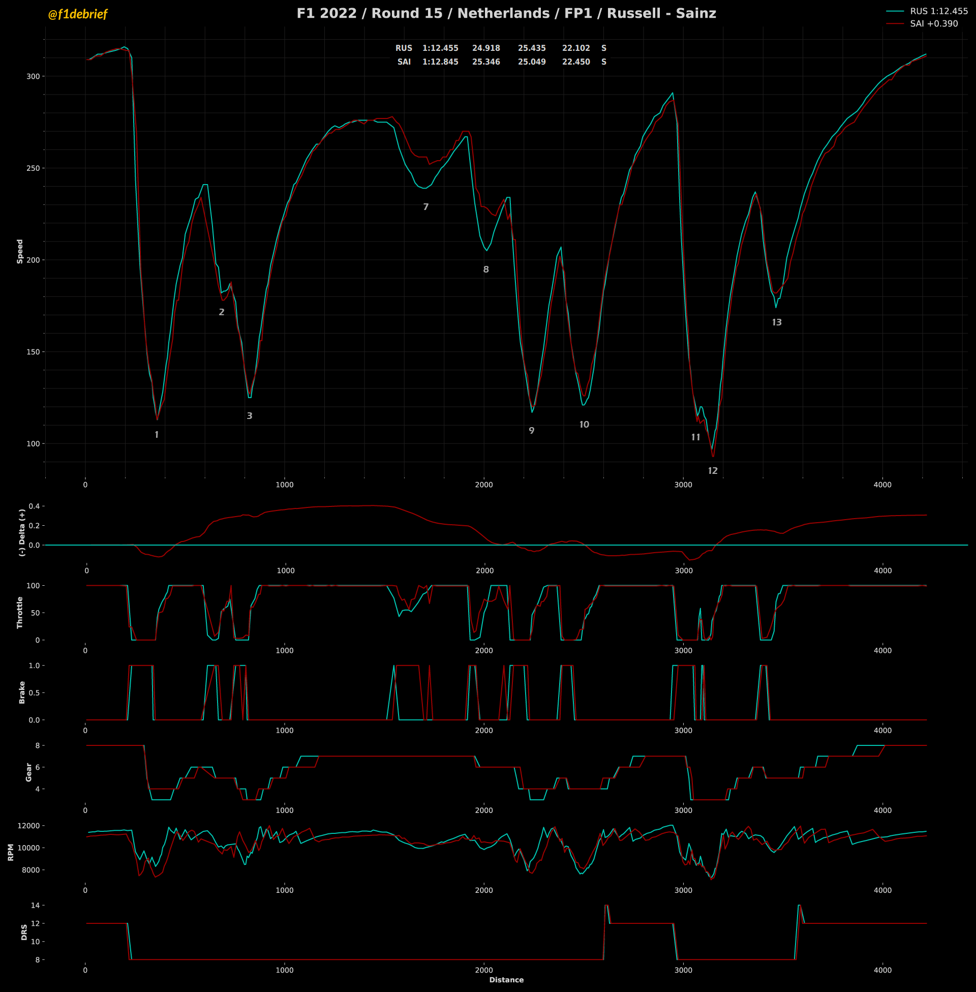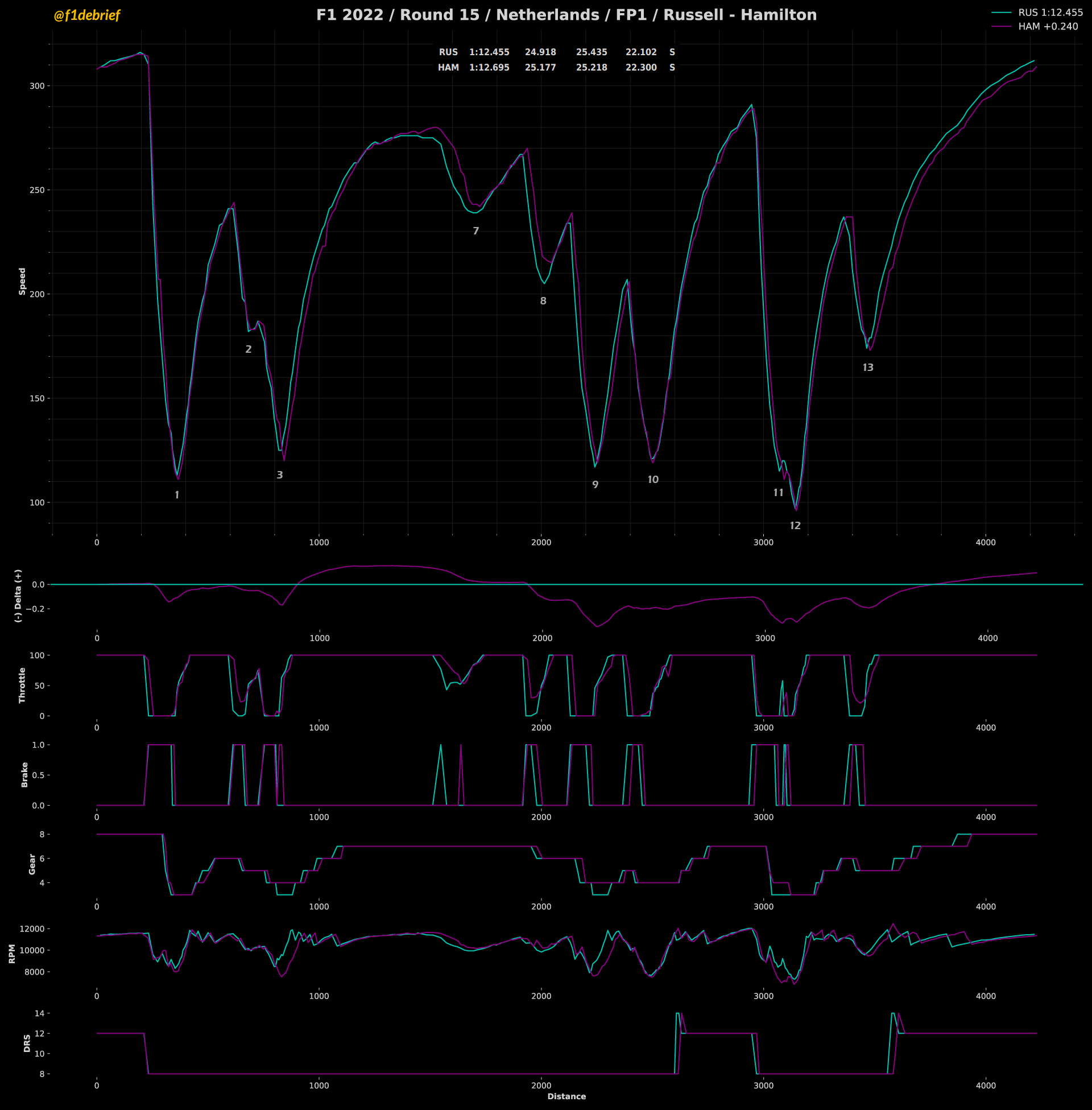 Η Mercedes ξεκίνησε με τον καλύτερο τρόπο το τριήμερο του GP Ολλανδίας, με τον George Russell να σημειώνει τον ταχύτερο χρόνο του FP1, με τον team-mate του, Lewis Hamilton να τον ακολουθεί στην κατάταξη, αλλά με αρκετά μεγάλη διαφορά (0,24 δλ.). Οι δύο οδηγοί της γερμανικής ομάδας ευνοήθηκαν από το γεγονός ότι τοποθέτησαν στα μονοθέσιά τους τη μαλακή γόμα πολύ αργότερα από τους υπόλοιπους, με τις συνθήκες στην αρκετά σκονισμένη πίστα να έχουν βελτιωθεί αρκετά.