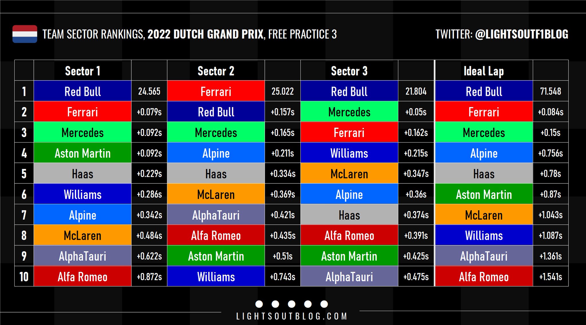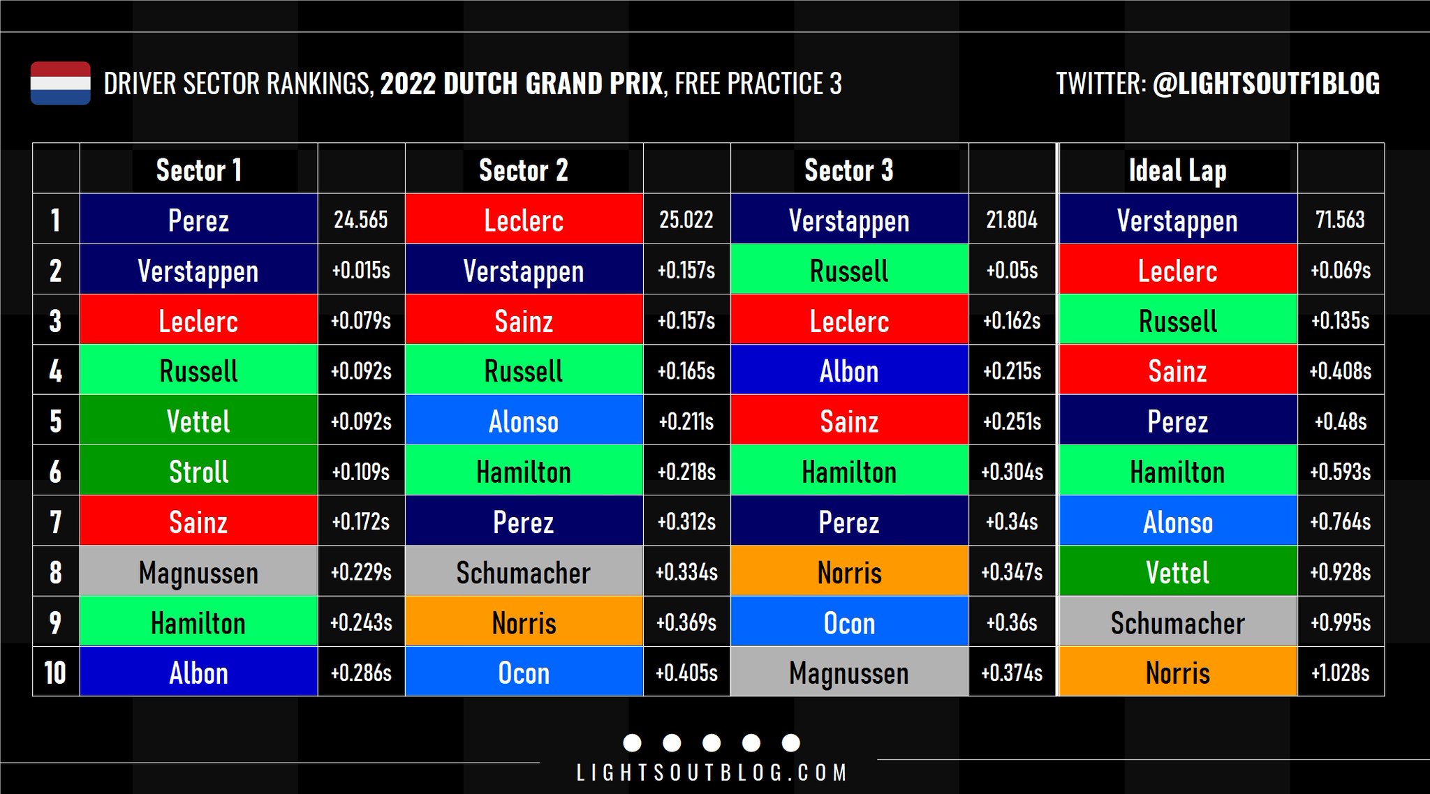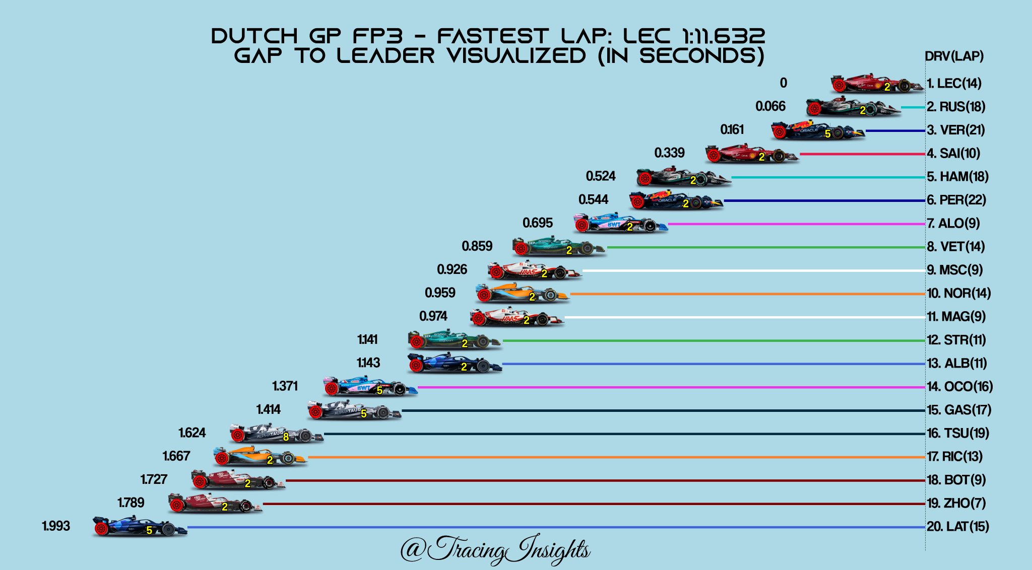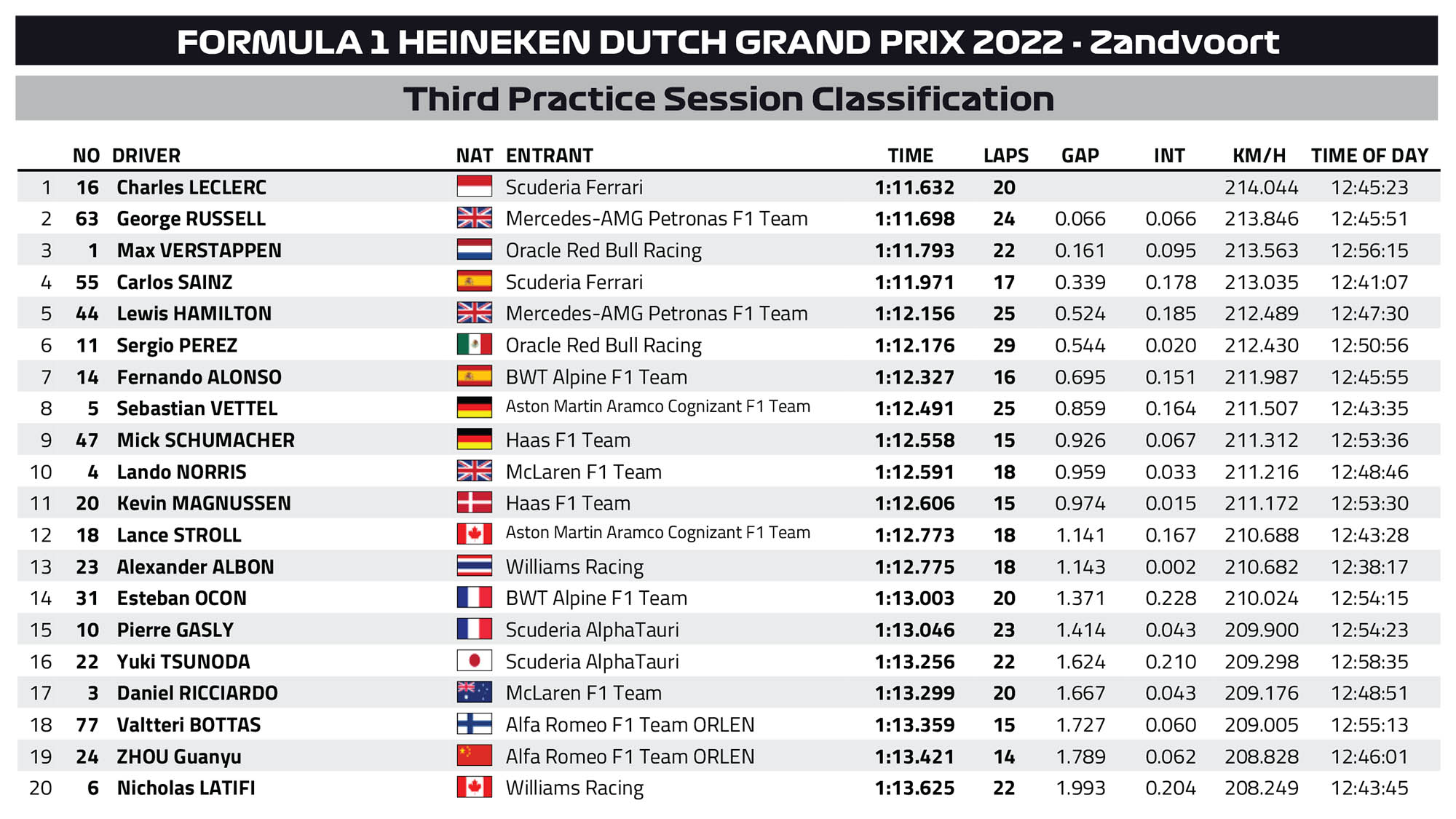 Ο Charles Leclerc, ο ταχύτερος οδηγός του FP2, ήταν επικεφαλής και στην τελική διαδικασία ελεύθερων δοκιμών του GP Ολλανδίας με τη Ferrari, ωστόσο η διαφορά του από τη Mercedes του 2ου, George Russell ήταν μόλις 66 χλστ. του δλ. Πολύ καλύτερη εικόνα από εχθές επέδειξε ο Max Verstappen με τη Red Bull, ο οποίος κυριάρχησε στο πρώτο μισό του FP3, αλλά βρέθηκε 161 χλστ. του δλ. πίσω από τον Μονεγάσκο.