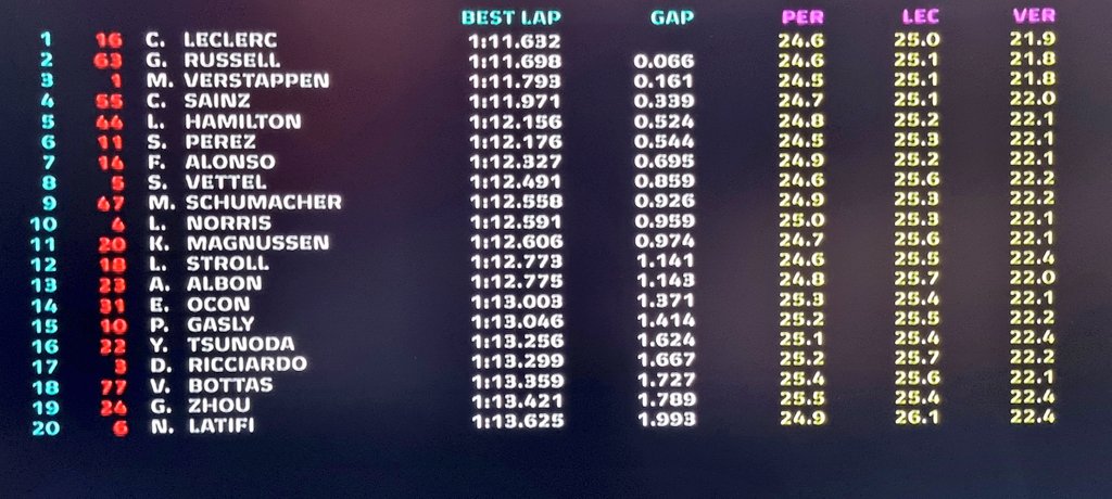 Με την ίδια σειρά των τριών πρώτων κατατάχθηκαν πίσω τους και οι team-mate τους, με τον Carlos Sainz στην 4η θέση, 339 χλστ. του δλ. πίσω από τον team-mate του. Πίσω του, μόλις 20 χλστ. του δλ. χώριζαν τον Lewis Hamilton και τον Sergio Perez, ο οποίος είχε αρκετά παράπονα από τη συμπεριφορά του μονοθεσίου του, που παρουσίαζε αρκετή υποστροφή στις αργές στροφές.