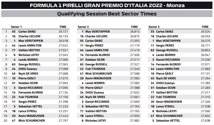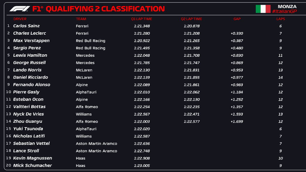 Με την ποινή που έχει δεχθεί, ο Sainz θα εκκινήσει από την 18η θέση τον αυριανό αγώνα. Ο Sergio Perez, που βρέθηκε 1 δλ. πίσω από τον επικεφαλής και θα βρεθεί στη 13η θέση της σειράς εκκίνησης του αγώνα. Τον 5ο ταχύτερο χρόνο των κατατακτήριων δοκιμών βρέθηκε ο Lewis Hamilton, ο οποίος θα μεταφερθεί στη 19η θέση του grid. O Βρετανός κατάφερε να κινηθεί ταχύτερα από τον team-mate του, George Russell, ο οποίος θα εκκινήσει αύριο από τη 2η θέση.