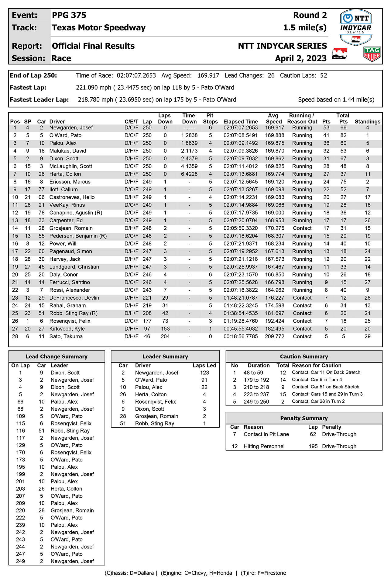 Ο 2 φορές Πρωταθλητής του IndyCar, Josef Newgarden κατέκτησε με το μονοθέσιο της Penske την 3η του νίκη στον αγώνα 375 μιλίων στην οβάλ πίστα του Τέξας, υπό καθεστώς κίτρινης σημαίας, έπειτα από μία συναρπαστική μάχη με τους Pato O’Ward (McLaren) και Alex Palou (Chip Ganassi).