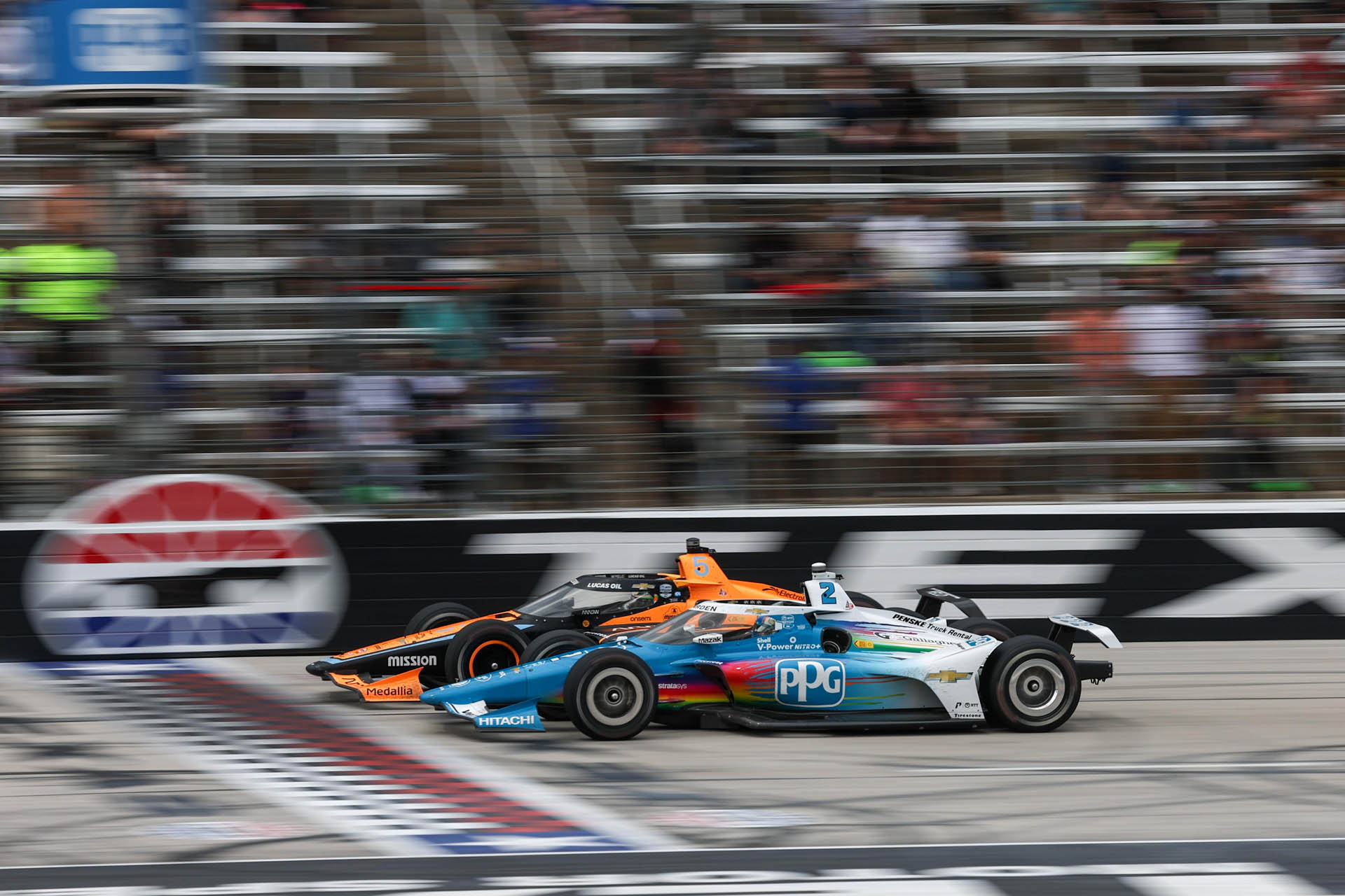 Το ατύχημα του Takuma Sato (Chip Ganassi) επέφερε κίτρινες σημαίες και στα pits o Alex Rossi (McLaren) συγκρούστηκε με τον Kyle Kirkwood (Andretti). Αυτό προκάλεσε ζημιά στην ανάρτηση του μονοθεσίου της McLaren, με τον Rossi να δέχεται και ποινή διέλευσης από το pit lane, λόγω μη ασφαλούς απελευθέρωσης. Στην επανεκκίνηση του 60ού γύρου, ο Palou πέρασε μπροστά για λίγο, αλλά σύντομα ο Newgarden ανέκτησε την πρωτοπορία.