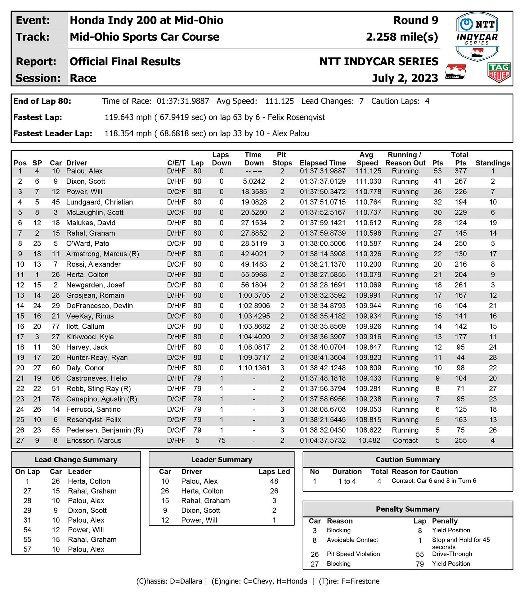 Στο δεύτερο pit stop του, ο Herta υπερέβη το όριο ταχύτητας στο pit lane και η ποινή που δέχθηκε τον έριξε στην 11η θέση, ενώ και ο Rahal είχε ένα καταστροφικό pit stop. O Palou κέρδισε ανενόχλητος, με τον team-mate του, Scott Dixon να ολοκληρώνει το θρίαμβο της Chip Ganassi Racing. Το βάθρο συμπλήρωσε ο περυσινό Πρωταθλητής Will Power με το μονοθέσιο της Penske.