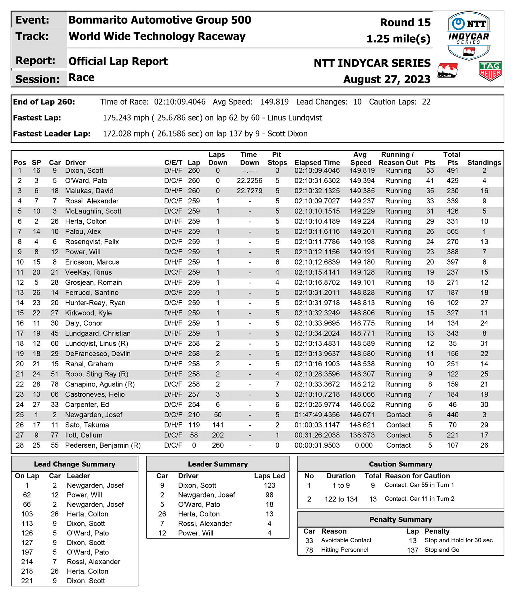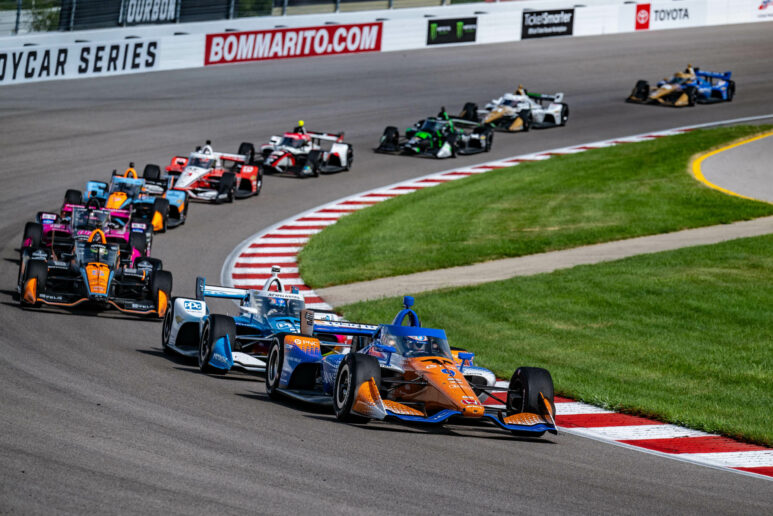 Στην επανεκκίνηση του 135ου γύρου, λίγο μετά τα μισά του αγώνα, ο O’Ward είχε επαφή με το Newgarden στη μάχη για τη 2η θέση, γεγονός που επέτρεψε στον Dixon να απομακρυνθεί. Ο O’Ward εισήλθε στα pits στον 166o, ξεκινώντας μία αλυσιδωτή αντίδραση pit stop κατά τη διάρκεια των οποίων ο Μεξικανός κατάφερε να υποσκελίσει το Newgarden και να πάρει τη δεύτερη θέση.
