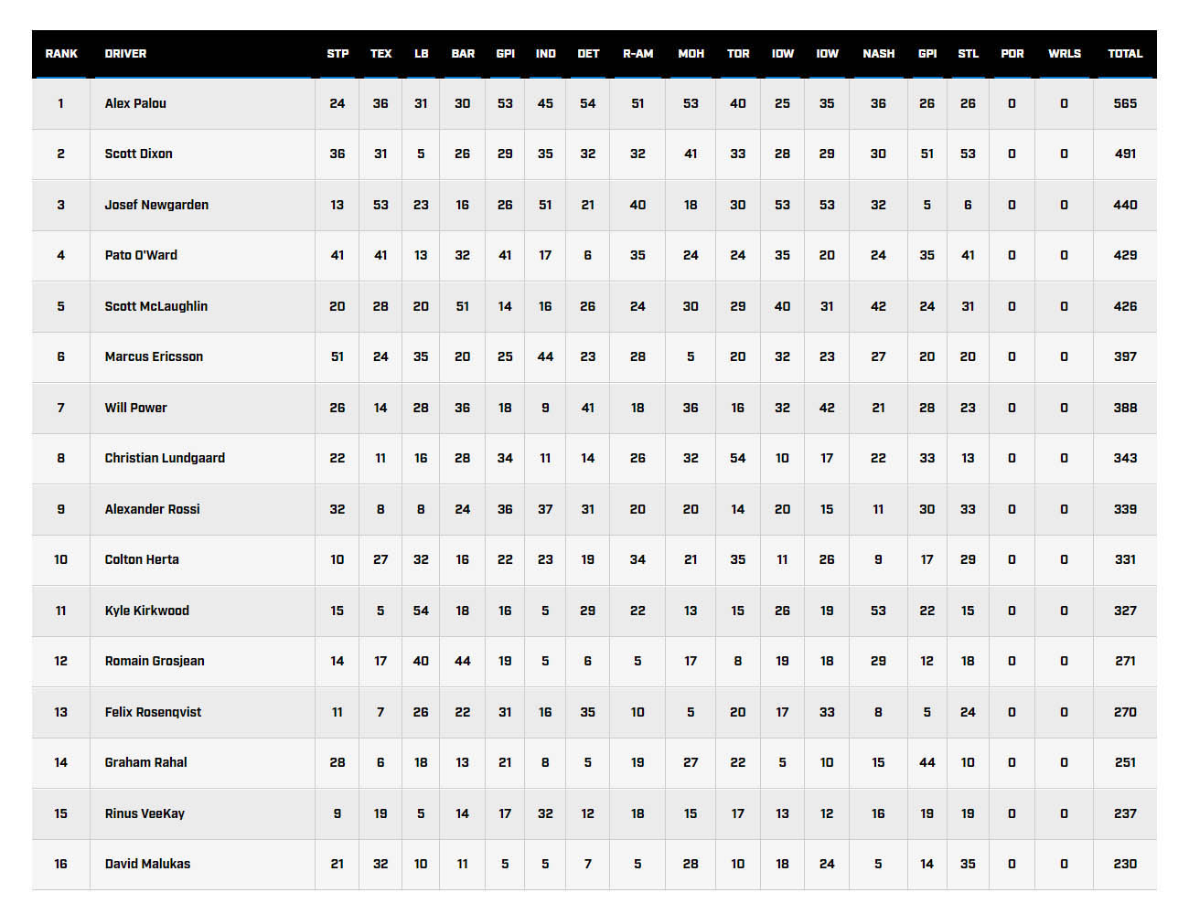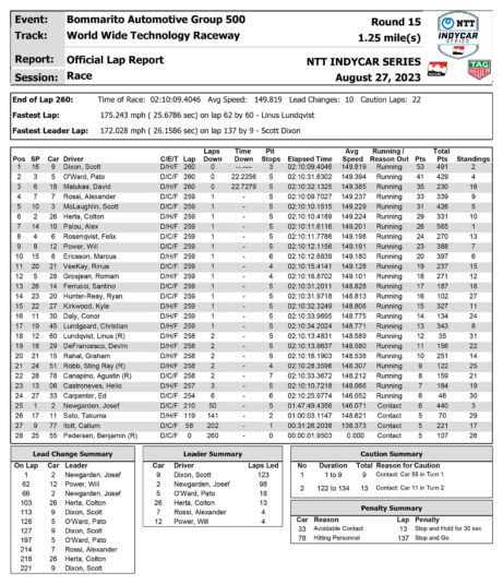 Ο Dixon επέστρεψε στην πίστα στη 10η θέση, 10 δευτερόλεπτα πίσω από τον επικεφαλής, αλλά από πλευράς στρατηγικής βρισκόταν στην καλύτερη θέση. Ο Newgarden μπήκε για τελευταία φορά στα pits με 52 γύρους να απομένουν, σε μια προσπάθεια να κάνει undercut στον O’Ward, αλλά οι McLaren του παρέμειναν στην πίστα. Καθώς ο Newgarden πίεζε για να αποκτήσει το πλεονέκτημα έναντι του O’Ward, χτύπησε στον τοίχο στη στροφή 2, και έχασε κάθε ελπίδα να διεκδικήσει τον τίτλο.