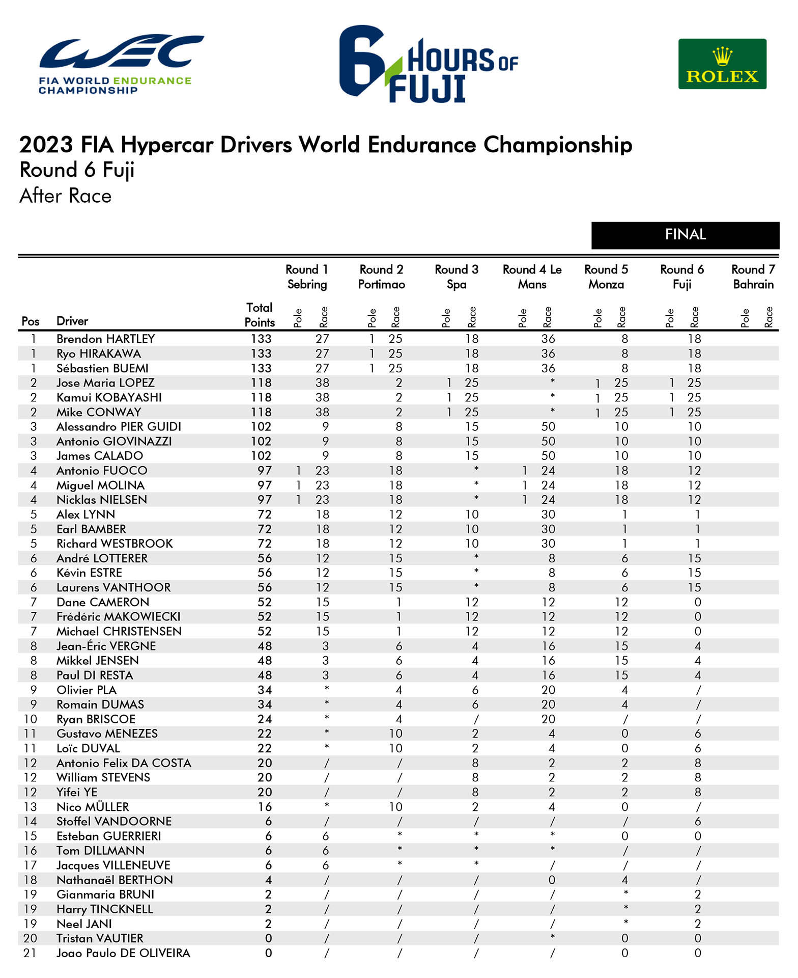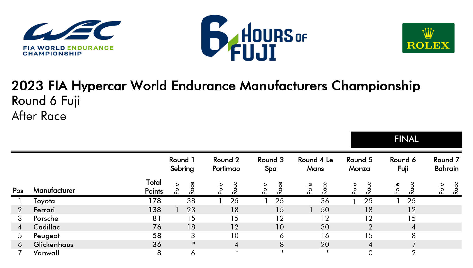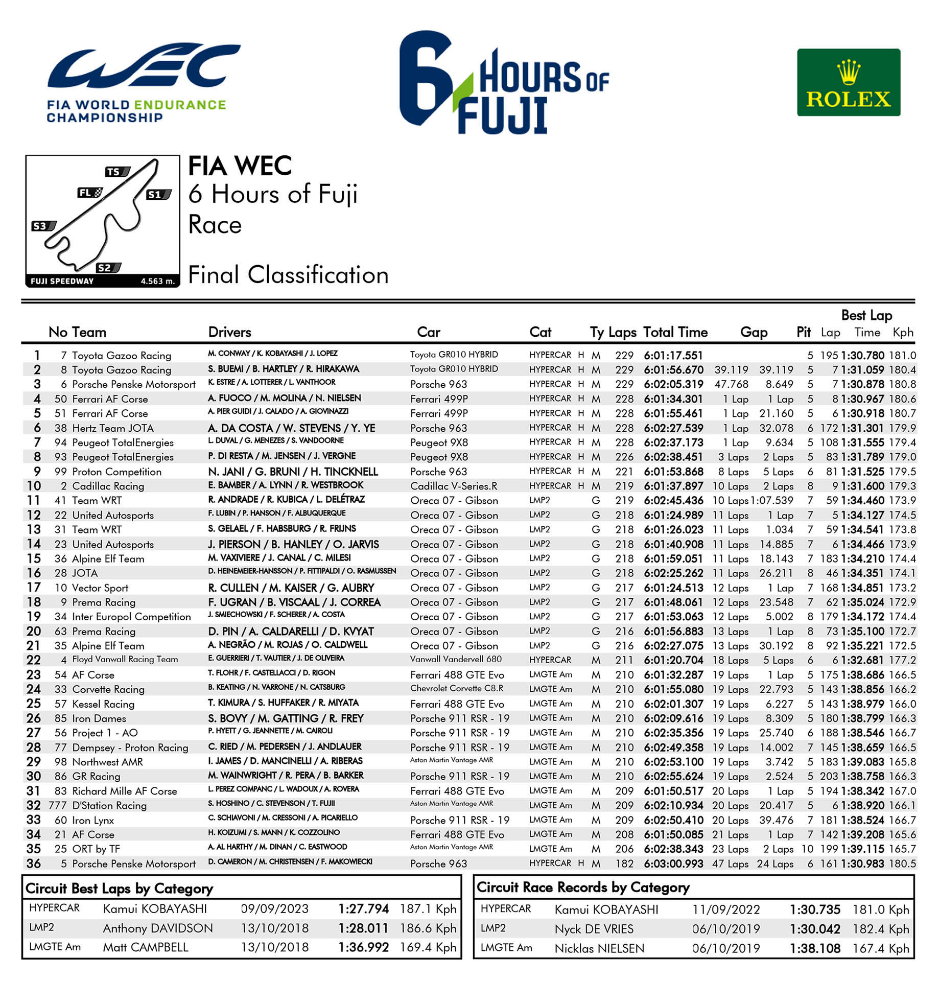 Στην πίστα που της ανήκει, το Fuji της Ιαπωνίας, η Toyota Gazoo Racing σημείωσε ένα ονειρεμένο αποτέλεσμα, καταλαμβάνοντας τις δύο πρώτες θέσεις στον τερματισμό. Με αυτό τον τρόπο, η ιαπωνική ομάδα εξασφάλισε και μαθηματικά το φετινό Πρωτάθλημα Κατασκευαστών του WEC. Η τριάδα των Kamui Kobayashi, Jose Maria Lopez και Mike Conway με το #7 Toyota GR010 Hybrid Hypercar σφράγισε την τέταρτη νίκη της στη σεζόν 2023, με διαφορά 39,119 δλ. επί των team-mate τους, Brendon Hartley, Sebastien Buemi και Ryo Hirakawa, που οδηγούν το πρωτότυπο #8.
