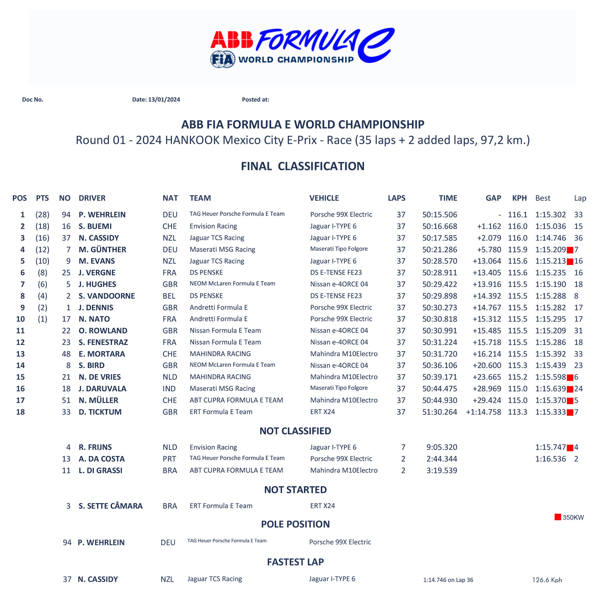 O Pascal Wehrlein βρισκόταν υπό έρευνα, μαζί με τους οδηγούς της Andretti (η οποία χρησιμοποιεί σύστημα κίνησης της Porsche), καθώς υπήρχαν υποψίες ότι τα μονοθέσια χρησιμοποιούσαν ένα είδος συστήματος ελέγχου της πρόσφυσης, μέσω του λογισμικού, που περιορίζει το σπινάρισμα, προσδίδοντας καλύτερη εκκίνηση.