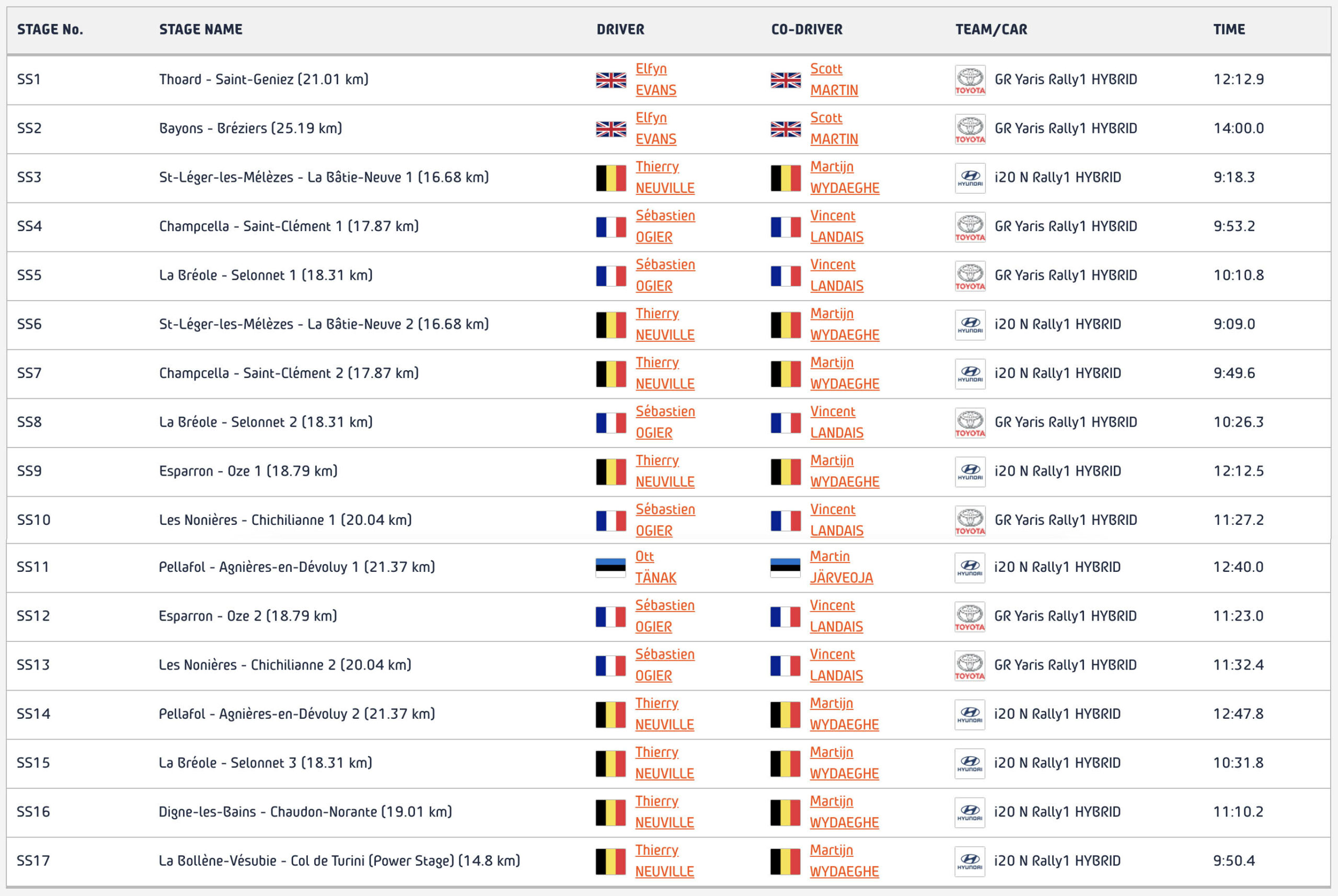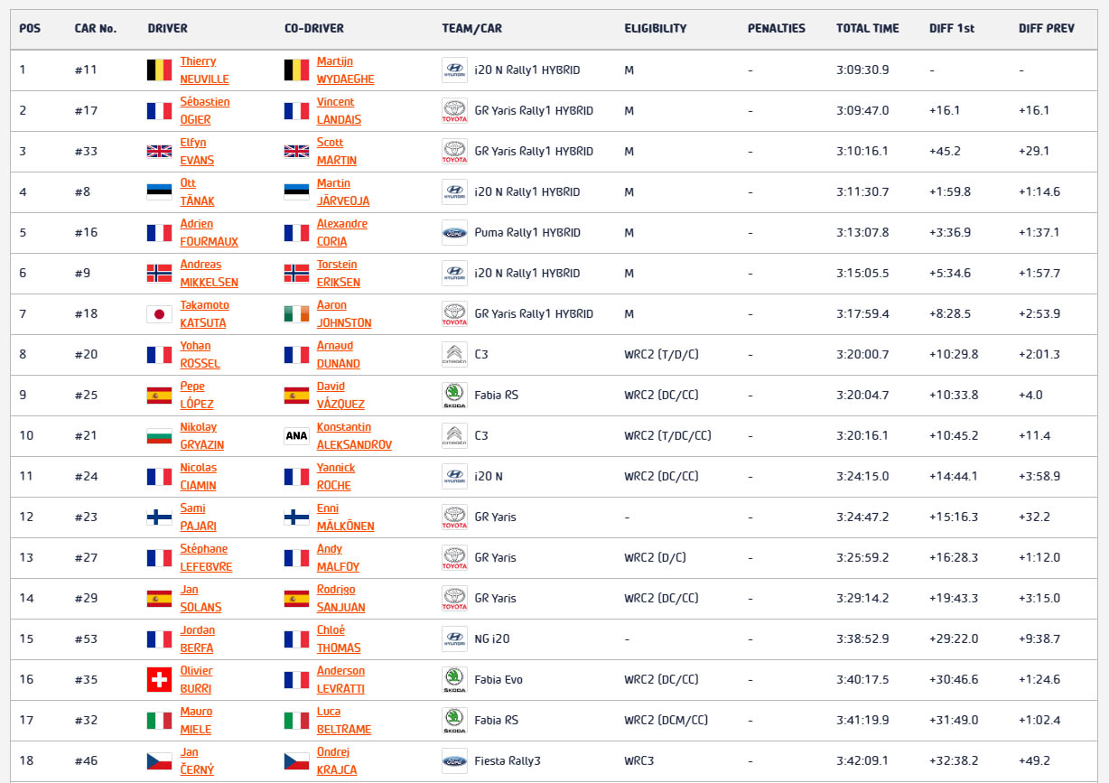 Στα αρχικά στάδια του αγώνα, ο Elfyn Evans με το Toyota GR Yaris ήταν αυτός που είχε τεθεί επικεφαλής, καθώς και τα τρία Hyundai αντιμετώπισαν μικρά προβλήματα στις δύο πρώτες νυχτερινές ειδικές του αγώνα την Πέμπτη. Την Παρασκευή, ο Γάλλος οδηγός της Toyota, Sebastien Ogier, πέρασε στην επίθεση, ανεβαίνοντας στη 2η θέση, εμπρός από τον Thierry Neuville (Hyundai).