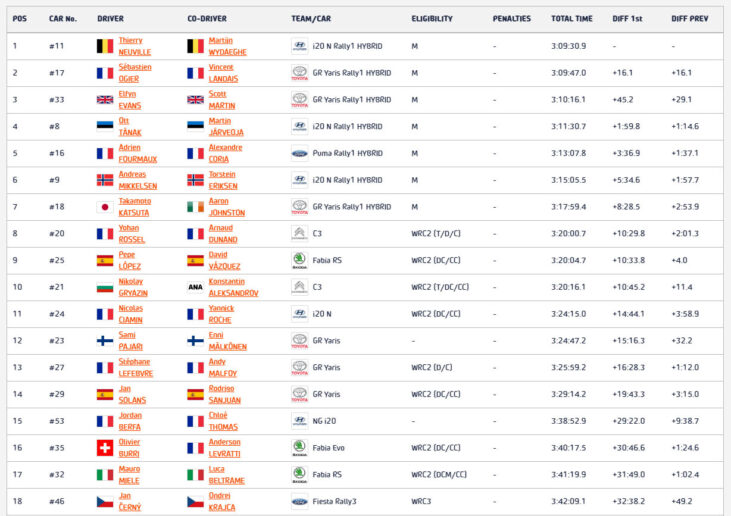 Το βάθρο συμπλήρωσαν οι Ogier και Evans, με τον Ott Tanak στην 4η θέση. Ο Γάλλος Adrien Fourmaux, με το Ford Puma της M-Sport έκανε ένα δυνατό και σταθερό αγώνα για να εξασφαλίσει την 5η θέση, εμπρός από το Νορβηγό Andreas Mikkelsen (Hyundai) και τον Ιάπωνα Takamoto Katsuta.