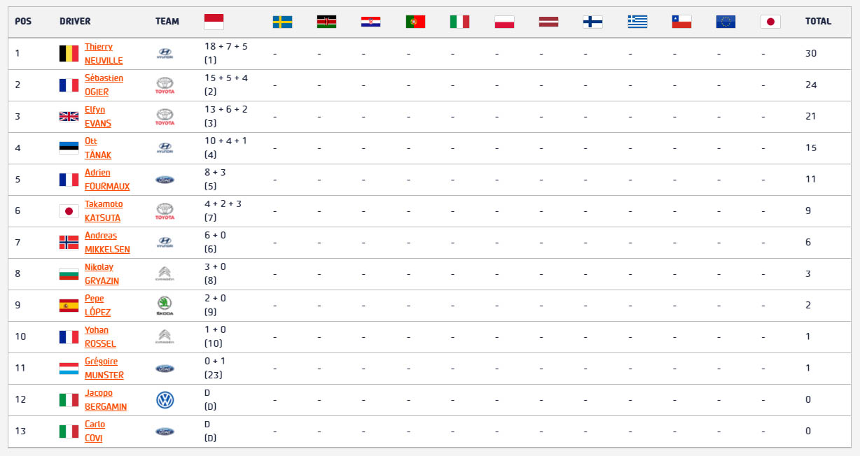 Στην 4η ειδική διαδρομή του αγώνα ο Neuville έχασε το πίσω μέρος του Hundai σε μία στιγμή που του κόστισε περισσότερα από 10 δλ., γεγονός που επέτρεψε στον Ogier να περάσει μπροστά του. Ο Γάλλος μείωσε τη διαφορά του από τον επικεφαλής Evans στα 4,5 δλ. έως το τέλος της Παρασκευής, σημειώνοντας τον ταχύτερο χρόνο σε 3 από τις 6 ειδικές διαδρομές της ημέρας, με το Neuville 16,1 δλ. μακριά από την κορυφή της γενικής κατάταξης.