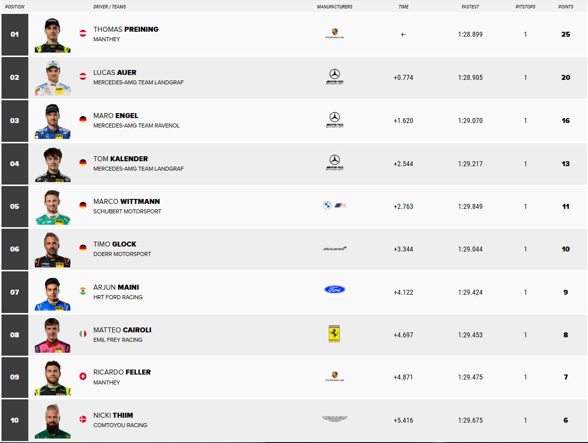 O Αυστριακός Thomas Preining, κάτοχος του τίτλου του 2023 στο DTM (Γερμανικό Πρωτάθλημα Τουρισμού που διεξάγεται με αυτοκίνητα GT3) ξεκίνησε τη φετινή σεζόν με νίκη στην πατρίδα του, στην πίστα του Red Bull Ring στο Spielberg, οδηγώντας την Porsche 911 GT3 R της ομάδας της Manthey.
