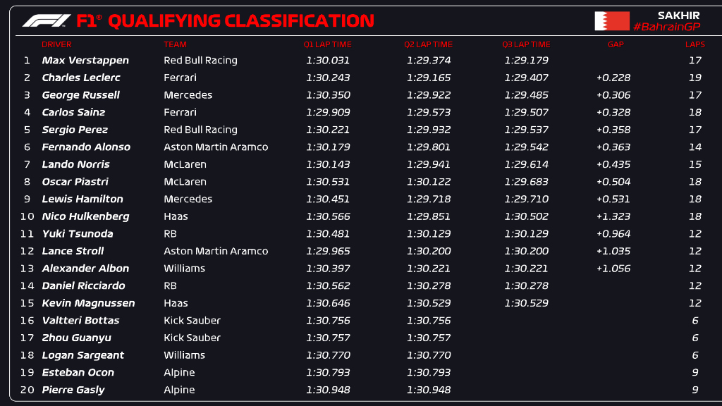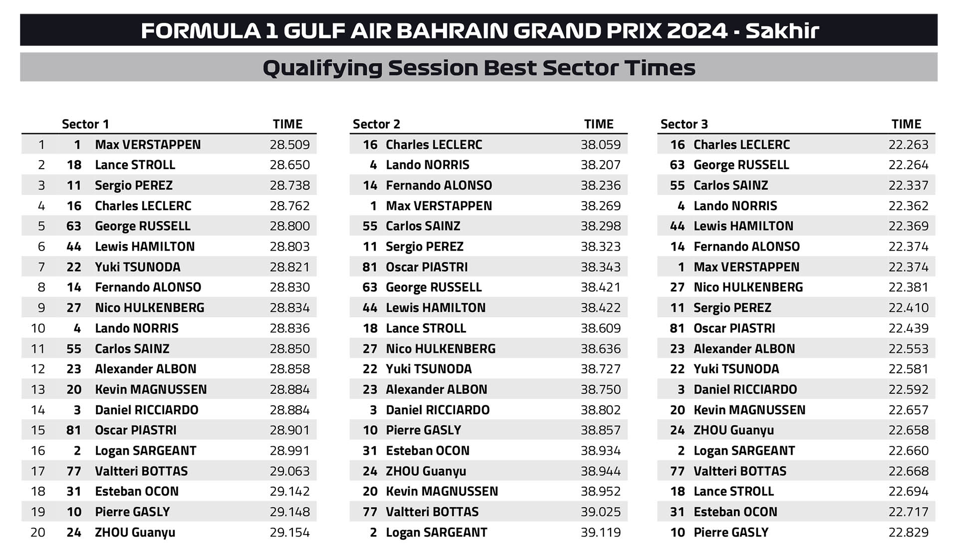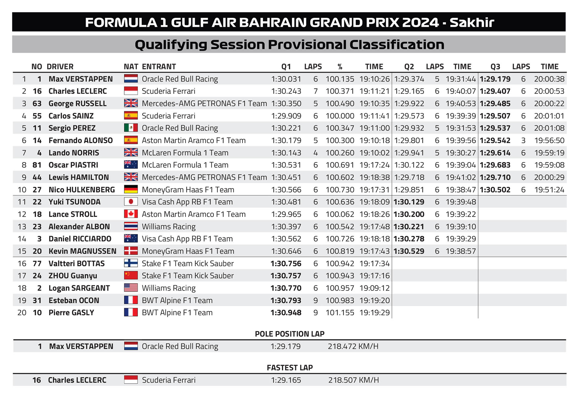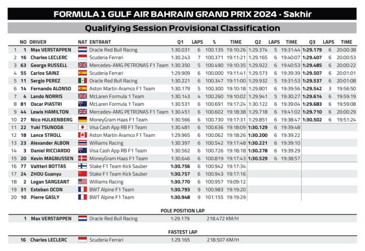 O Max Verstappen ξεκίνησε τη σεζόν της Formula 1 του 2024 με την 33η pole position της καριέρας του (ισοφαρίζοντας τους Jim Clark και Alain Prost στον αντίστοιχο πίνακα στατιστικών σε όλη την ιστορία του σπορ) και την 3η του στο GP Μπαχρέιν. Στην ταχύτερη προσπάθειά του, ο Ολλανδός εκμεταλλεύτηκε το slipstream του Oscar Piastri στην αρχή του γύρου του και ο χρόνος του (1:29.178) ήταν ανταγωνιστικός, αλλά όχι ο ταχύτερος της διαδικασίας. Ο Verstappen απολογήθηκε από το μηχανολόγο αγώνα, Gianpiero Lambiase, μάλλον επειδή είχε προβλέψει ότι δε θα μπορούσε να κατακτήσει την pole position.