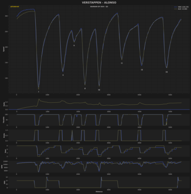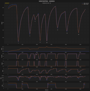 Πίσω από τον Ισπανό θα παραταχθούν οι δύο McLaren, σε μία πίστα που δεν της ταιριάζει, με το Lando Norris να κάνει δύο λάθη στις 4 πρώτες στροφές και να χάνει 0,3 δλ. κατά τα λεγόμενά του. Ακόμα και το μισό από αυτό να ήταν, θα μπορούσε να είχε βρεθεί στη 2η θέση, δεδομένων με μία McLaren που είχε καλύτερη ισορροπία στις χαμηλότερες θερμοκρασίες. Ο Βρετανός ήταν απογοητευμένος διότι πιστεύει ότι δεν έκανε αυτό που θα έπρεπε. Ο Piastri από την πλευρά του δήλωσε ότι δεν κατάφερε να συνδυάσει όλους τους παράγοντες μαζί, αλλά ήταν ενθαρρυντικό ότι η διαφορά από τους υπόλοιπους δεν ήταν μεγάλη.
