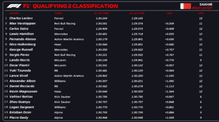 Πιο αργός οδηγός του Q2 ήταν ο Kevin Magnussen, ενώ ο team-mate του στη Haas, Nico Hulkenberg βρέθηκε στην 6η θέση. Η RB κατέλαβε την 11η και 15η θέση με τους Yuki Tsunoda και Daniel Ricciardo, αντίστοιχα. O Ιάπωνας έχασε την πρόκριση στο Q3 από τον Piastri για μόλις 0,007 δλ. ενώ ο Lance Stroll (Aston Martin) κατετάγη 12ος, εμπρός από τον Alex Albon με τη Williams.