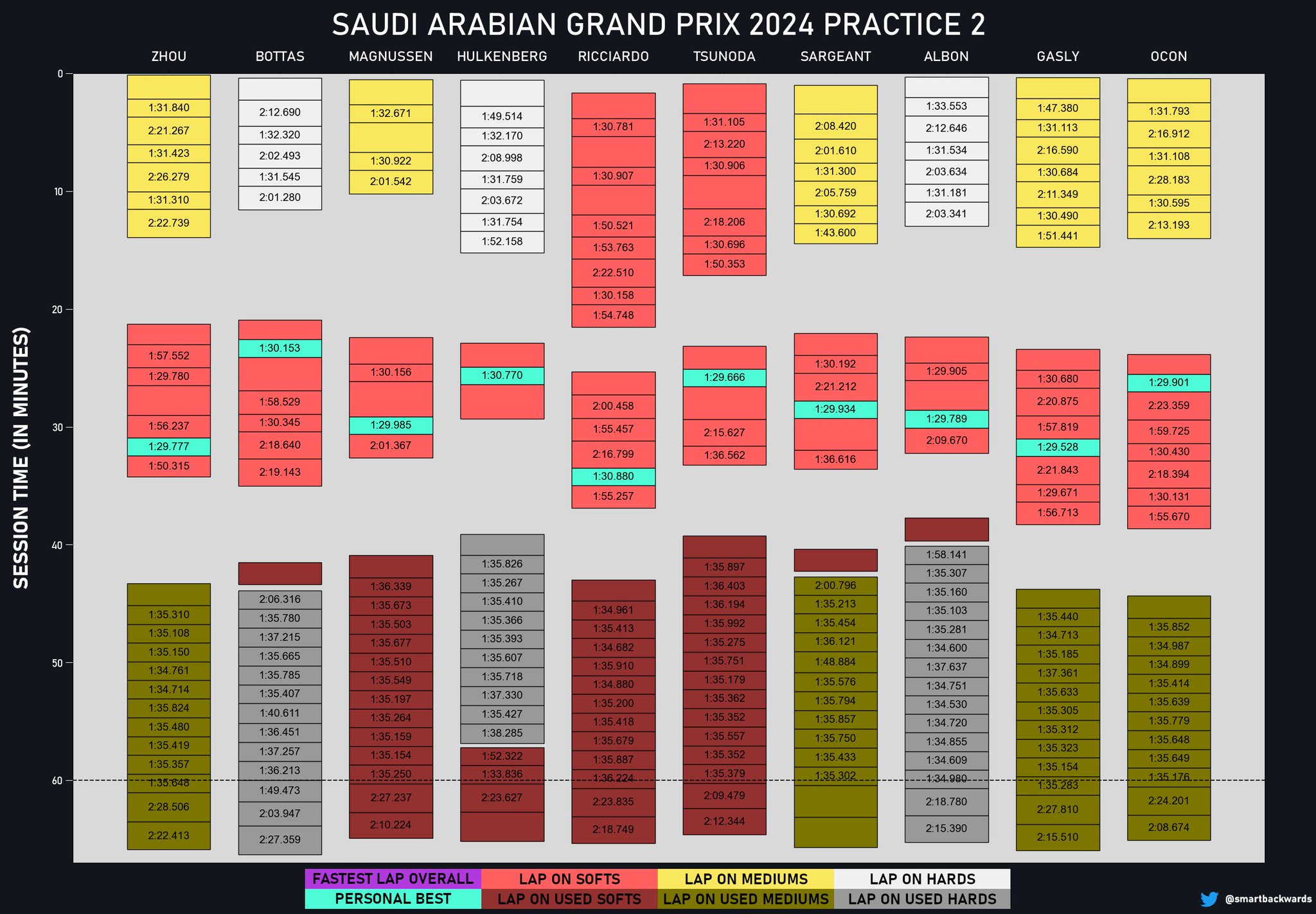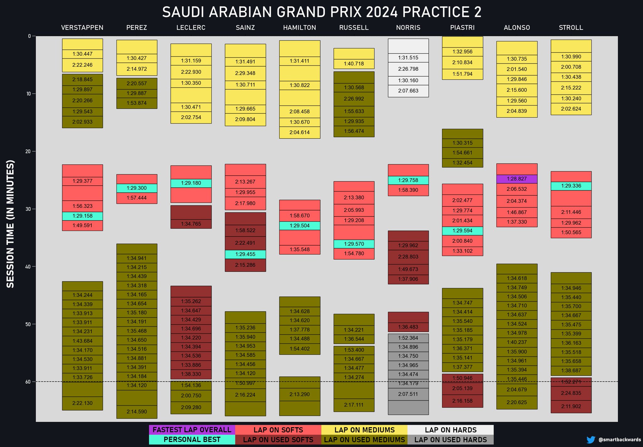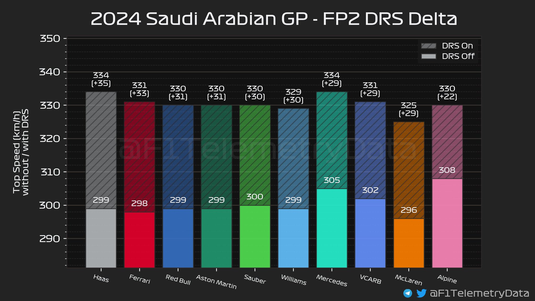 Το FP2 είναι η πιο σημαντική περίοδος ελεύθερων δοκιμών του GP Σαουδικής Αραβίας, δεύτερου γύρου του φετινού Πρωταθλήματος της Formula 1, καθώς είναι η μοναδική που διεξάγεται σε αντιπροσωπευτικές συνθήκες. Η έναρξη του FP2 καθυστέρησε 10 λεπτά (τα οποία όμως δε χάθηκαν), επειδή βρέθηκαν χαλαρές βίδες σε καλύμματα υδρορροής του pit lane. O Fernando Alonso με την Aston Martin έκανε την έκπληξη με έναν ταχύτατο χρόνο στην πρώτη του γρήγορη προσπάθεια με τη μαλακή γόμα, την οποία κανείς άλλος δεν κατάφερε να πλησιάσει.