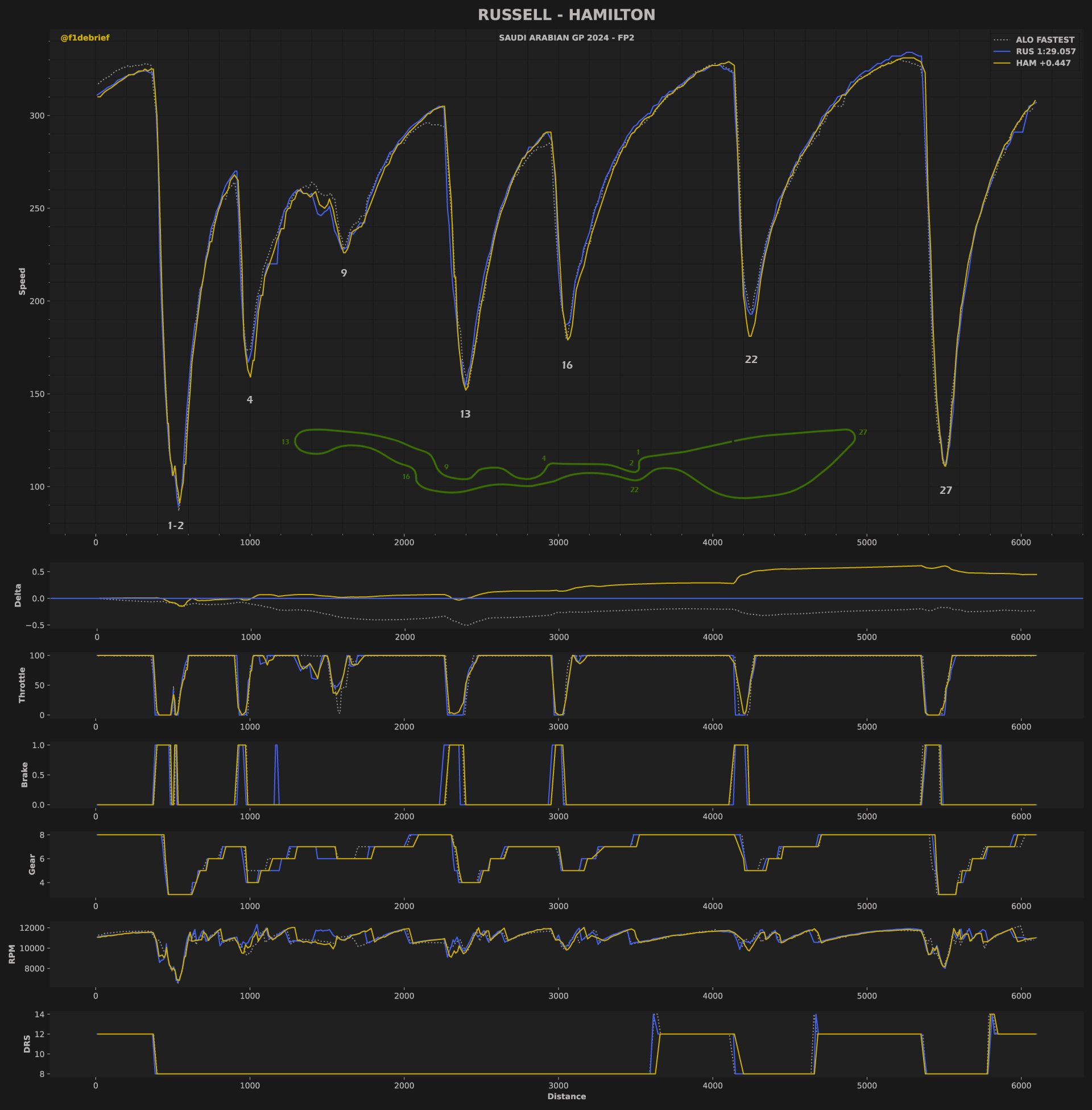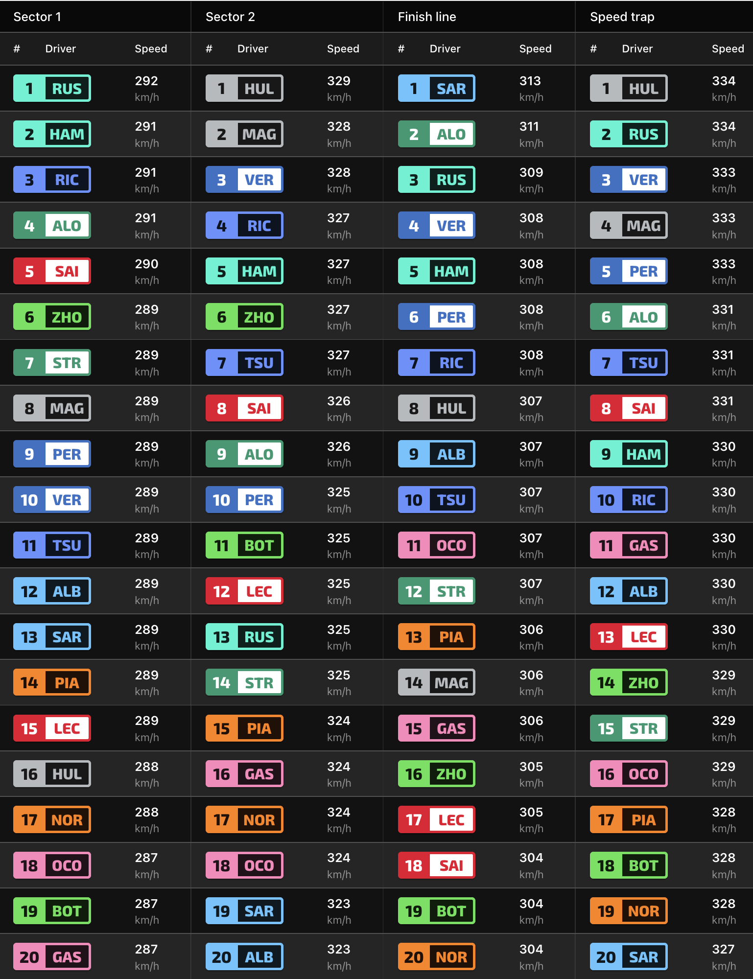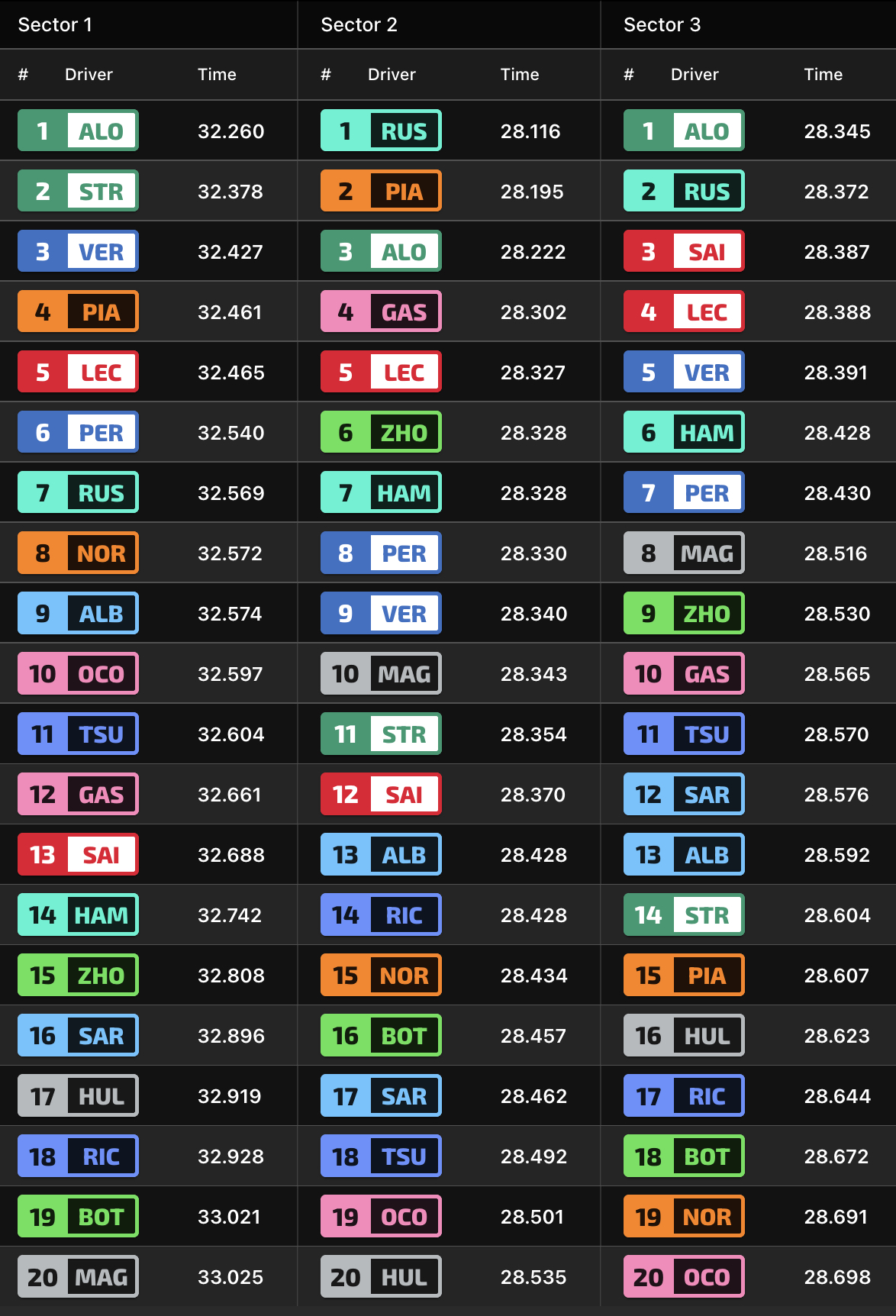 Πιο κοντά από όλους βρέθηκε George Russell με τη Mercedes, που κατέλαβε τη 2η θέση του πίνακα των χρόνων, καθώς κατάφερε στο τέλος των γύρων με ελαφρύ φορτίο καυσίμου να πλησιάσει τον πολύπειρο Ισπανό στα 0,23 δλ. Στην 3η θέση βρέθηκε ο Max Verstappen με τη Red Bull ο οποίος κατάφερε να βελτιώσει στη δεύτερη γρήγορη προσπάθειά του, αλλά όχι να πλησιάσει πιο κοντά από τα 0,33 δλ. τον Alonso. Ωστόσο, ο ρυθμός του Ολλανδού στις προσομοιώσεις αγώνα ήταν εξαιρετικός, καθώς ήταν ο μοναδικός οδηγός που κατάφερε να πέσει κάτω από το 1:34 στις μεγάλες ακολουθίες γύρων με τη μέση γόμα.