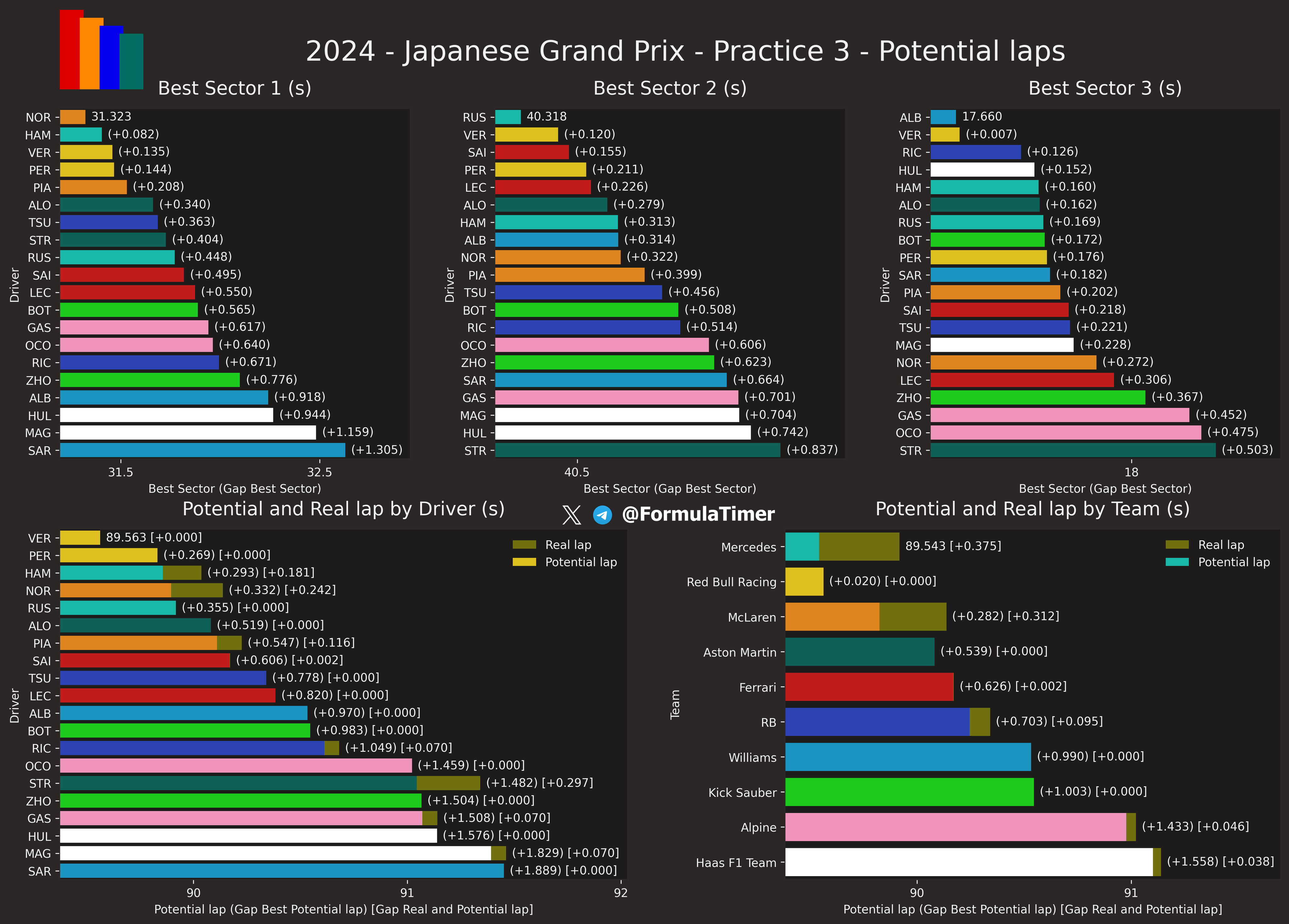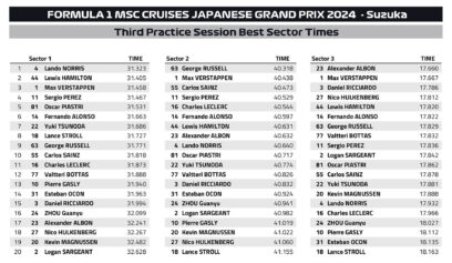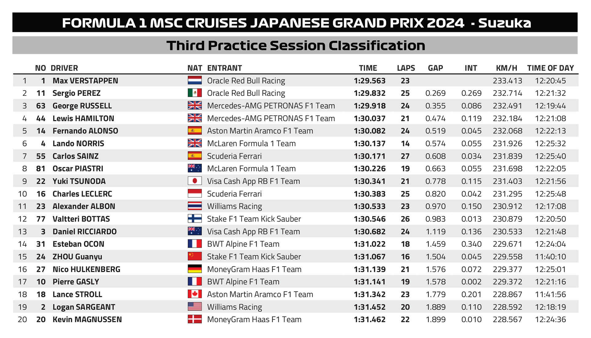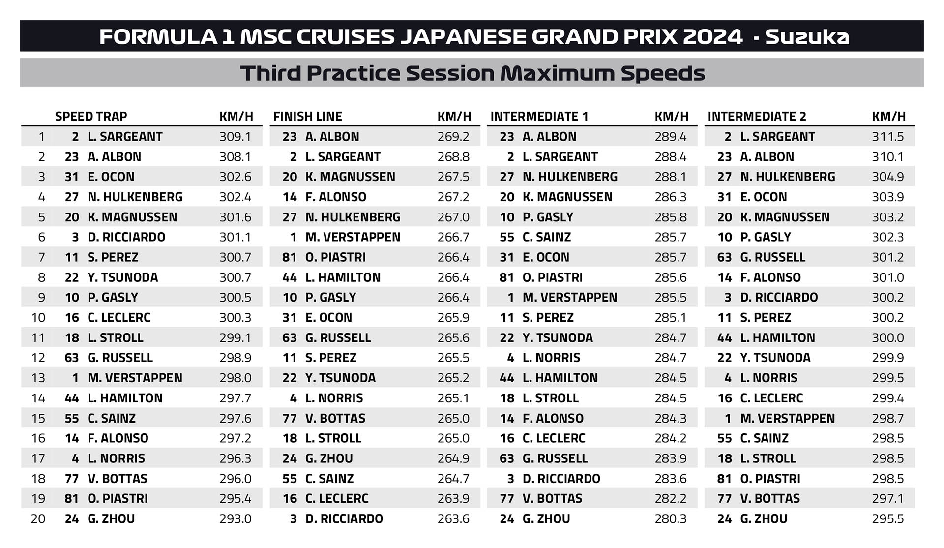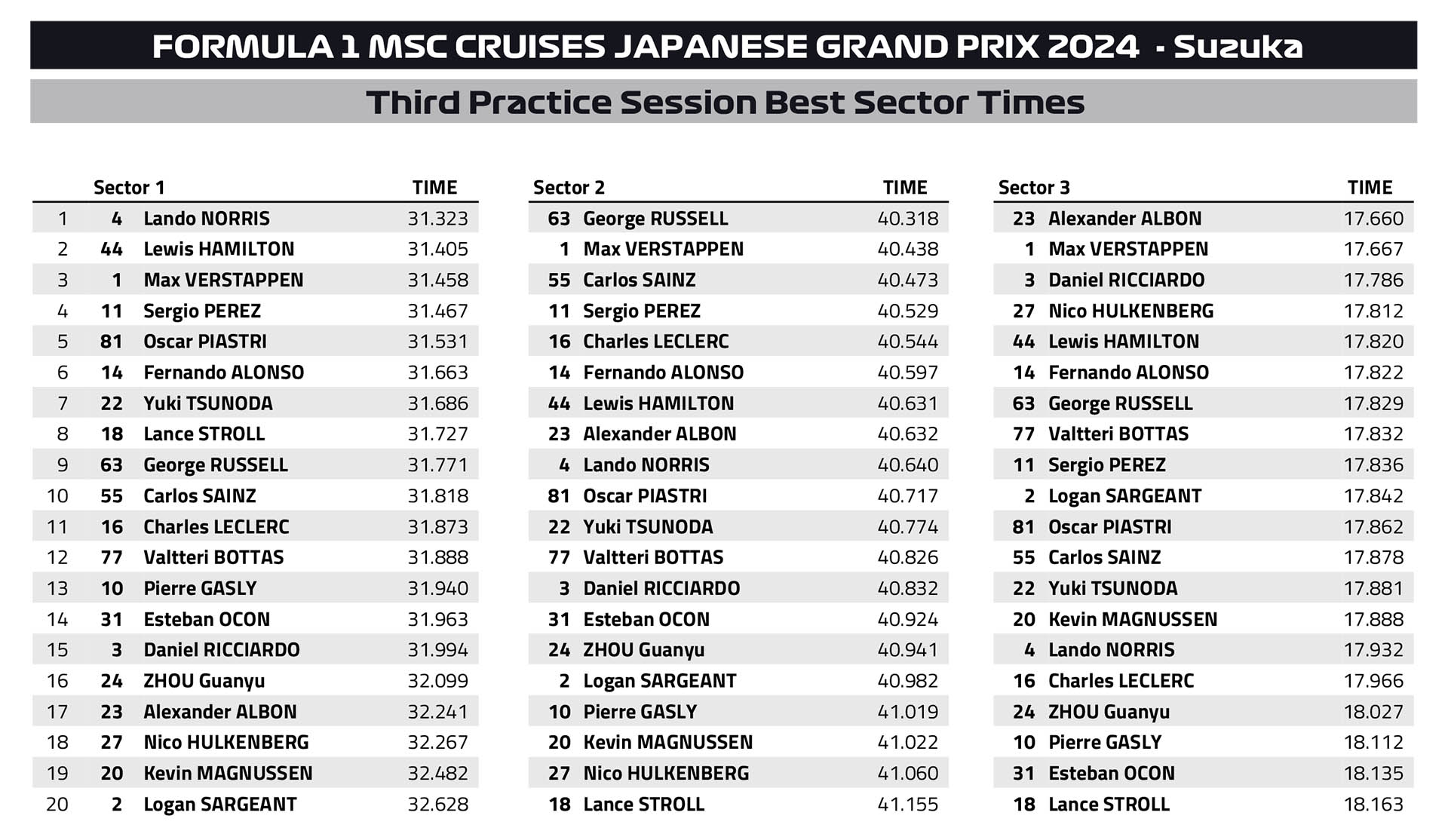 Ο Fernando Alonso κατετάγη 5ος στον πίνακα των χρόνων, καθώς εφαρμόστηκαν και στο δικό του μονοθέσιο οι εκτεταμένες αναβαθμίσεις που παρουσίασε στη Suzuka η Aston Martin. Ο Lando Norris βρέθηκε στην 6η θέση, αλλά ίσως είχε τη δυνατότητα να αντλήσει κάτι παραπάνω από τη McLaren. O Βρετανός είχε ξεκινήσει έναν καλό γύρο με τη μαλακή γόμα στα τελικά στάδια της διαδικασίας, σημειώνοντας τον ταχύτερο χρόνο στο πρώτο sector, αλλά βγήκε εκτός ορίων πίστας στην έξοδο της 2ης Degner. Όταν σημείωσε τον ταχύτερο χρόνο του, τα ελαστικά δε βρίσκονταν στην ιδανική τους κατάσταση.