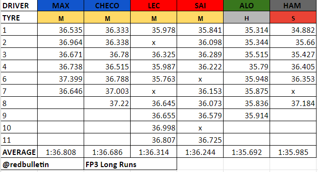 Ωστόσο, οι ομάδες έδωσαν προτεραιότητα αυτή τη φορά στις προσομοιώσεις αγώνα τις οποίες δεν είχαν την ευκαιρία να πραγματοποιήσουν στο FP2. O Max Verstappen σημείωσε -όπως και στο FP1– τον ταχύτερο χρόνο της διαδικασίας, όντας 0,27 δλ. ταχύτερος από τον team-mate του στη Red Bull, Sergio Perez.