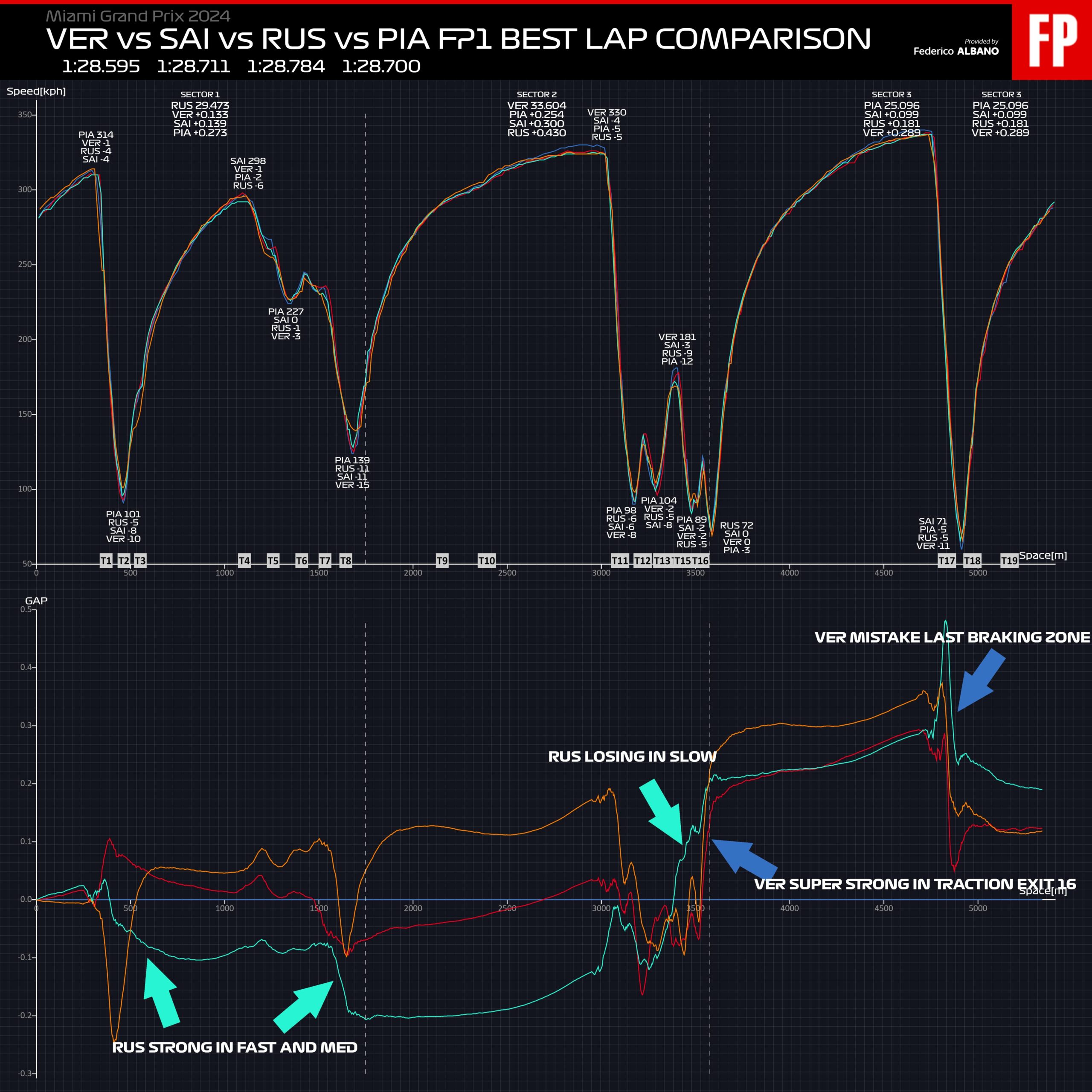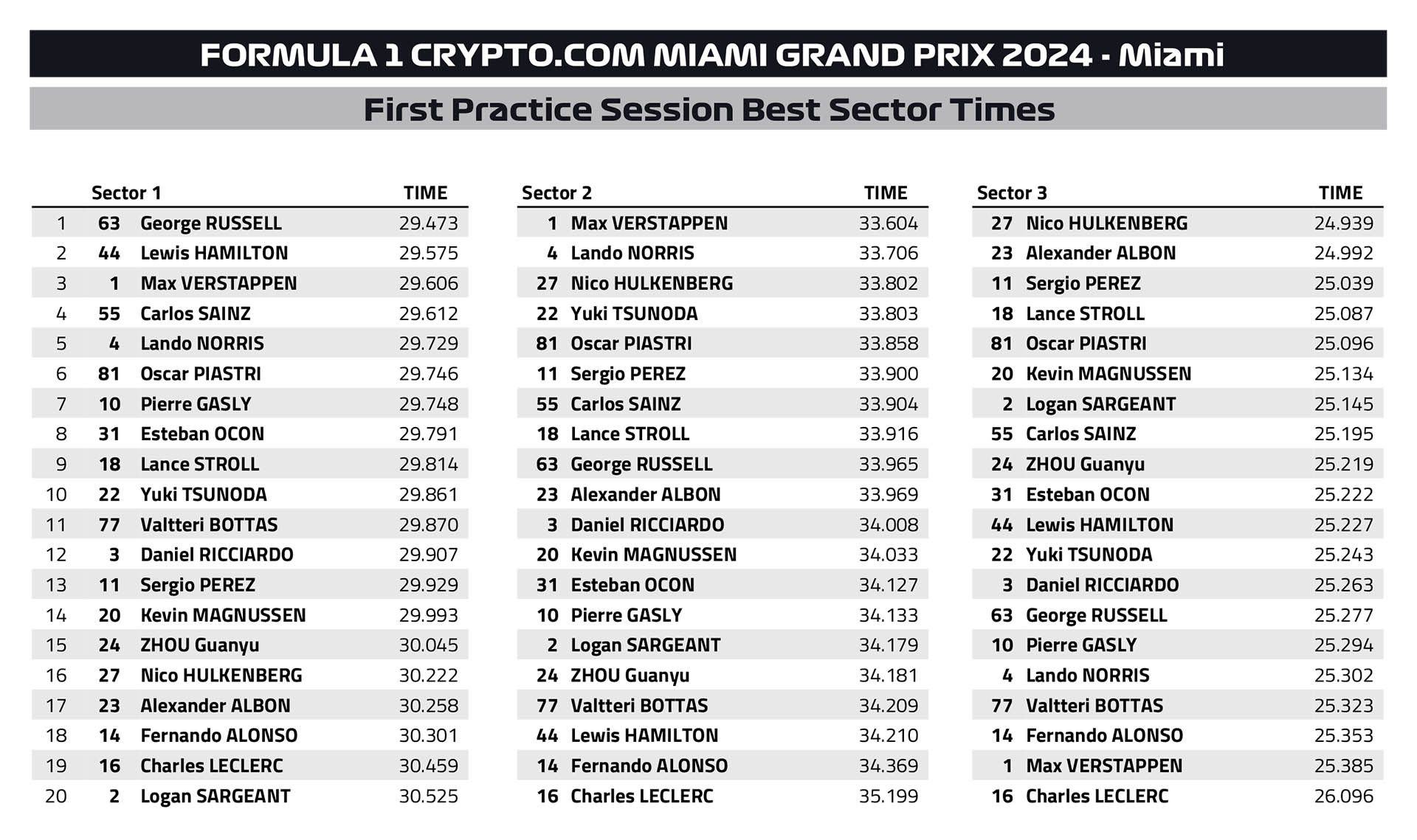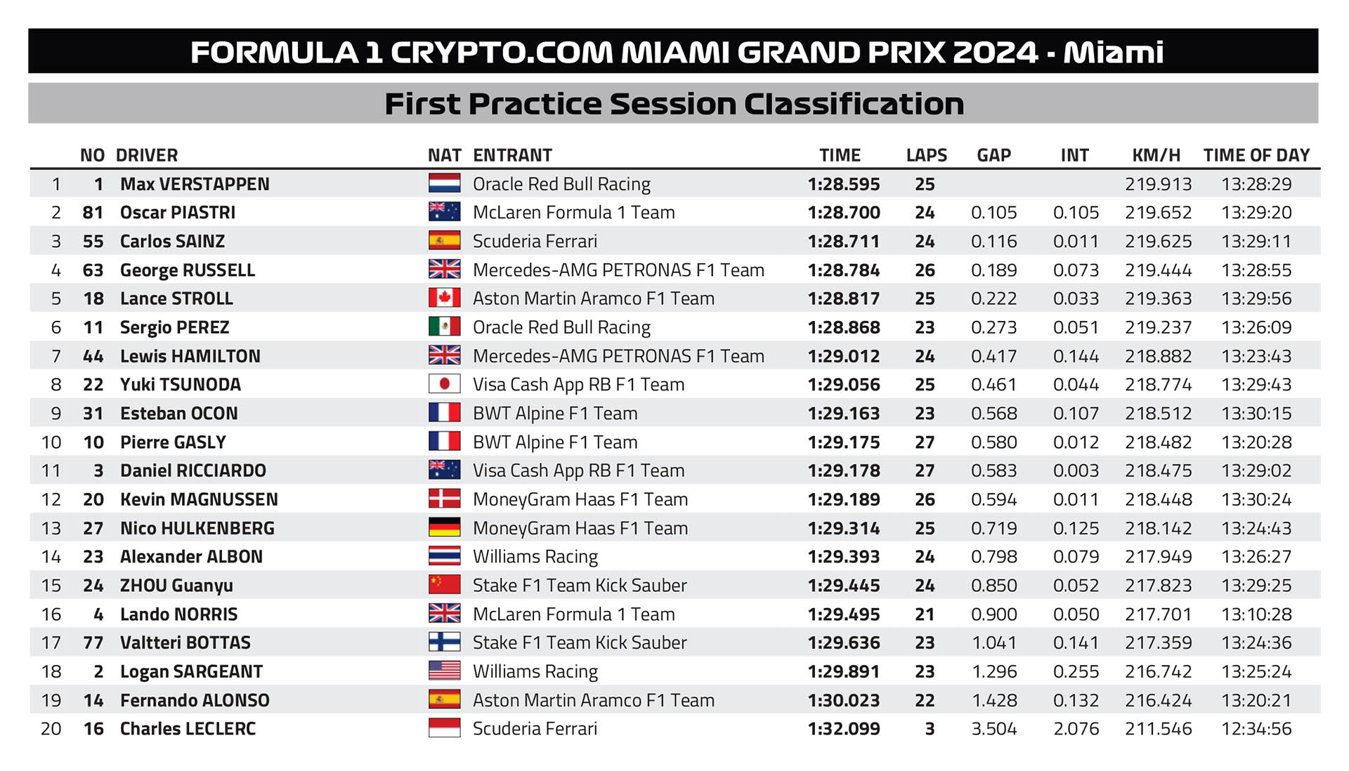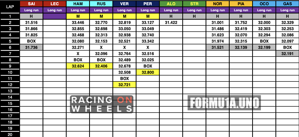 Ο Oscar Piastri βρέθηκε στη 2η θέση του πίνακα των χρόνων, έχοντας μόνο το μισό από το μεγάλο πακέτο αναβαθμίσεων που παρουσίασε για αυτό τον αγώνα η McLaren, για το οποίο μπορείτε να διαβάσετε παρακάτω. Στην 3η θέση κατετάγη ο Carlos Sainz με τη Ferrari, μόλις 0,011 δλ. πίσω από τον νεαρό Αυστραλό.