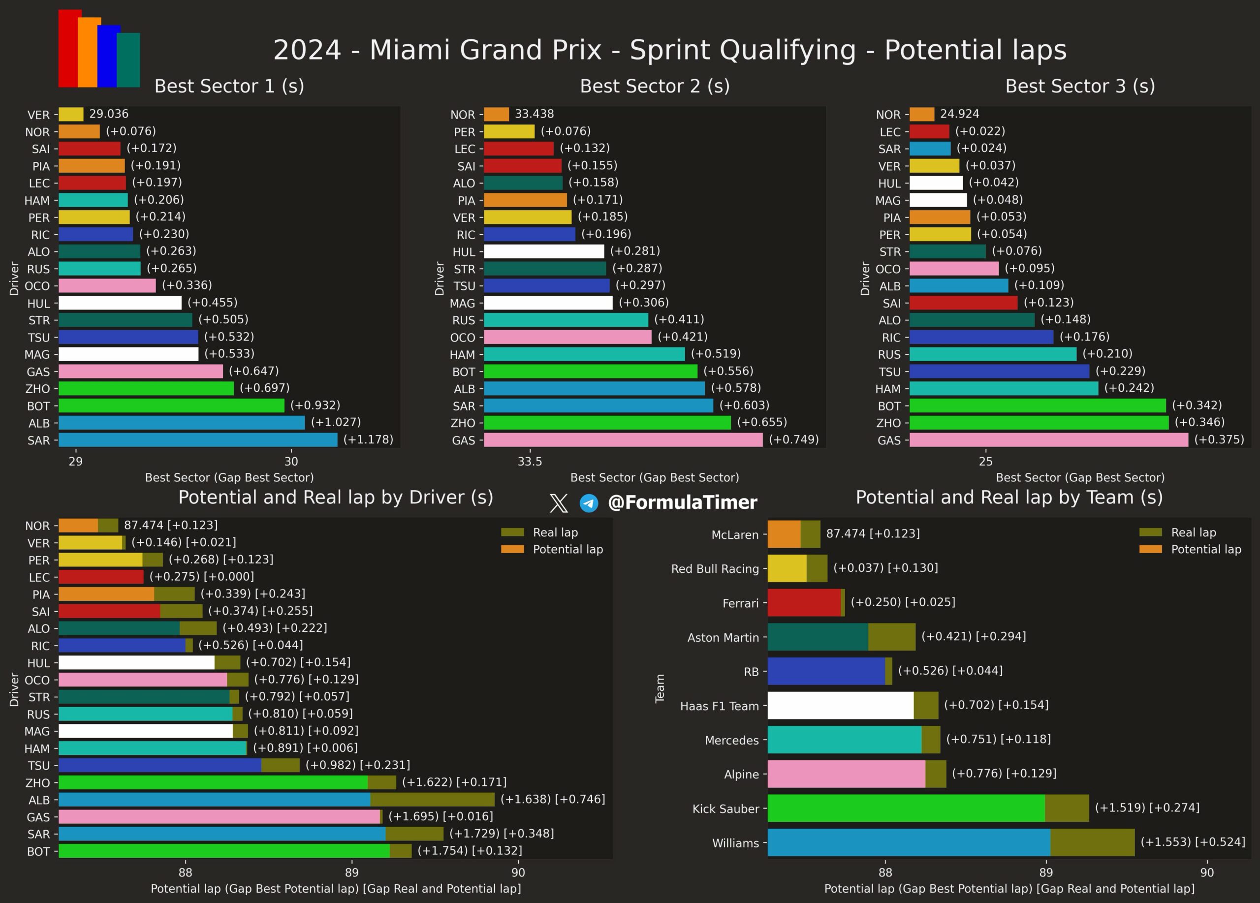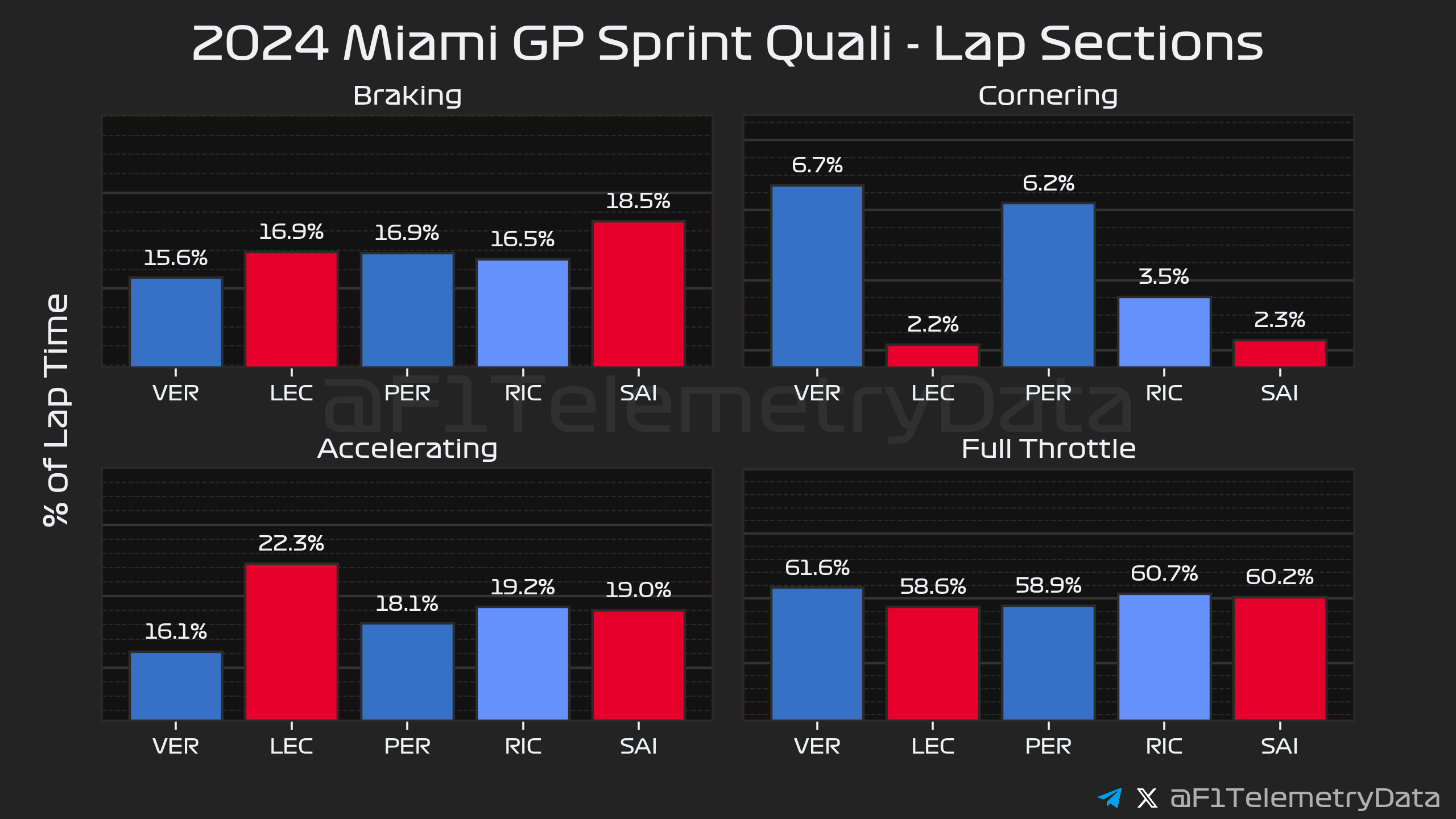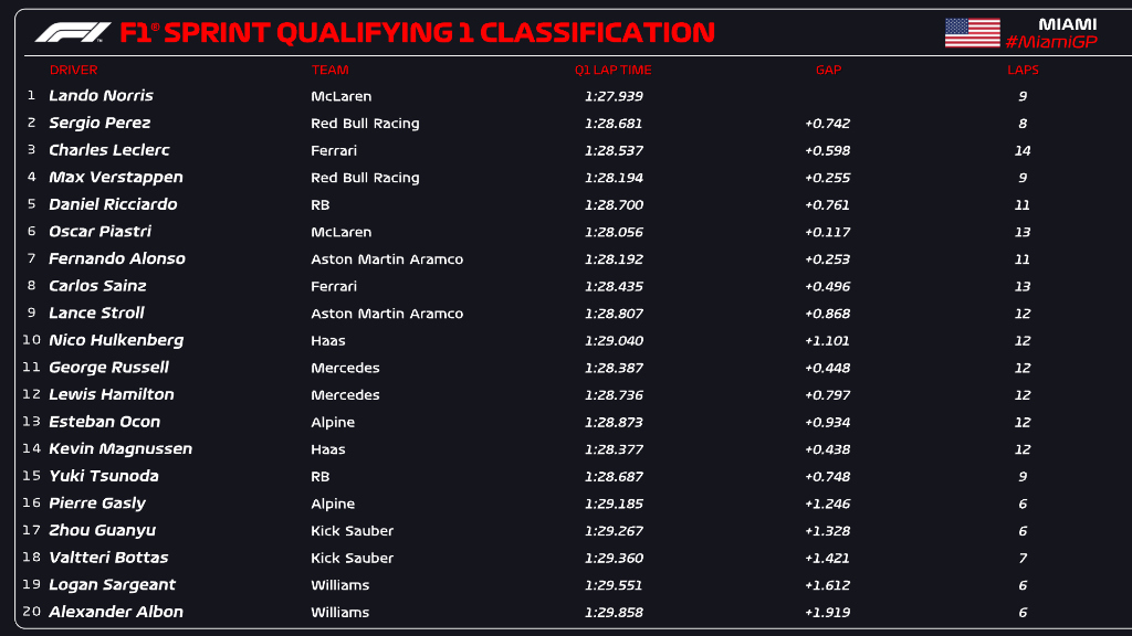 Στην 3η θέση θα παραταχθεί στην εκκίνηση του σπριντ ο Sergio Perez με τη δεύτερη Red Bull, έχοντας γράψει χρόνο 0,235 δλ. μακριά από την κορυφή. Τη μεγάλη έκπληξη έκανε με μία εντυπωσιακή επίδοση ο Daniel Ricciardo, ο οποίος με το μονοθέσιο της Racing Bulls ανέβηκε στην 4η θέση, εμπρός από τον Carlos Sainz με τη δεύτερη Ferrari. Ο Ισπανός είχε αναγκαστεί να ανοίξει πολύ τη γραμμή του στη στροφή 17, χάνοντας χρόνο, καθώς δυσκολεύτηκε να βρει πρόσφυση στις κατατακτήριες δοκιμές του σπριντ, σε αντίθεση με το FP1.