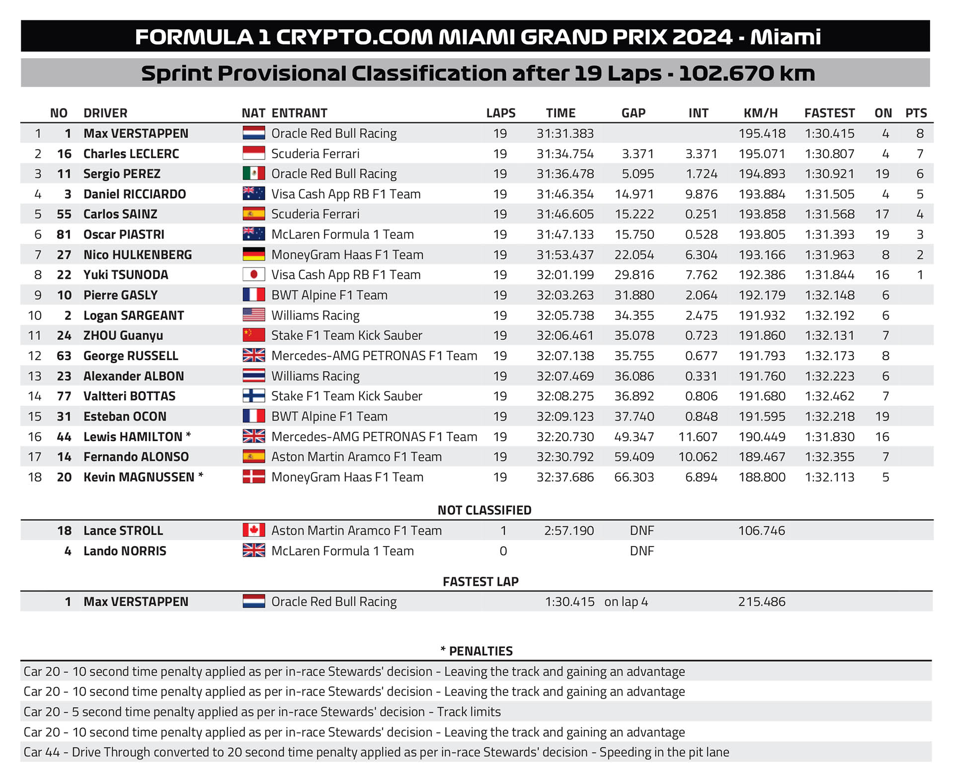 Ωστόσο, ο Hamilton δέχθηκε ποινή διέλευσης από το pit lane (20 δλ.), λόγω υπέρβασης του ορίου ταχύτητας σε αυτό κατά τη διάρκεια της περιόδου αυτοκινήτου ασφαλείας και έχασε τον τελικό βαθμό, που πήγε στον Tsunoda.