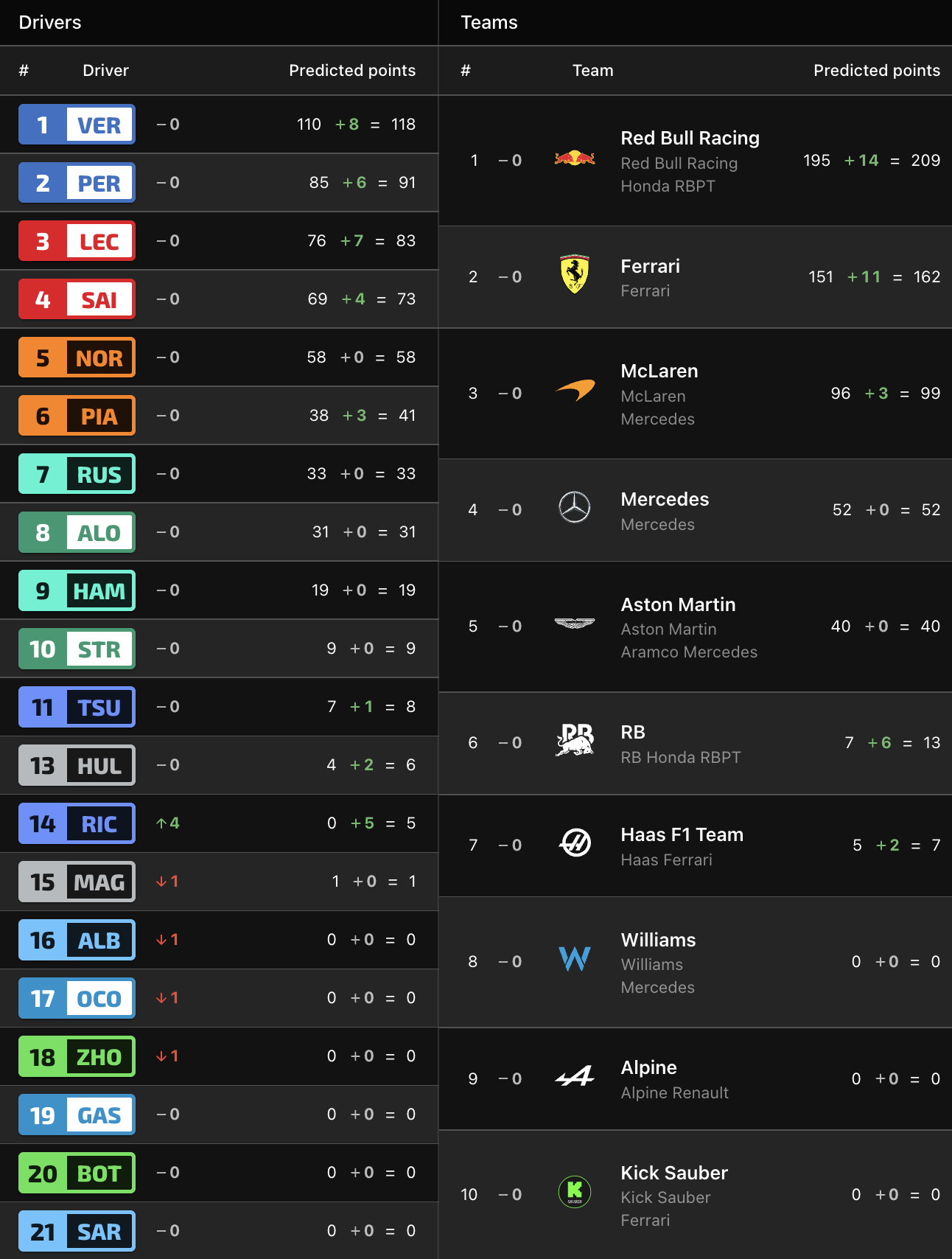 Ο Sergio Perez μπλόκαρε τα φρένα του στην εκκίνηση και έχασε την 3η θέση από τον Daniel Ricciardo, αλλά κατάφερε να την ανακτήσει μόλις ενεργοποιήθηκε το DRS και έπειτα είχε ένα μοναχικό αγώνα έως τον τερματισμό. Αυτός που έκλεψε την παράσταση όμως ήταν ο Ricciardo, ο οποίος με το μονοθέσιο της Racing Bulls κατάφερε να διατηρήσει πίσω του τη Ferrari του Carlos Sainz, παρά τις επανειλημμένες επιθέσεις, κάτι που έκανε ακόμα και τον Ισπανό να συγχαρεί τον αντίπαλό του.