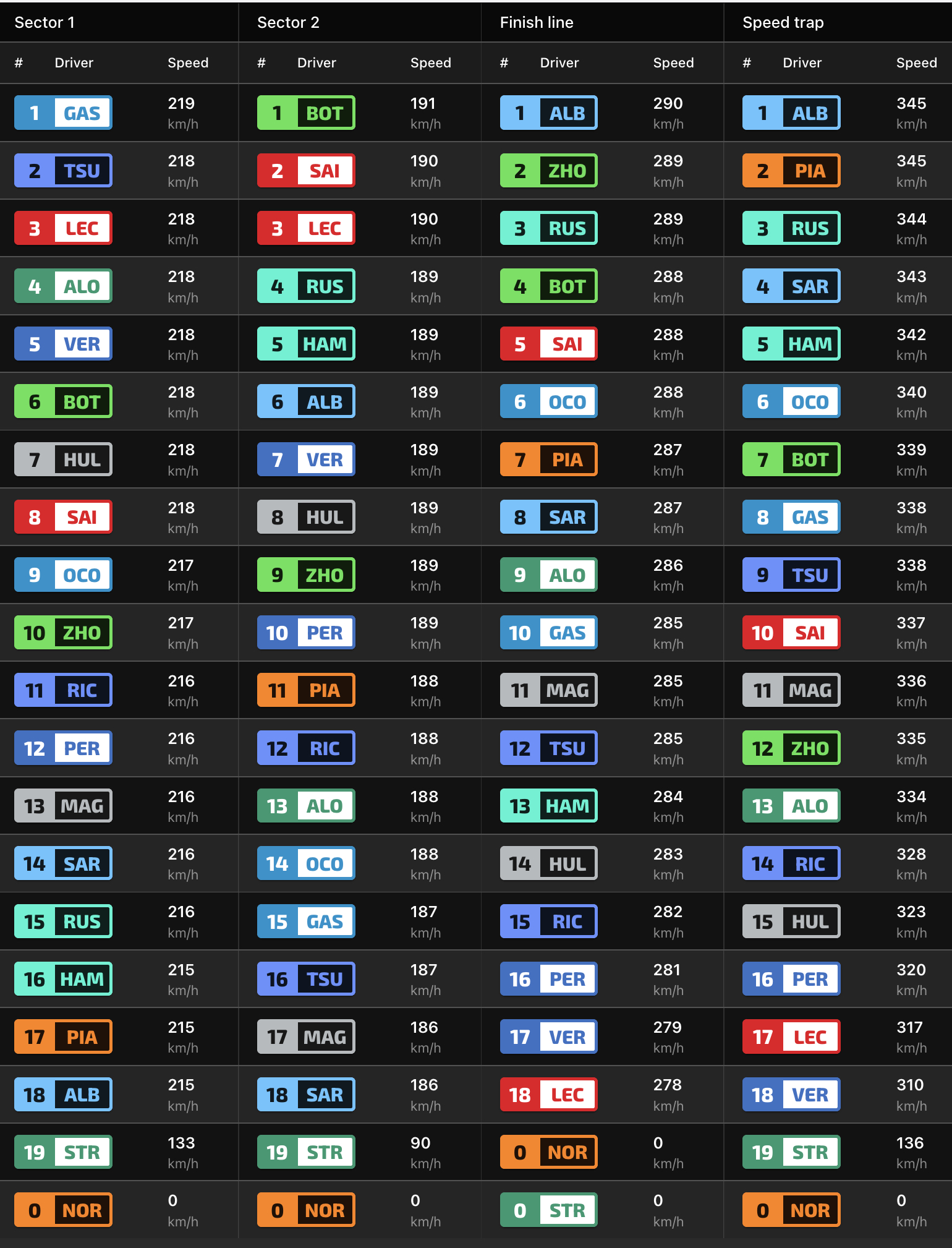 Ο Nico Hulkenberg εξασφάλισε 2 βαθμούς για τη Haas με την 7η θέση, στην οποία είχε βρεθεί έπειτα από το ατύχημα της πρώτης στροφής του σπριντ, που έθεσε εκτός μάχης τις Aston Martin και τον Lando Norris, έπειτα από μία υπεραισιόδοξη «βουτιά» του Lewis Hamilton στην εσωτερική, για την οποία οι αγωνοδίκες αποφάσισαν να μην του επιρρίψουν ευθύνες.