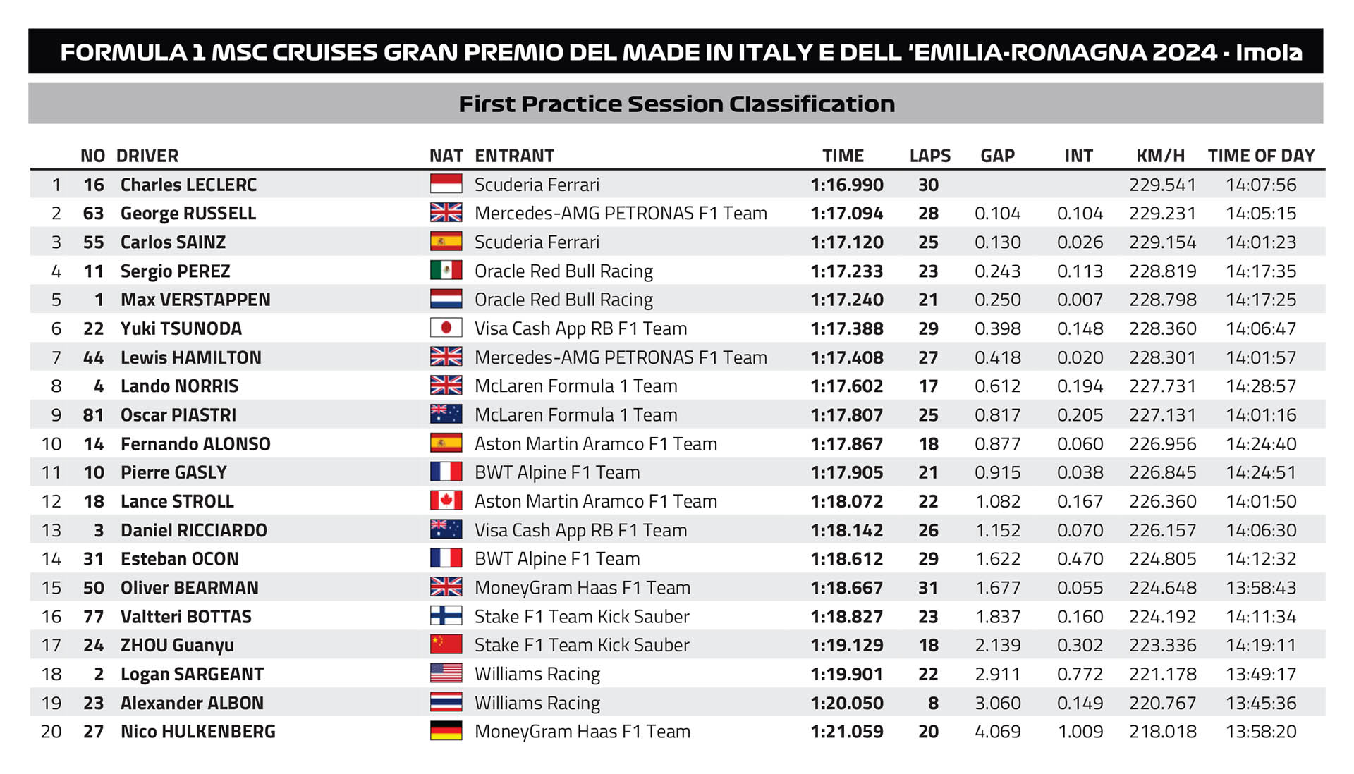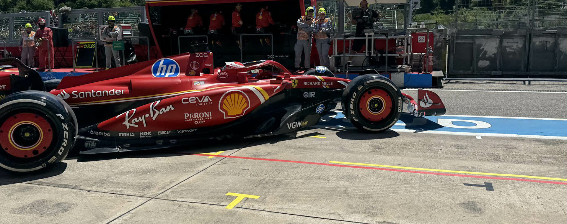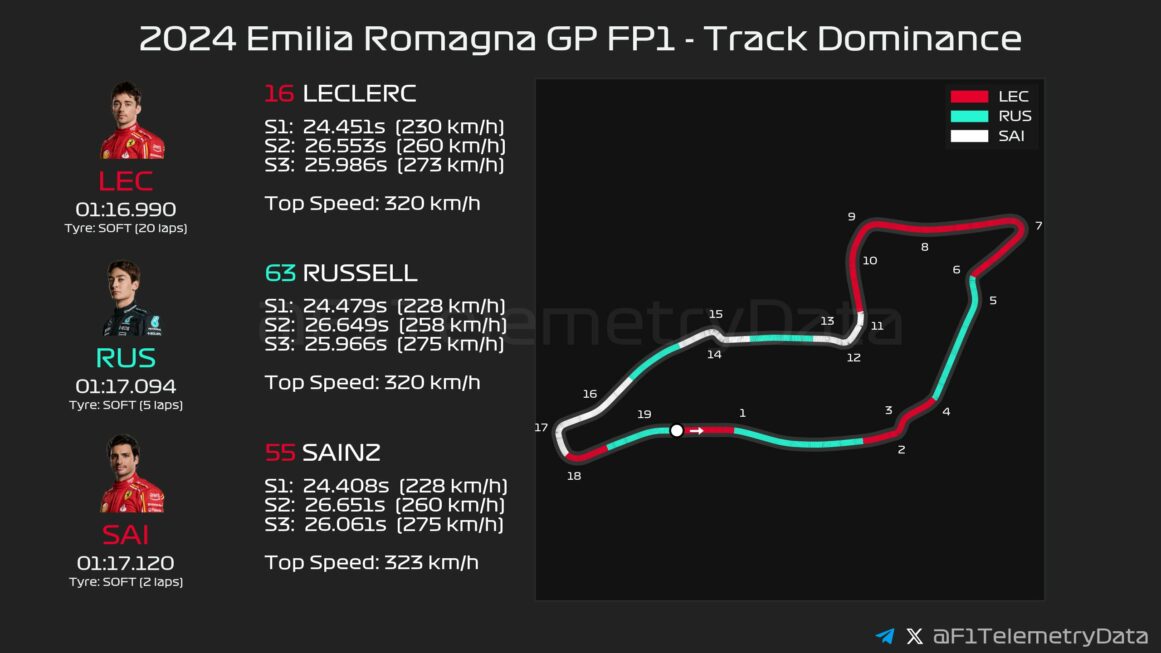 Ο Charles Leclerc, με την αναβαθμισμένη Ferrari και νέο μηχανολόγο αγώνα, σημείωσε τον ταχύτερο χρόνο στην εναρκτήρια περίοδο ελεύθερων δοκιμών του GP Εμίλια Ρομάνια, τον 7ο γύρο του φετινού Πρωταθλήματος της Formula 1, σε αρκετά υψηλές θερμοκρασίες. Ο Μονεγάσκος οδηγός της Scuderia ήταν 0,1 δλ. ταχύτερος από τον George Russell με τη Mercedes, ενώ την πρώτη τριάδα συμπλήρωσε ο έτερος οδηγός της Ferrari, ο Carlos Sainz, 0,13 δλ. μακριά από την κορυφή.