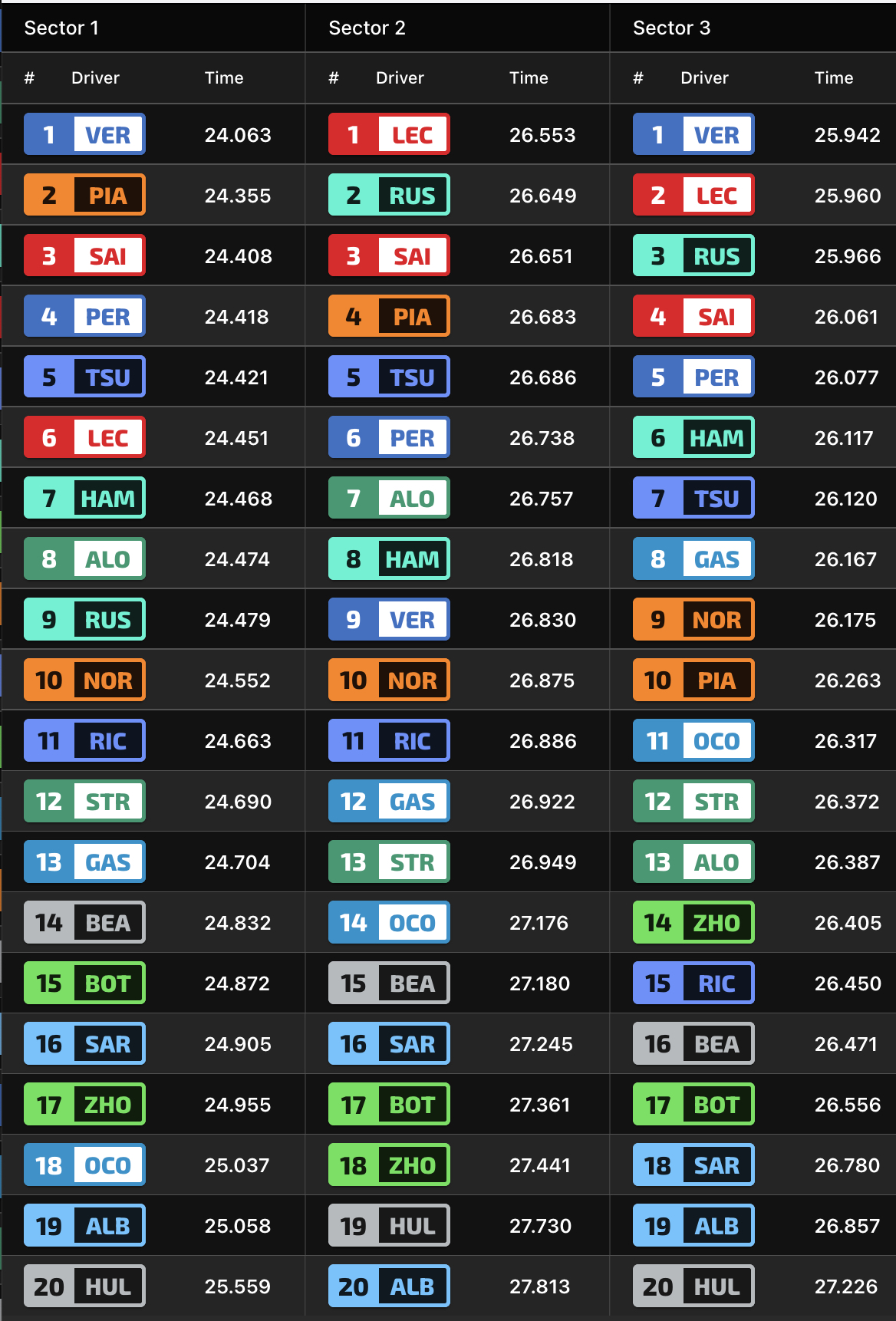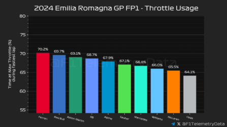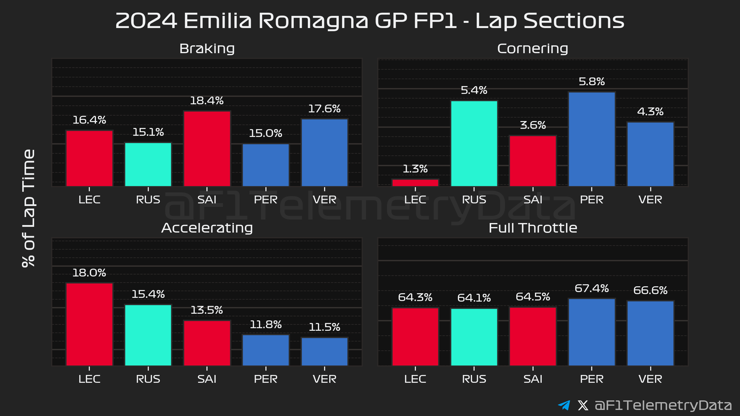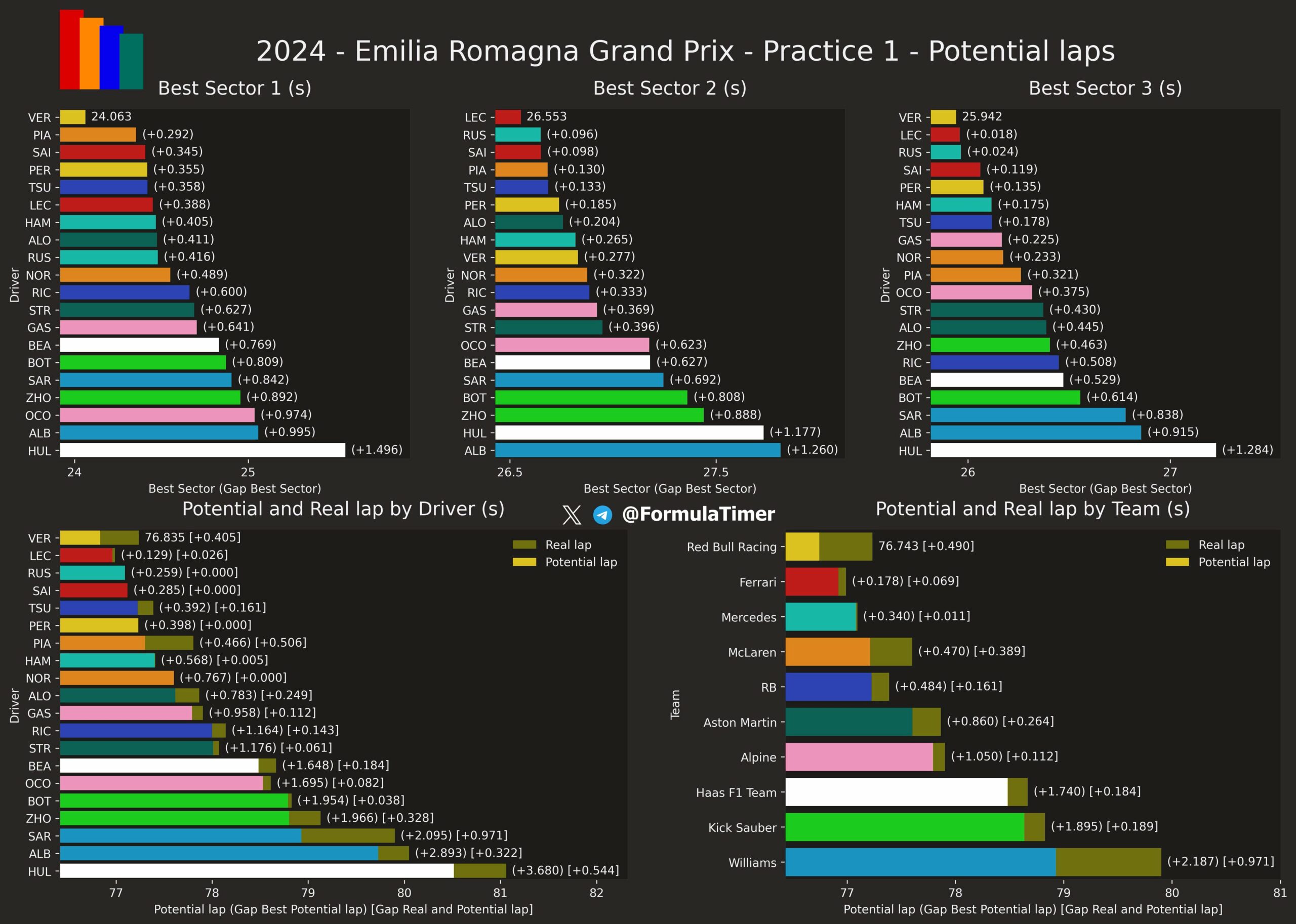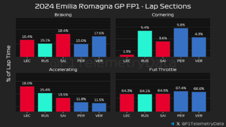 Η Red Bull έδειχνε να αντιμετωπίζει δυσκολίες, με τους δύο οδηγούς της στην 4η και 5η θέση, αλλά 0,25 δλ. μακριά από την κορυφή. Μάλιστα, ο Sergio Perez ήταν 0,007 δλ. ταχύτερος από τον Max Verstappen, ο οποίος είχε πολλά παράπονα από τη συμπεριφορά της RB20 και είχε αρκετές εξόδους από την πίστα.