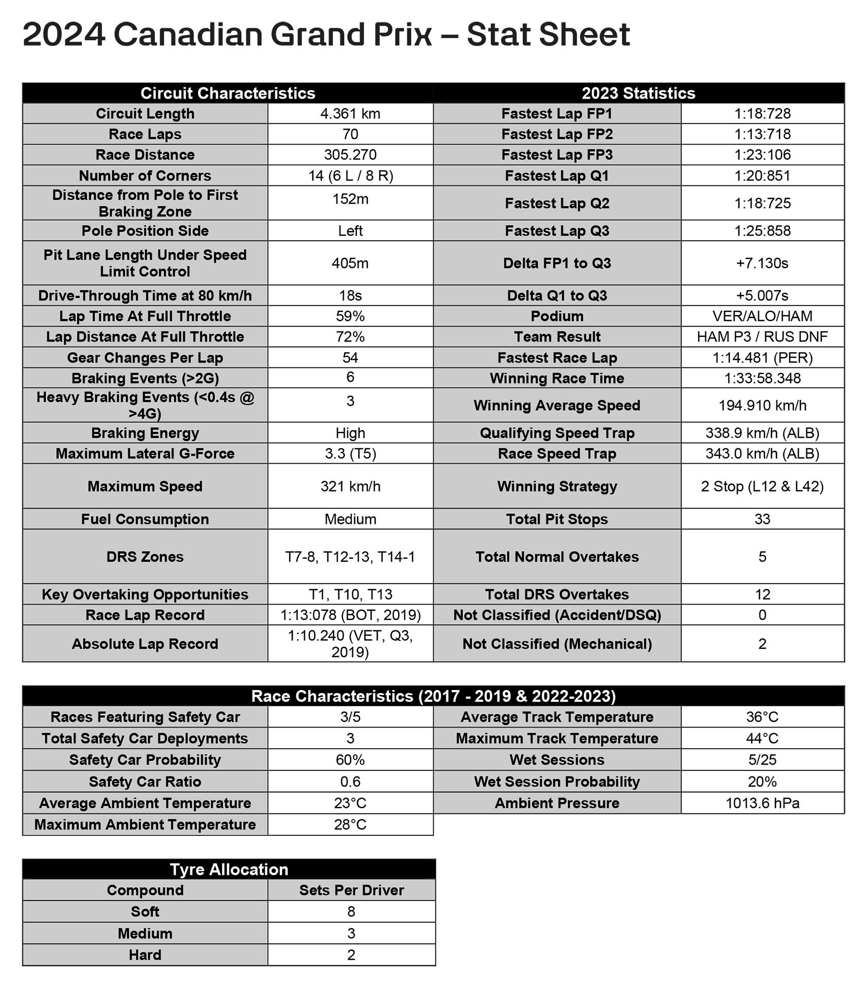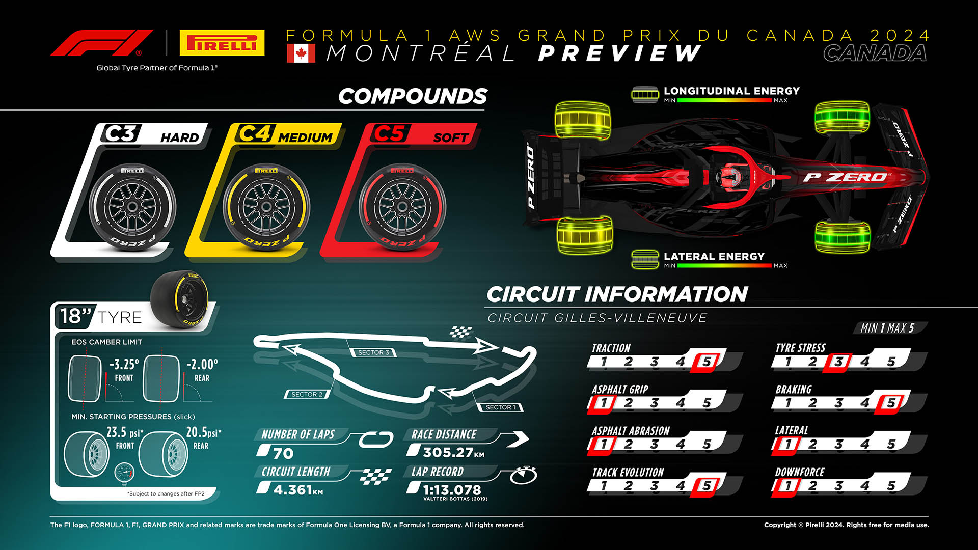 Κρίσιμης σημασίας για την απόδοση στο Μόντρεαλ είναι η σταθερότητα των μονοθεσίων στις ζώνες πέδησης και στην επιτάχυνση από τις αργές στροφές. Φέτος, η πίστα του Μόντρεαλ έχει ασφαλτοστρωθεί εκ νέου και έχουν αντικατασταθεί τα kerb. Στα χαρτιά, τα υπάρχοντα χαρακτηριστικά της πίστας, δηλαδή η μειωμένη τραχύτητα της ασφάλτου και επομένως η χαμηλή πρόσφυση, θα πρέπει να παραμείνουν.