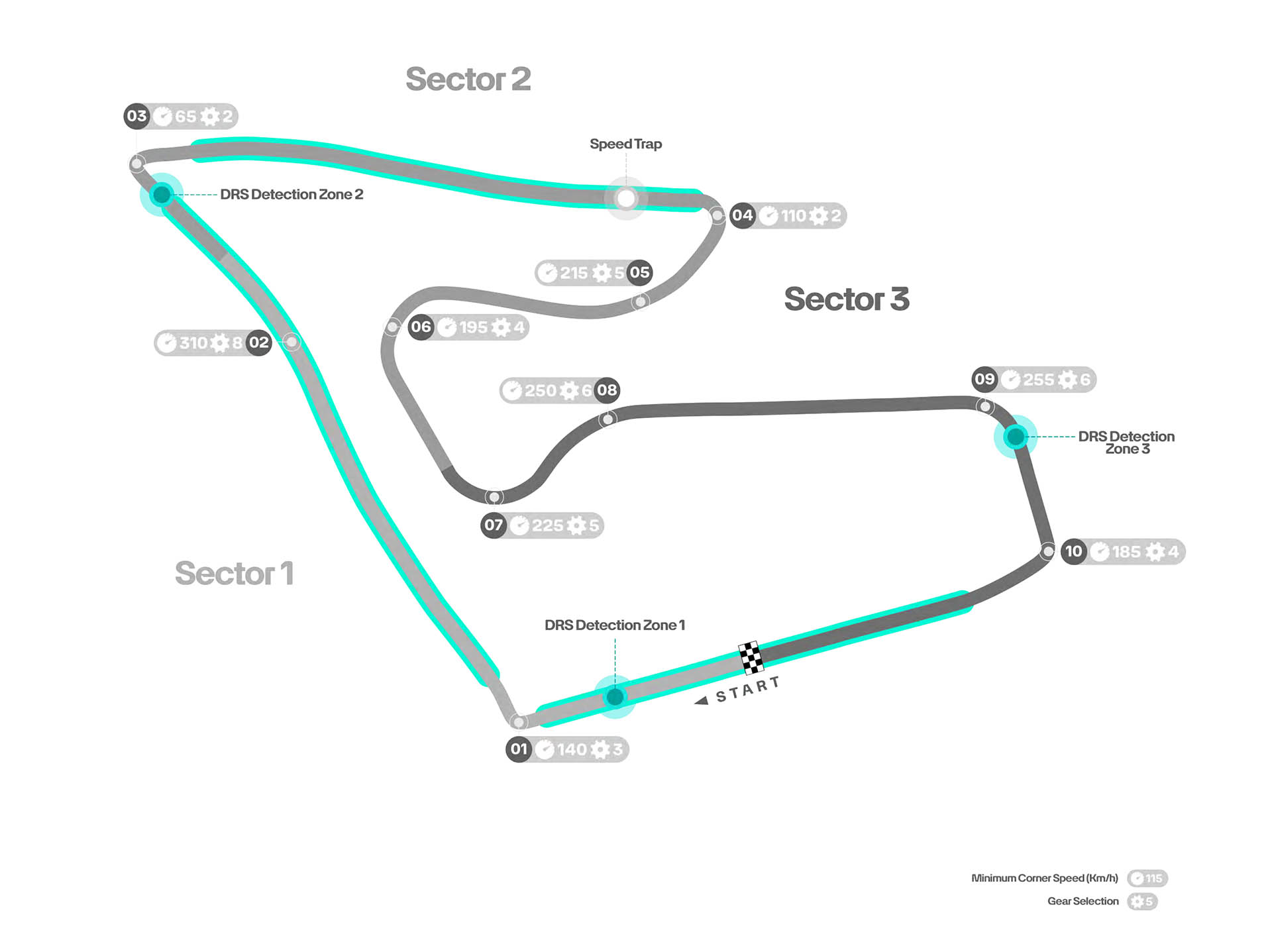 Ζώνες DRS: 3 (μεταξύ στροφών 2-3, 3-4 και 10-1)