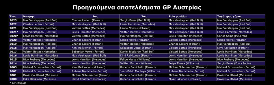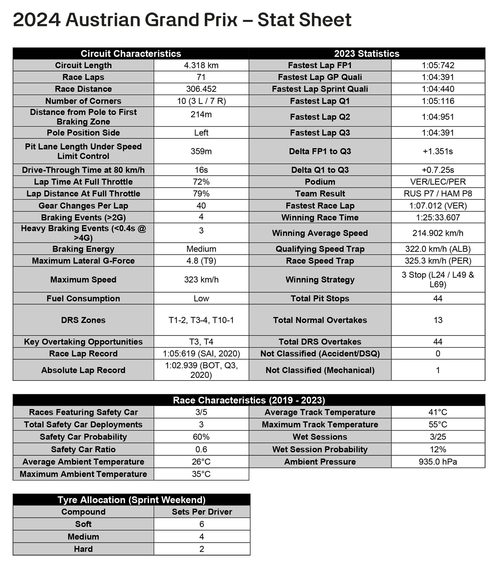 Το δεύτερο από τα τρία διαδοχικά αγωνιστικά τριήμερα της Formula 1 στην Ευρώπη, το Grand Prix Αυστρίας, αποτελεί τον 11ο γύρο της φετινής σεζόν και διεξάγεται στην «έδρα» της Red Bull, την πίστα του Red Bull Ring στα ορεινά δάση του Spielberg της Στυρίας. Θα είναι ο τρίτος φετινός αγώνας που έχει παρουσιάζει σπριντ στο πρόγραμμά του το Σάββατο, και μόνο μία περίοδο ελεύθερων δοκιμών την Παρασκευή.