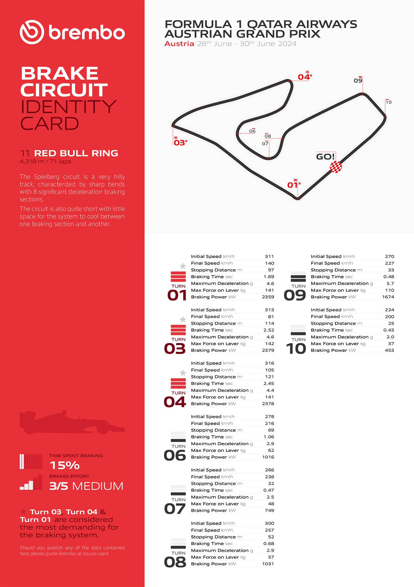 Ωστόσο, οι απαιτήσεις στον τομέα απαγωγής θερμότητας από τον κινητήρα δεν είναι τόσο υψηλές όσο στις άλλες πίστες με αυξημένο υψόμετρο (Μεξικό, Βραζιλία). Αλλά λόγω του μικρού γύρου, τα φρένα και το υβριδικό σύστημα δεν προλαβαίνουν να κρυώσουν, για αυτό και οι ομάδες χρησιμοποιούν τους μεγαλύτερους διαθέσιμους αεραγωγούς. Το Red Bull Ring διαθέτει τρεις ζώνες ισχυρής πέδησης, στην προσέγγιση των στροφών 1, 3 και 4 και η καταπόνηση των φρένων είναι λίγο πάνω από το μέσο.