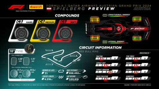 O ασφαλτοτάπητας του Red Bull Ring προσφέρει χαμηλά επίπεδα πρόσφυσης και δεν καταπονεί πολύ τα ελαστικά. Για αυτό η Pirelli θα φέρει τις πιο μαλακές γόμες (C3, C4, C5), με τις κατώτερες πιέσεις να έχουν οριστεί στα 23 psi στα εμπρός ελαστικά και 20 psi σε αυτά του πίσω άξονα, σε θερμοκρασία 70 βαθμών Κελσίου.