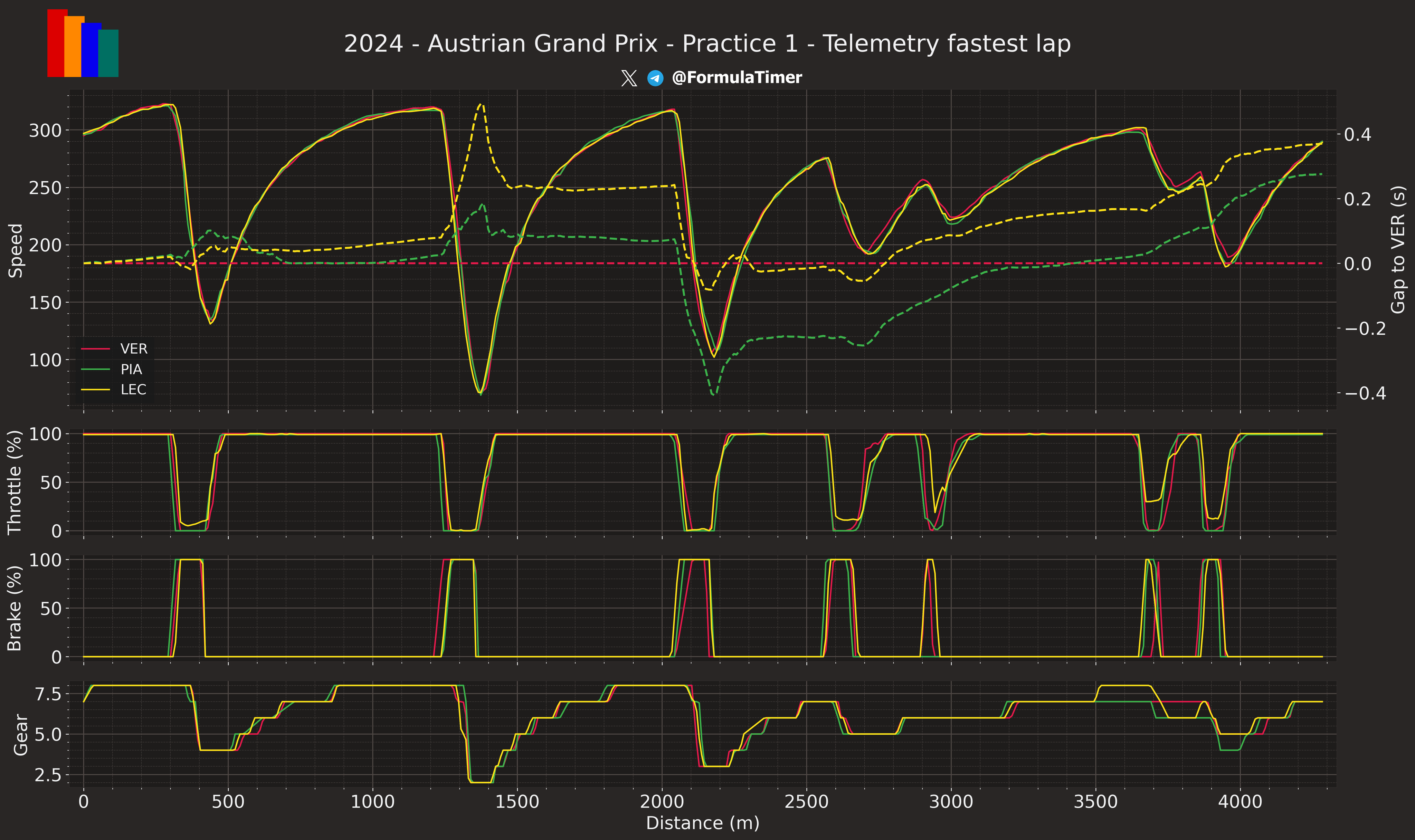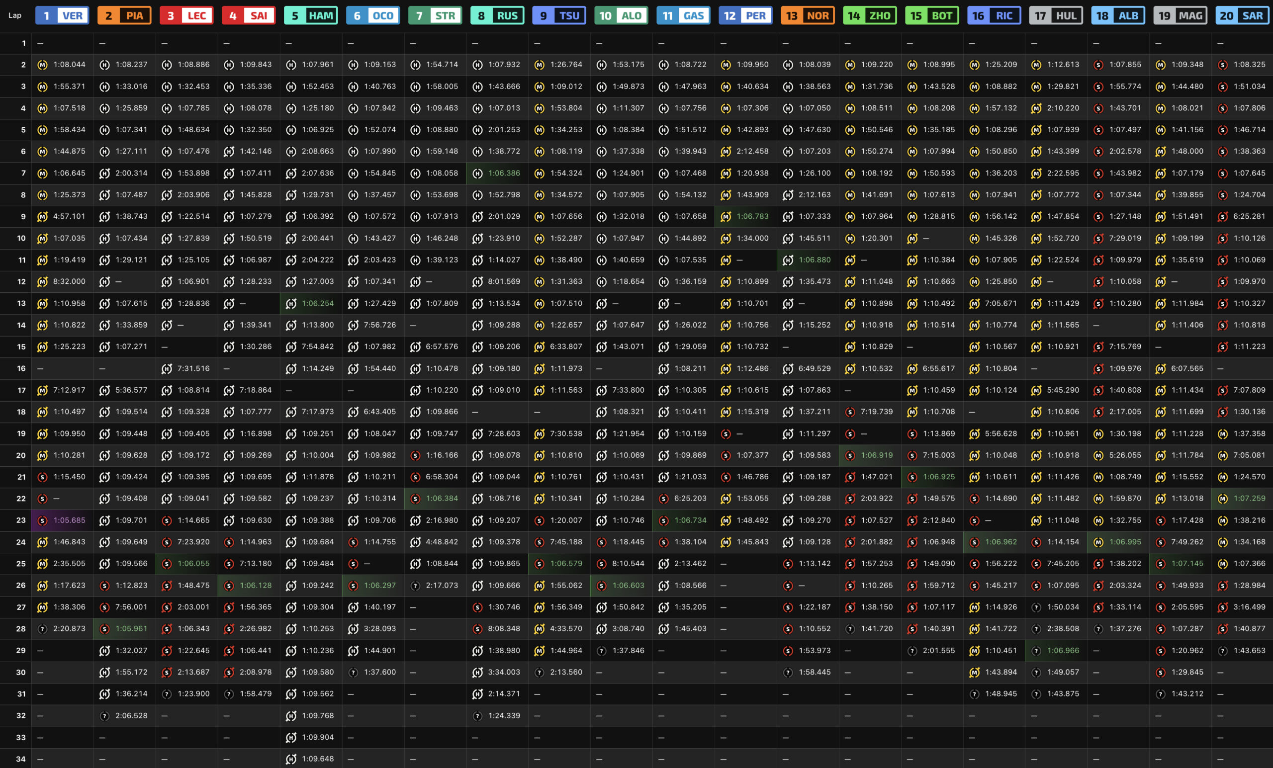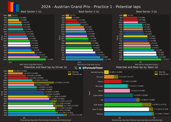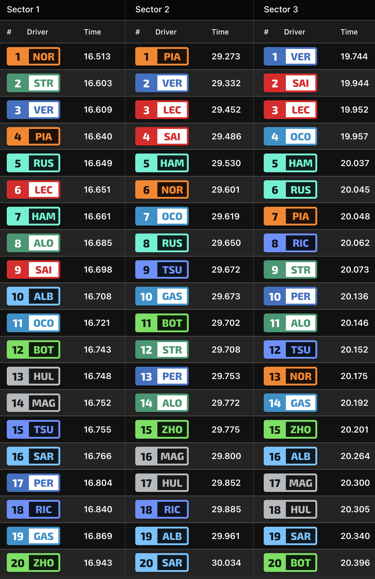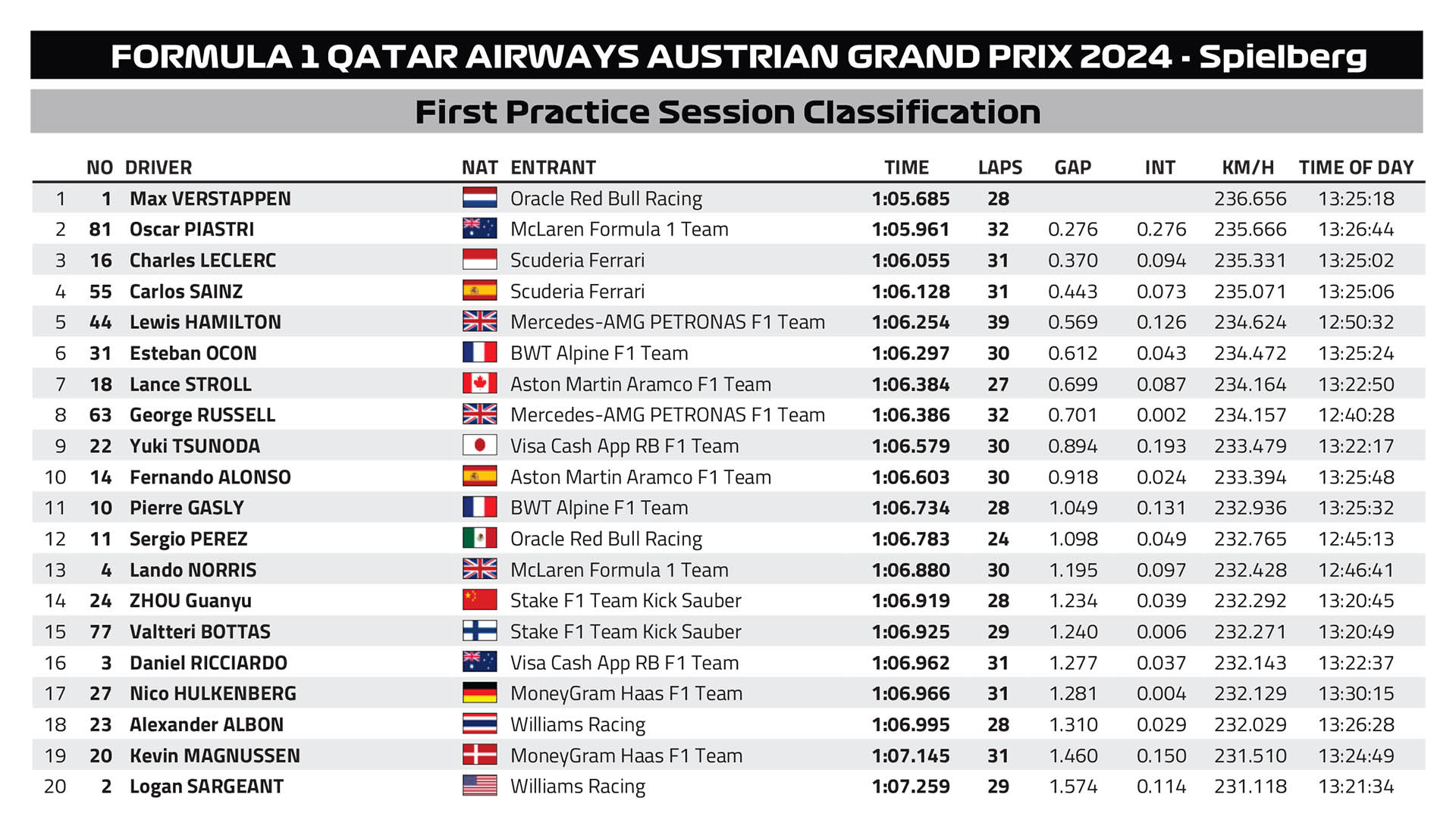 Στη δεύτερη θέση βρέθηκε ο Oscar Piastri με τη McLaren, αλλά ο χρόνος του Αυστραλού απείχε 0,276 από την κορυφαία επίδοση του Verstappen. Ακόμη πιο πίσω βρέθηκαν οι δύο οδηγοί της Ferrari, με τον Charles Leclerc (0,37 δλ. πίσω), να είναι ταχύτερος από τον Carlos Sainz.