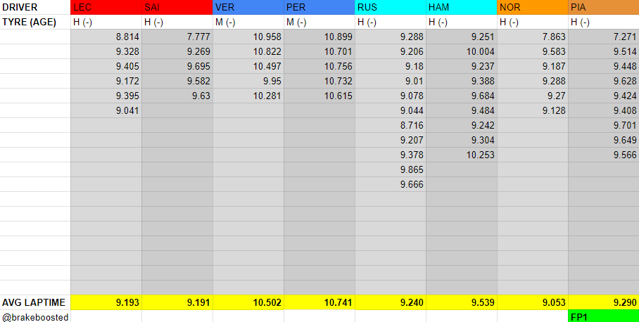 Οι περισσότερες κορυφαίες ομάδες προτίμησαν να «ξεφορτωθούν» ένα σετ σκληρής γόμας ελαστικών, το οποίο δεν θα χρειαστούν το υπόλοιπο τριήμερο, που περιέχει και σπριντ. Η Red Bull ήταν η μοναδική από τις κορυφαίες ομάδες που επέλεξε τη μέση γόμα για να ξεκινήσει το FP1, ίσως για να διαπιστώσει τη συμπεριφορά της πριν από SQ1 και SQ2 των κατατακτήριων δοκιμών του σπριντ, στα οποία είναι υποχρεωτική η χρήση της. Ωστόσο, με αυτό τον τρόπο η Red Bull δεν θα έχει δεύτερο φρέσκο σετ μέσης γόμας για τον αγώνα της Κυριακής.