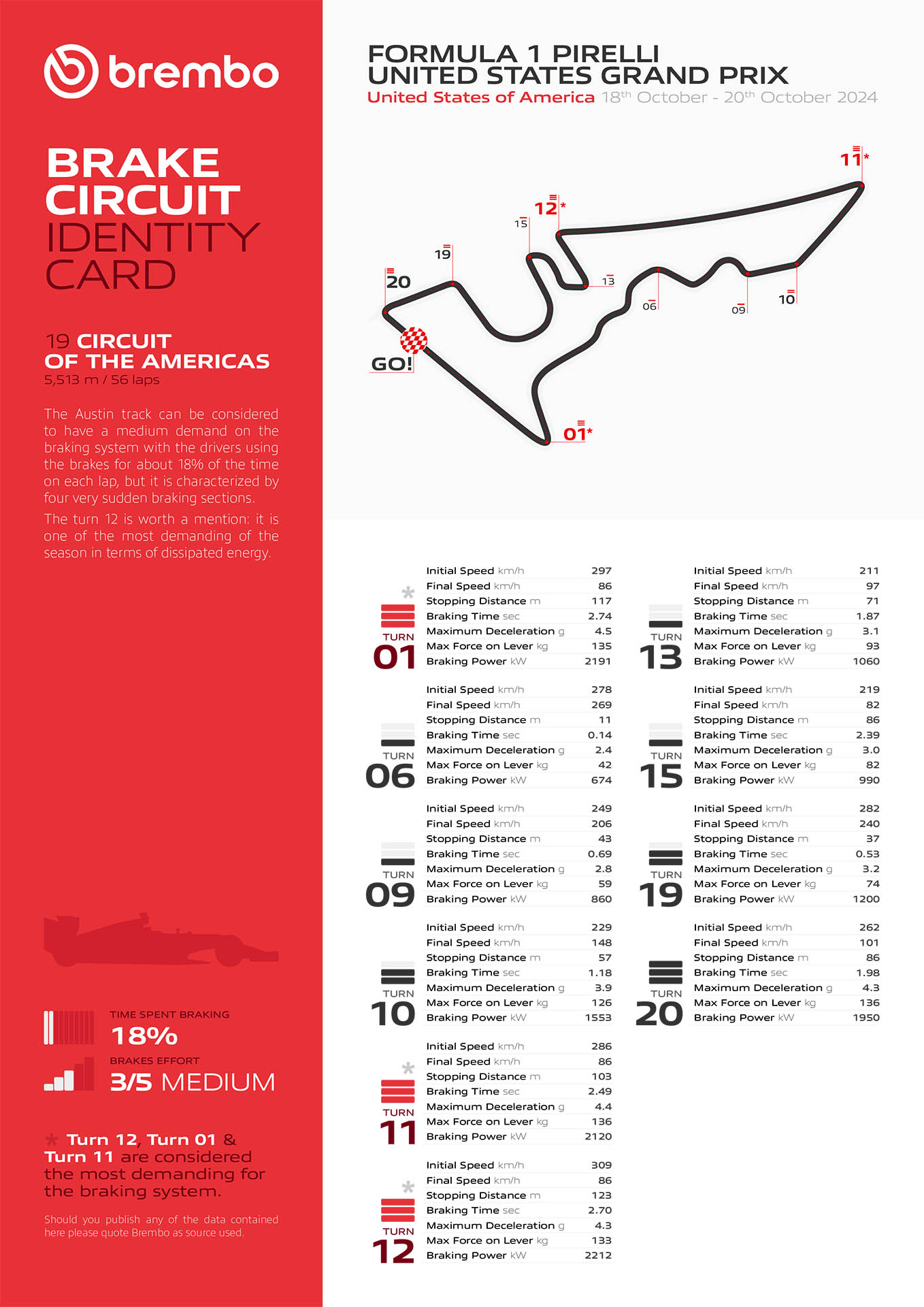 Επίσης, η προσέγγιση για τη στροφή 12 αποτελεί ένα από τα πιο ισχυρά φρεναρίσματα της σεζόν, με 5 G επιβράδυνσης να ασκούνται στο σώμα του οδηγού και το μονοθέσιο. Πολλές από τις στροφές του Austin (όπως οι 1, 11 και 15) έχουν διευρυμένο πλάτος πίστας στην είσοδό τους για να δημιουργούν περισσότερες ευκαιρίες προσπερασμάτων. Στην προσέγγιση της στροφής 15 τα μονοθέσια στρίβουν και φρενάρουν ταυτόχρονα, γεγονός που μπορεί να οδηγήσει σε μπλοκάρισμα των τροχών.