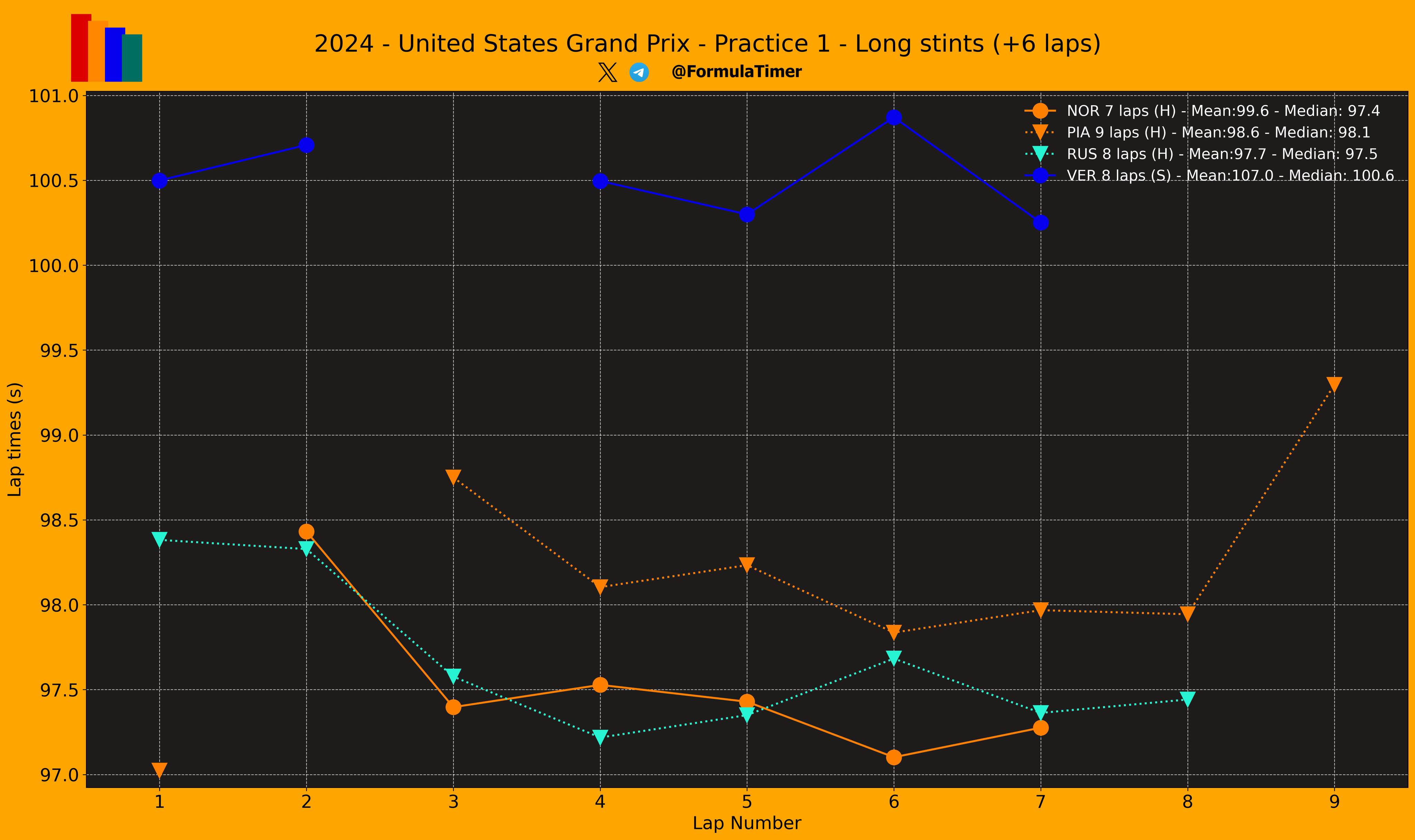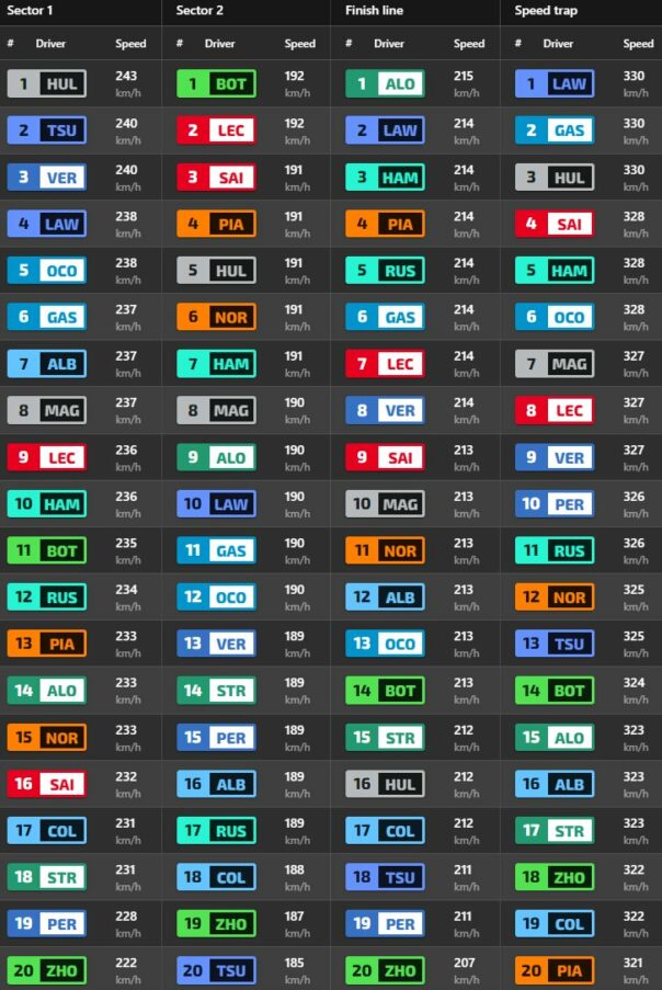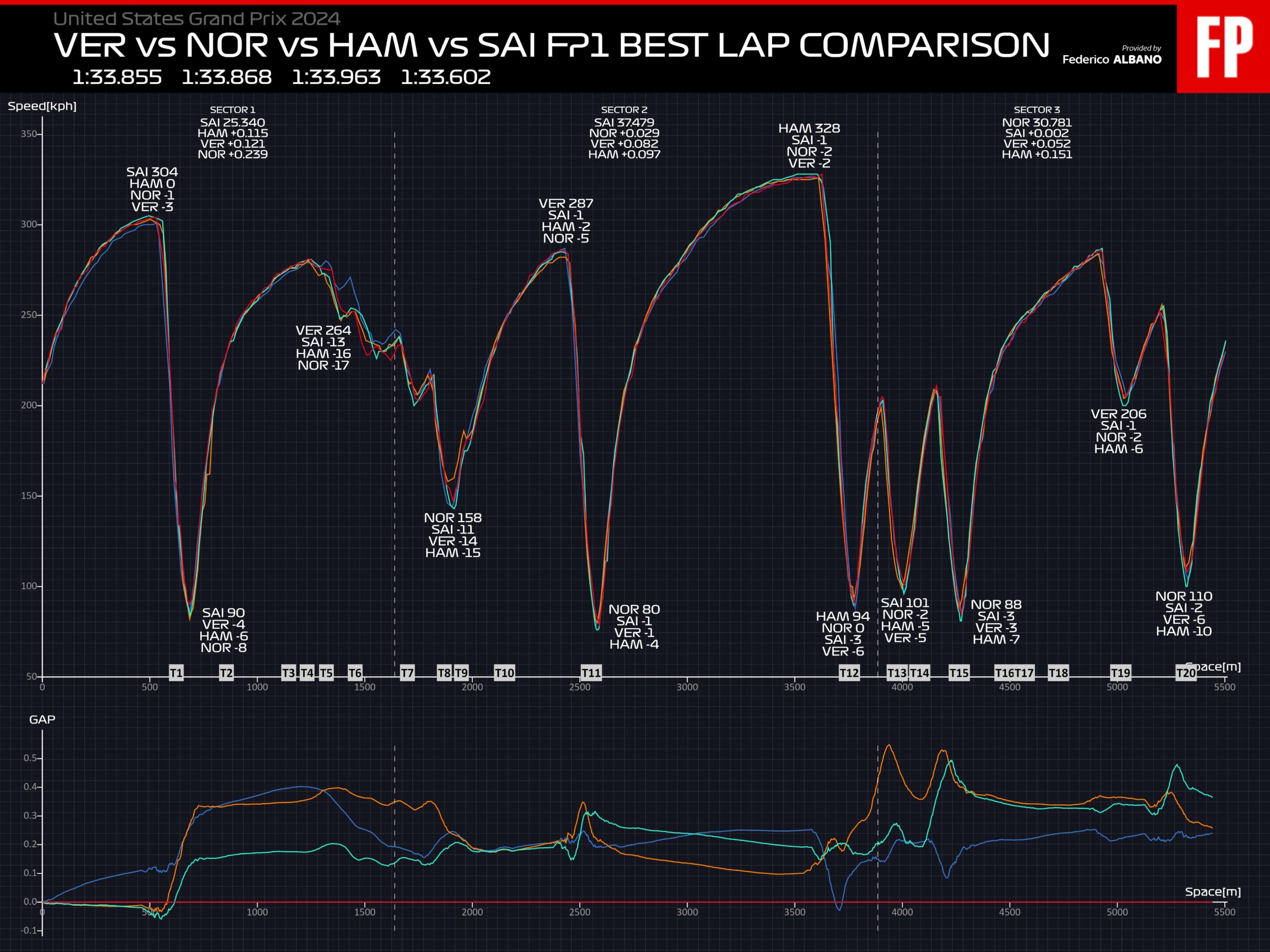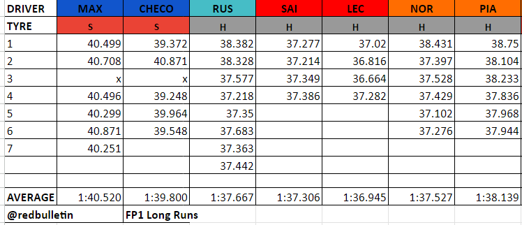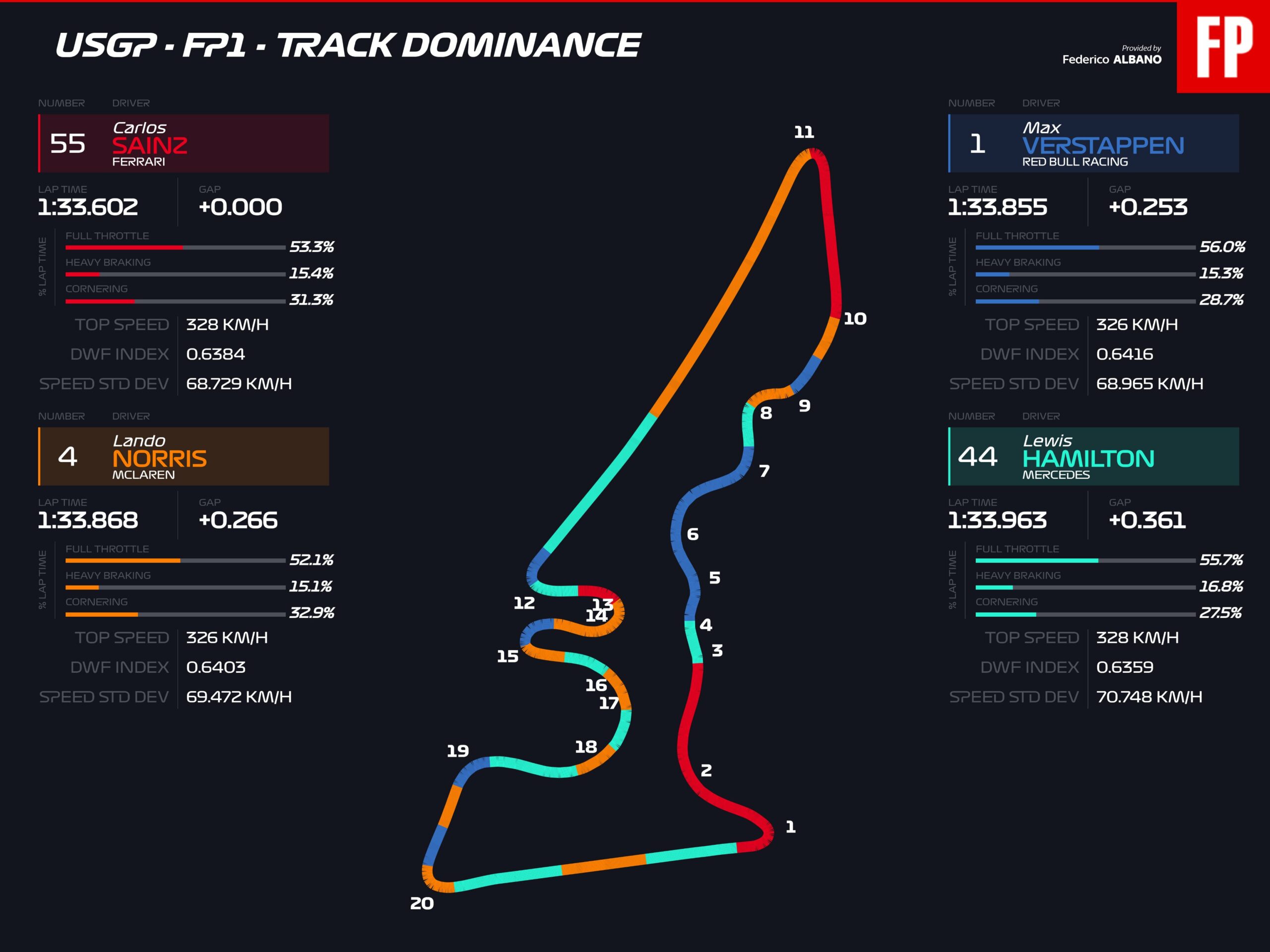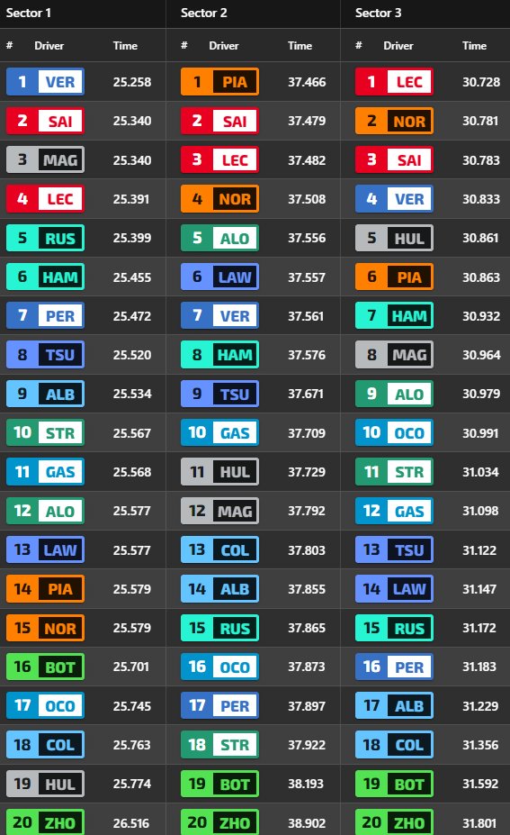 Ο Max Verstappen, με την αναβαθμισμένη Red Bull, βρέθηκε 0,25 δλ. μακριά από την κορυφή, αλλά είχε σημειώσει το χρόνο του σχεδόν μισή ώρα νωρίτερα από τους οδηγούς της Ferrari, όπου η πίστα είχε στρωθεί λιγότερο με γόμα. H Red Bull είναι πολύ καλή στις γρήγορες στροφές του 1ου sector και ο Ολλανδός Πρωταθλητής ήταν 0,013 δλ. ταχύτερος από τον αντίπαλό του στη μάχη του τίτλου, Lando Norris. Άλλα 0,04 δλ. πίσω από τον Βρετανό βρέθηκε ο έτερος οδηγός της McLaren, Oscar Piastri.