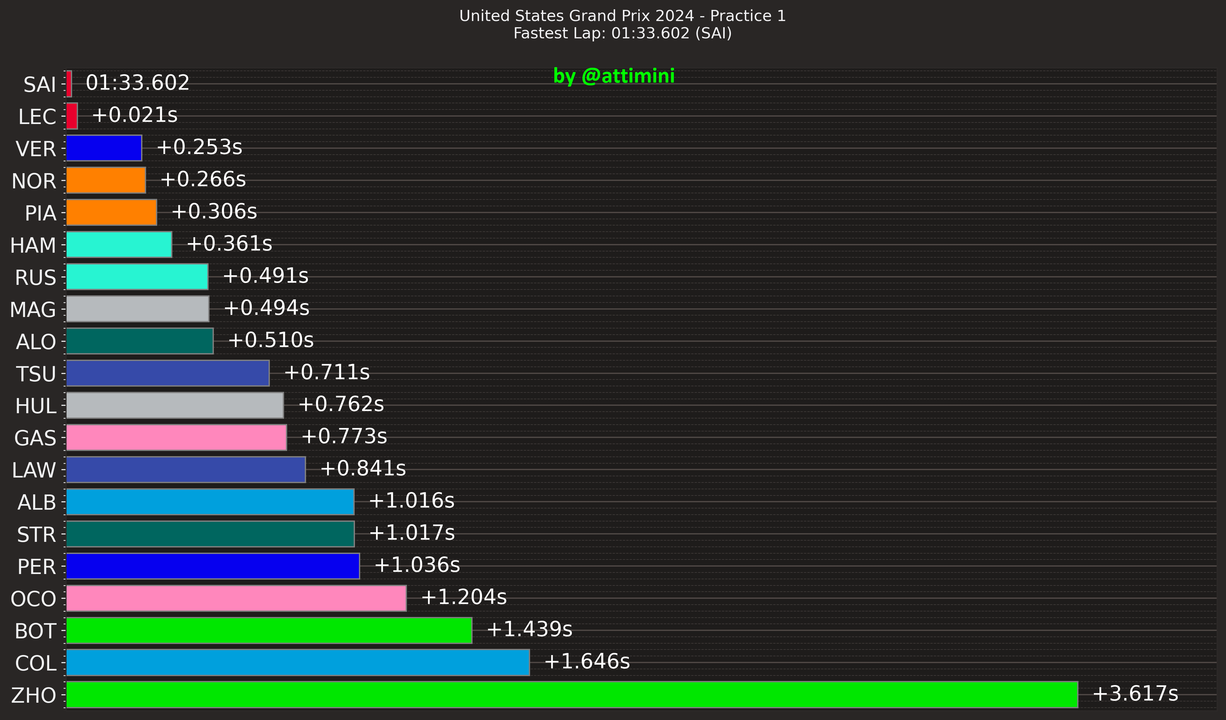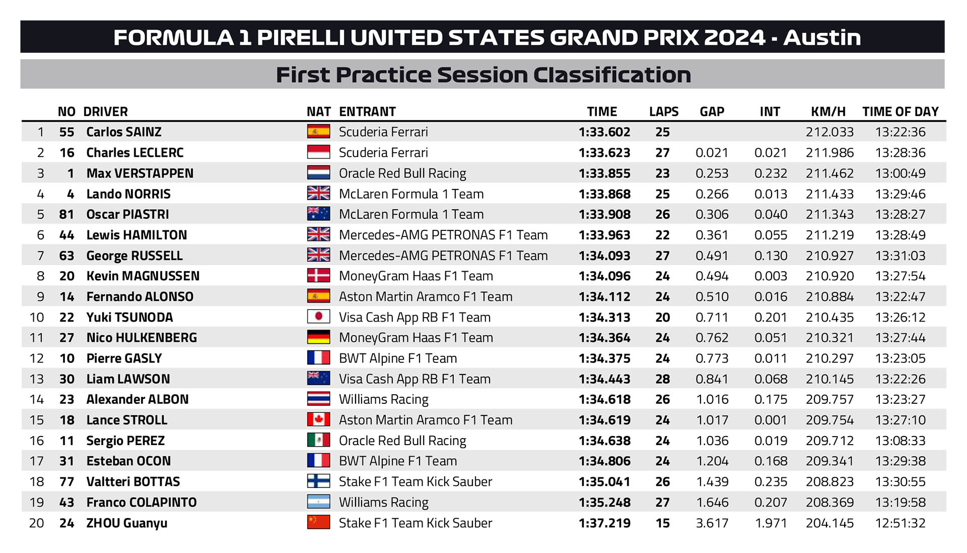 H Ferrari είδε τους δύο οδηγούς της στην κορυφή του πίνακα των χρόνων της μοναδικής περιόδου ελεύθερων δοκιμών αυτού του τριημέρου στο Austin για το Grand Prix Ηνωμένων Πολιτειών της Formula 1, πριν από τις κατατακτήριες δοκιμές του σπριντ. O Carlos Sainz σημείωσε τον ταχύτερο χρόνο της διαδικασίας, μόλις 0,021 δλ. εμπρός από τον team-mate του στη Scuderia, Charles Leclerc.
