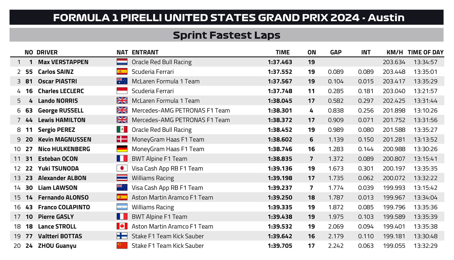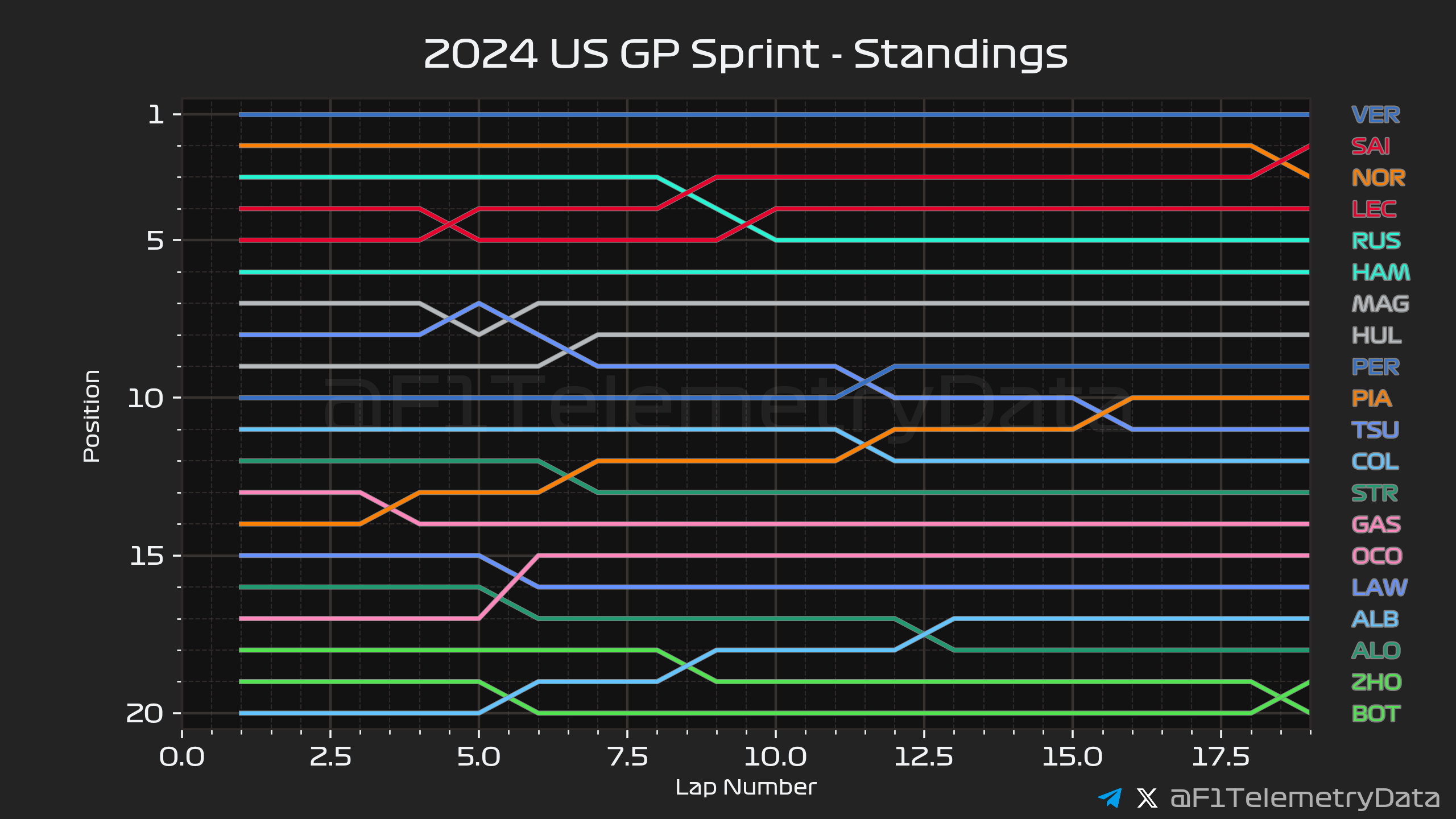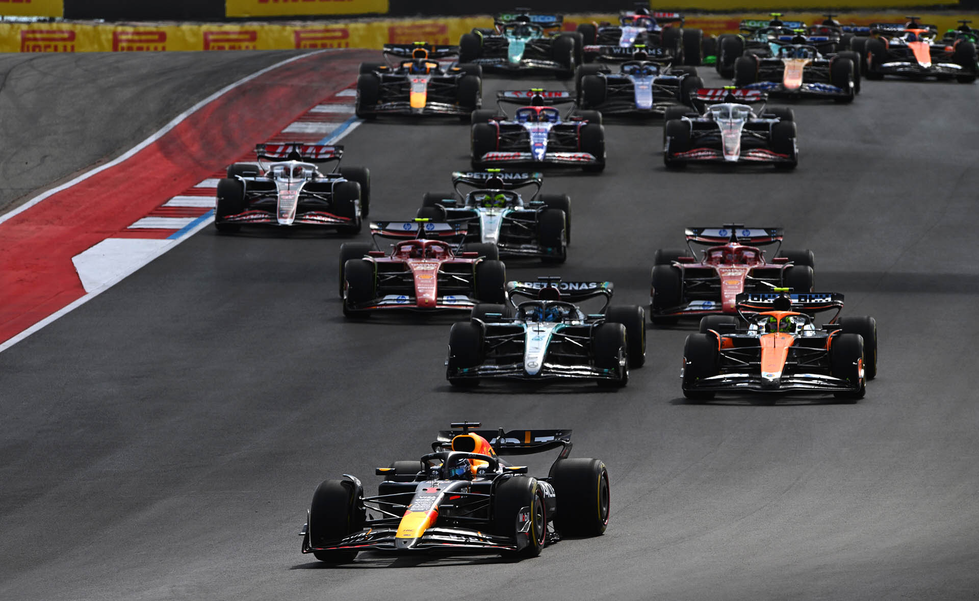 Ο Verstappen άργησε να «σπάσει» το DRS του Lando Norris, ο οποίος είχε βρεθεί 2ος στον 1ο γύρο με καλή εκκίνηση. Ο Norris προσπάθησε να πλησιάσει ξανά, αλλά ο Verstappen είχε τη δυνατότητα να απαντήσει με την αναβαθμισμένη Red Bull να επιβεβαιώνει την καλή εικόνα που έδειξε εχθές. Ο Ολλανδός δήλωσε ότι το σπριντ είχε αίσθηση από… παλαιότερους καιρούς, με τη Red Bull να του παρέχει την κατάλληλη ισορροπία να πιέσει όπως ήθελε και να κερδίσει, έχοντας παράλληλα διατηρήσει σε καλή κατάσταση τα ελαστικά του.