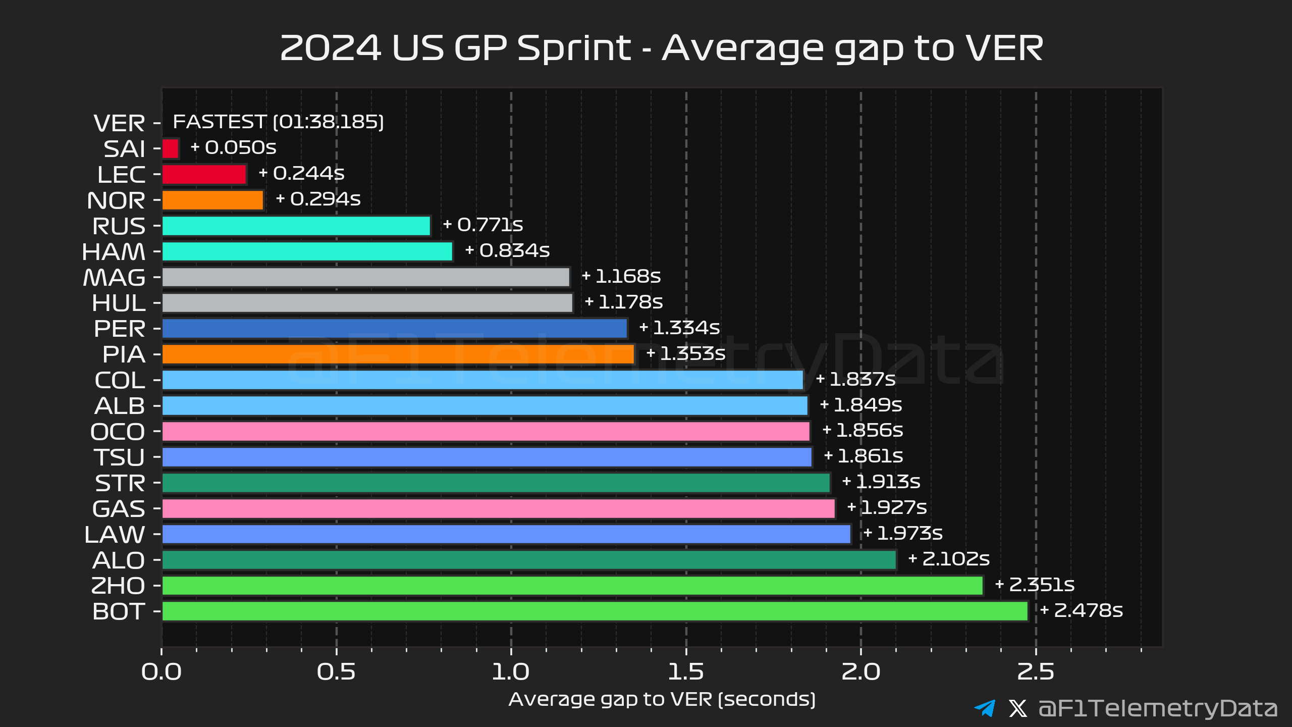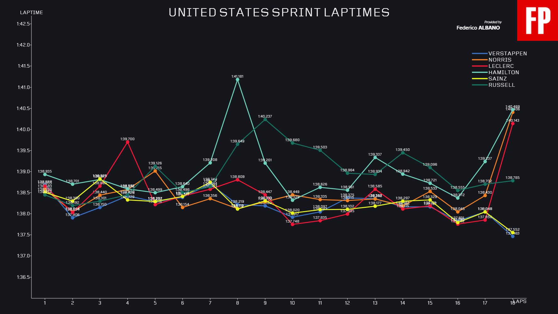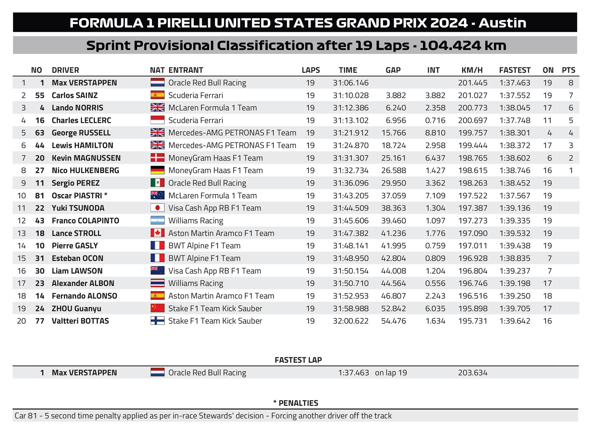 Ο Verstappen άργησε να «σπάσει» το DRS του Lando Norris, ο οποίος είχε βρεθεί 2ος στον 1ο γύρο με καλή εκκίνηση. Ο Norris προσπάθησε να πλησιάσει ξανά, αλλά ο Verstappen είχε τη δυνατότητα να απαντήσει με την αναβαθμισμένη Red Bull να επιβεβαιώνει την καλή εικόνα που έδειξε εχθές. Ο Ολλανδός δήλωσε ότι το σπριντ είχε αίσθηση από… παλαιότερους καιρούς, με τη Red Bull να του παρέχει την κατάλληλη ισορροπία να πιέσει όπως ήθελε και να κερδίσει, έχοντας παράλληλα διατηρήσει σε καλή κατάσταση τα ελαστικά του.