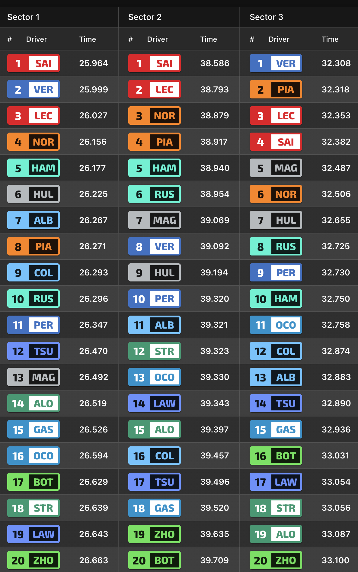 Αντιθέτως, τα εμπρός ελαστικά του Lando Norris είχαν καταπονηθεί υπερβολικά έως τον τελευταίο γύρο. Αυτό έδωσε την ευκαιρία στον Carlos Sainz να επιτεθεί στην 1η στροφή του τελευταίου γύρου, και ένα μπλοκάρισμα φρένων του Norris χάρισε στον Ισπανό τη 2η θέση. Ο Sainz είχε κερδίσει την πολύ ωραία μάχη με τον team-mate του στους πρώτους γύρους και ισοφάρισε το καλύτερο αποτέλεσμά του σε σπριντ. Παρότι ο Sainz δεν επικεντρώθηκε στη διαχείριση ελαστικών, αλλά τα διατήρησε σε πολύ καλή κατάσταση, κάτι ενθαρρυντικό για τον αγώνα για τη Ferrari.