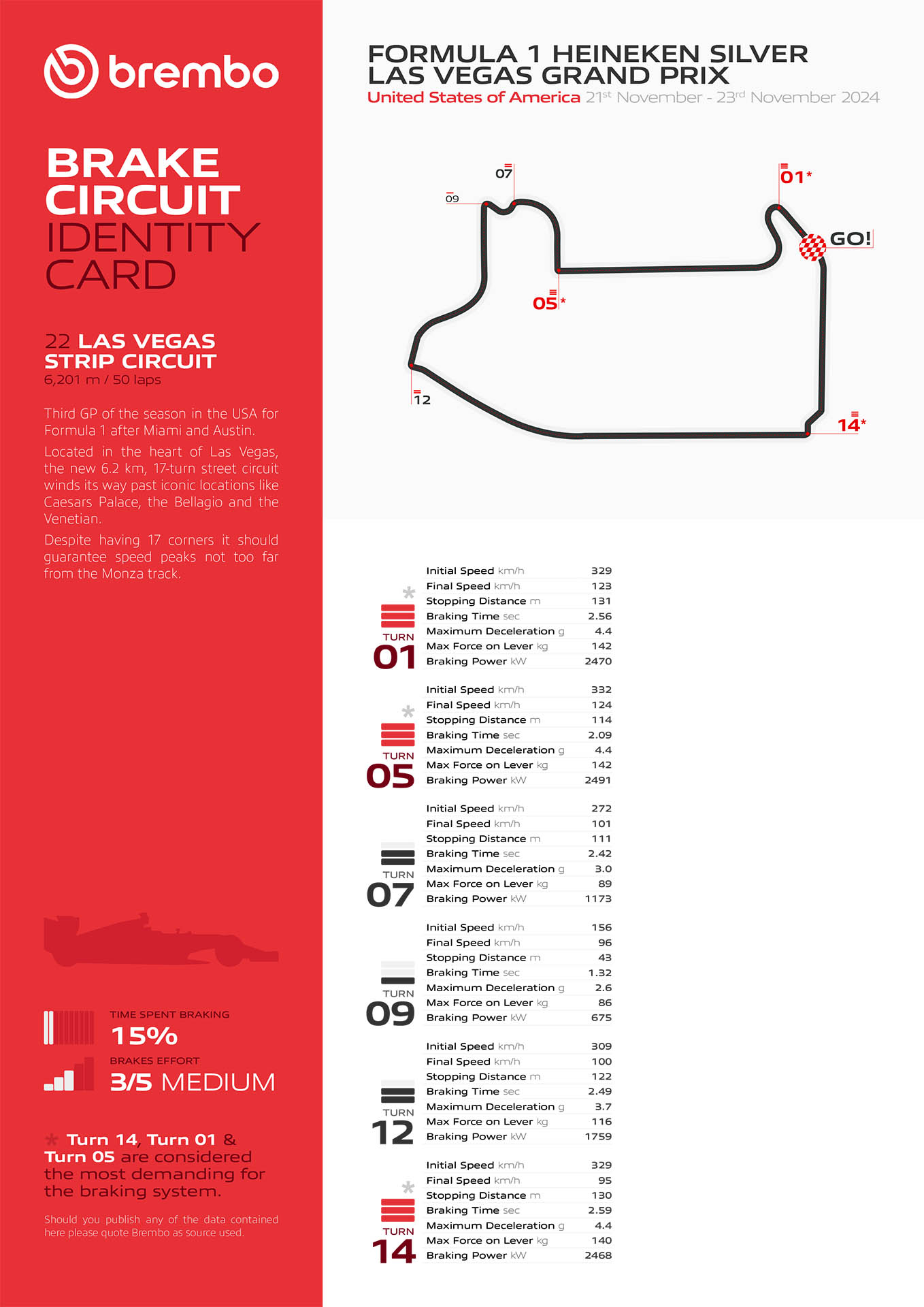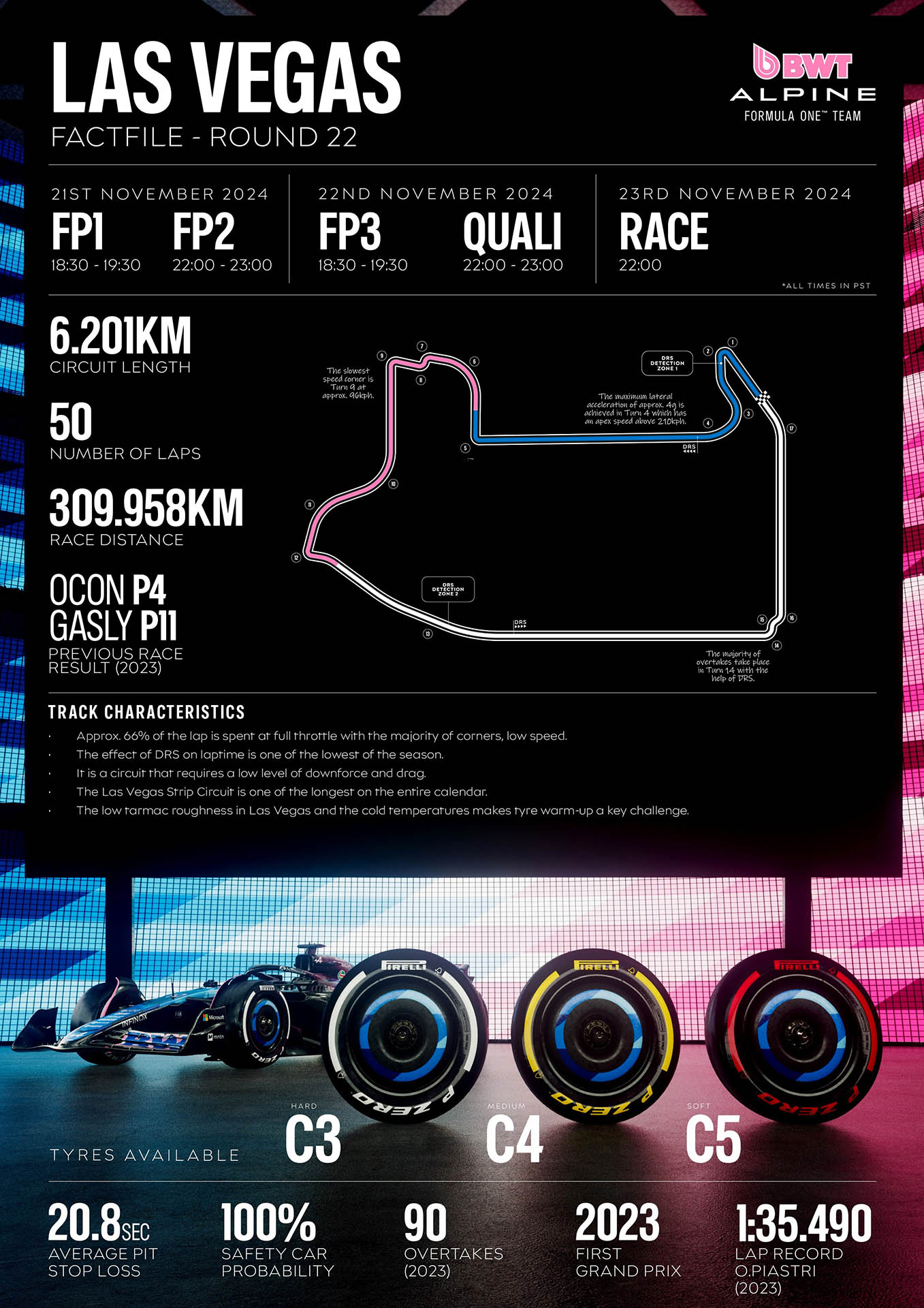 To αριστερόστροφο σιρκουί στους δρόμους του Λας Βέγκας έχει μήκος 6.201 μ. (το δεύτερο μεγαλύτερο της χρονιάς έπειτα από το Spa-Francorchamps), διαθέτει ένα τμήμα 1.900 μέτρων που οδηγοί θα διανύουν με τέρμα γκάζι για 21 δλ. Με πολύ υψηλές μέσες ωριαίες ταχύτητες, που αγγίζουν τα 240 χλμ./ώρα στις κατατακτήριες δοκιμές, οι ομάδες χρησιμοποιούν πακέτα χαμηλού αεροδυναμικού φορτίου, για να μειώσουν την οπισθέλκουσα των μονοθεσίων στις ευθείες.