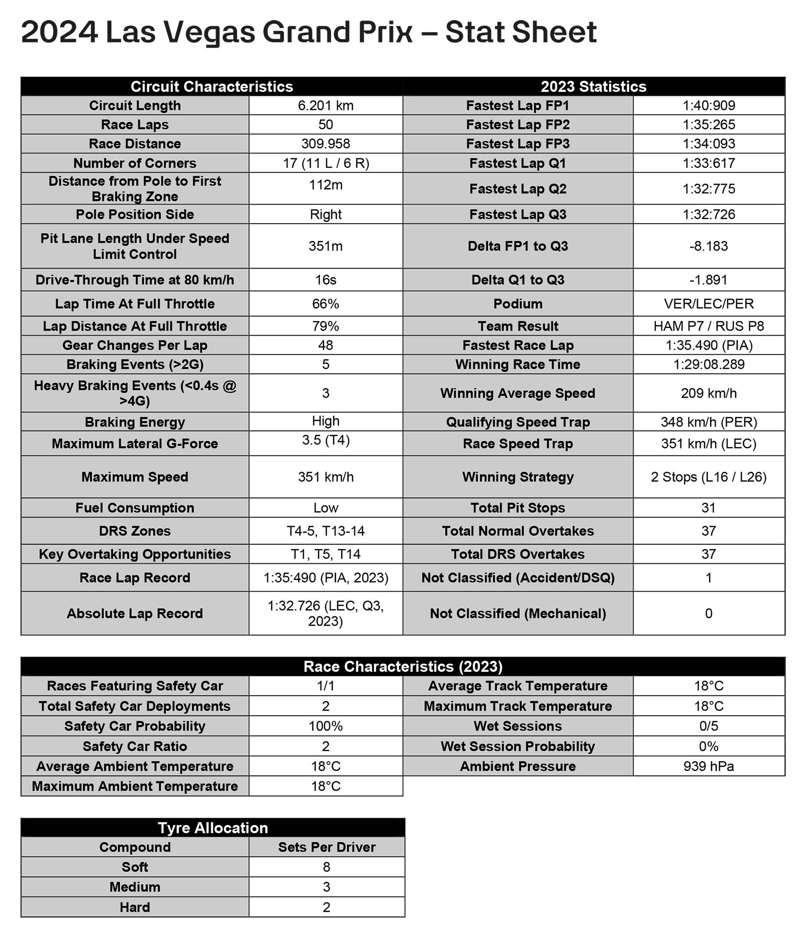H Ferrari είχε αποδώσει πολύ καλά και πέρυσι στο Λας Βέγκας, με τον Charles Leclerc να δίνει μία πολύ ωραία μάχη στους τελευταίους γύρους με τον Sergio Perez για να τερματίσει στη 2η θέση, πίσω από το νικητή Max Verstappen. Παρά τη νίκη του Ολλανδού στον προηγούμενο αγώνα φέτος, θα είναι δύσκολο για τη Red Bull να επαναλάβει αυτή την επιτυχία και μένει να διαπιστωθεί αν θα μπορεί να παλέψει με τη Ferrari και τη McLaren, με την τελευταία να αναμένεται όπως πάντα ανταγωνιστική και αυτό Σαββατοκύριακο.