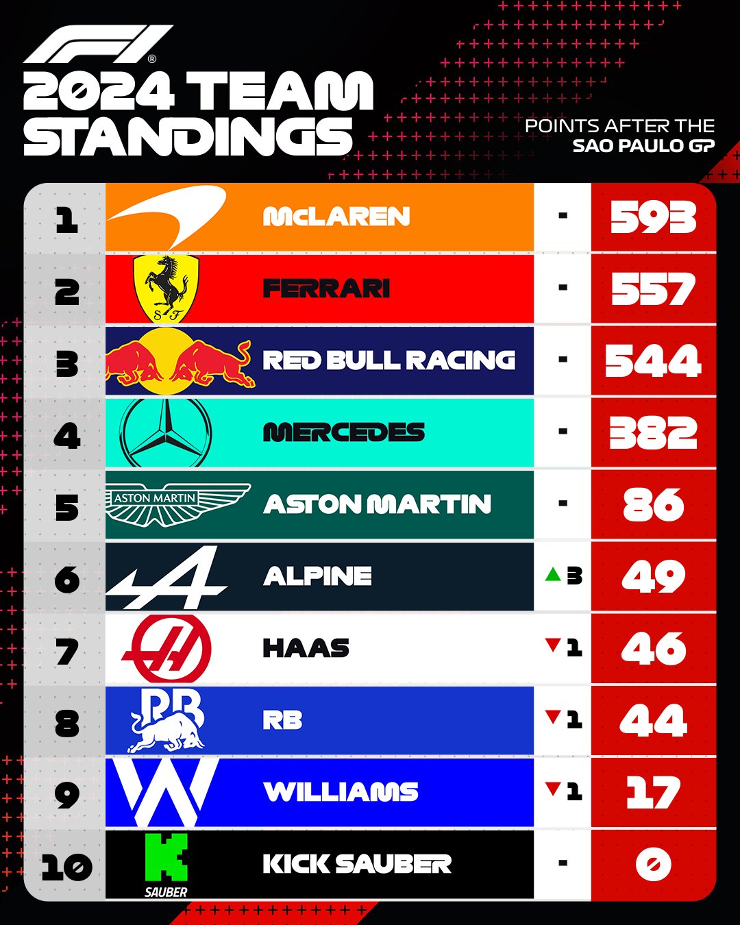 Στην ουσία, η μάχη για το Πρωτάθλημα Οδηγών έφτασε στο τέλος της στο GP Σάο Πάολο, καθώς ο Max Verstappen, έπειτα από τη νίκη του εκεί, χρειάζεται πλέον να σημειώσει μόλις 2 βαθμούς περισσότερους από τον Lando Norris για να κατακτήσει και μαθηματικά τον τίτλο ήδη αυτό το Σαββατοκύριακο. Διαφορετική είναι η εικόνα στο Πρωτάθλημα Κατασκευαστών, όπου η McLaren εξακολουθεί να διατηρεί ένα ισχυρό προβάδισμα 36 βαθμών επί της Ferrari και 49 βαθμών επί της Red Bull, αλλά η μάχη εξακολουθεί να είναι σκληρή.