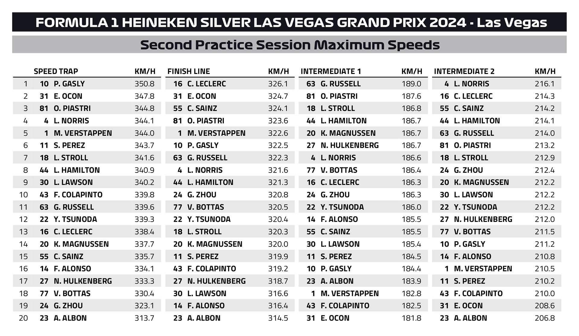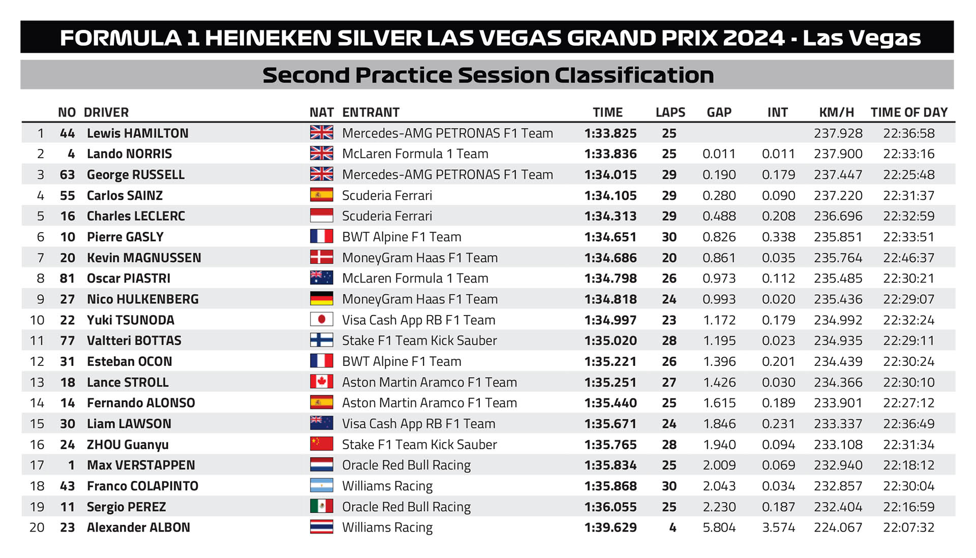 Όπως είχε συμβεί και στο FP1 του Grand Prix Λας Βέγκας της Formula 1, ο Lewis Hamilton σημείωσε με τη Mercedes τον ταχύτερο χρόνο και της δεύτερης διαδικασίας ελεύθερων δοκιμών. Ο Βρετανός κατάφερε να σημειώσει την επίδοσή του στη δεύτερη γρήγορη προσπάθειά του με τη μαλακή γόμα, λίγες στιγμές πριν η διαδικασία διακοπεί με κόκκινη σημαία.