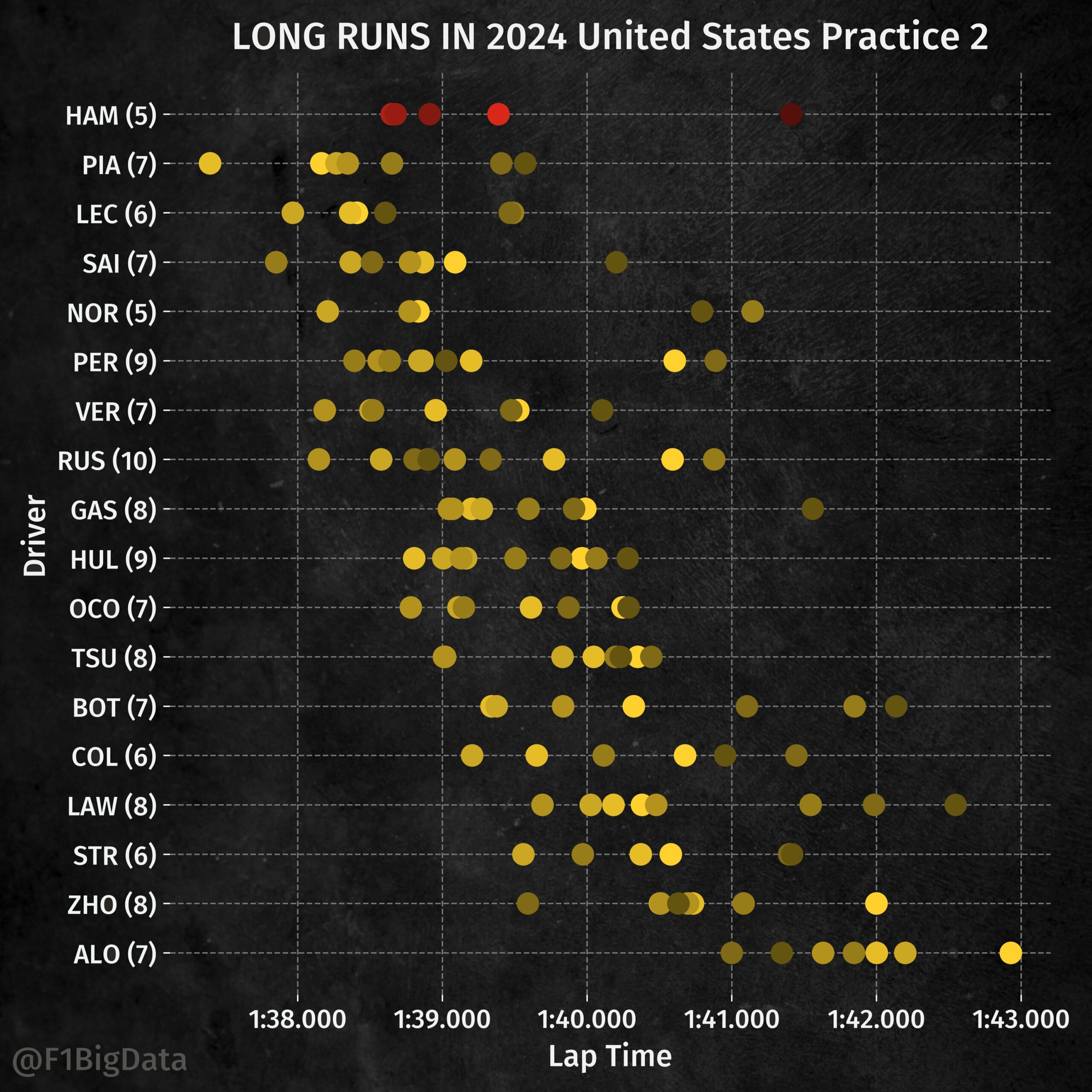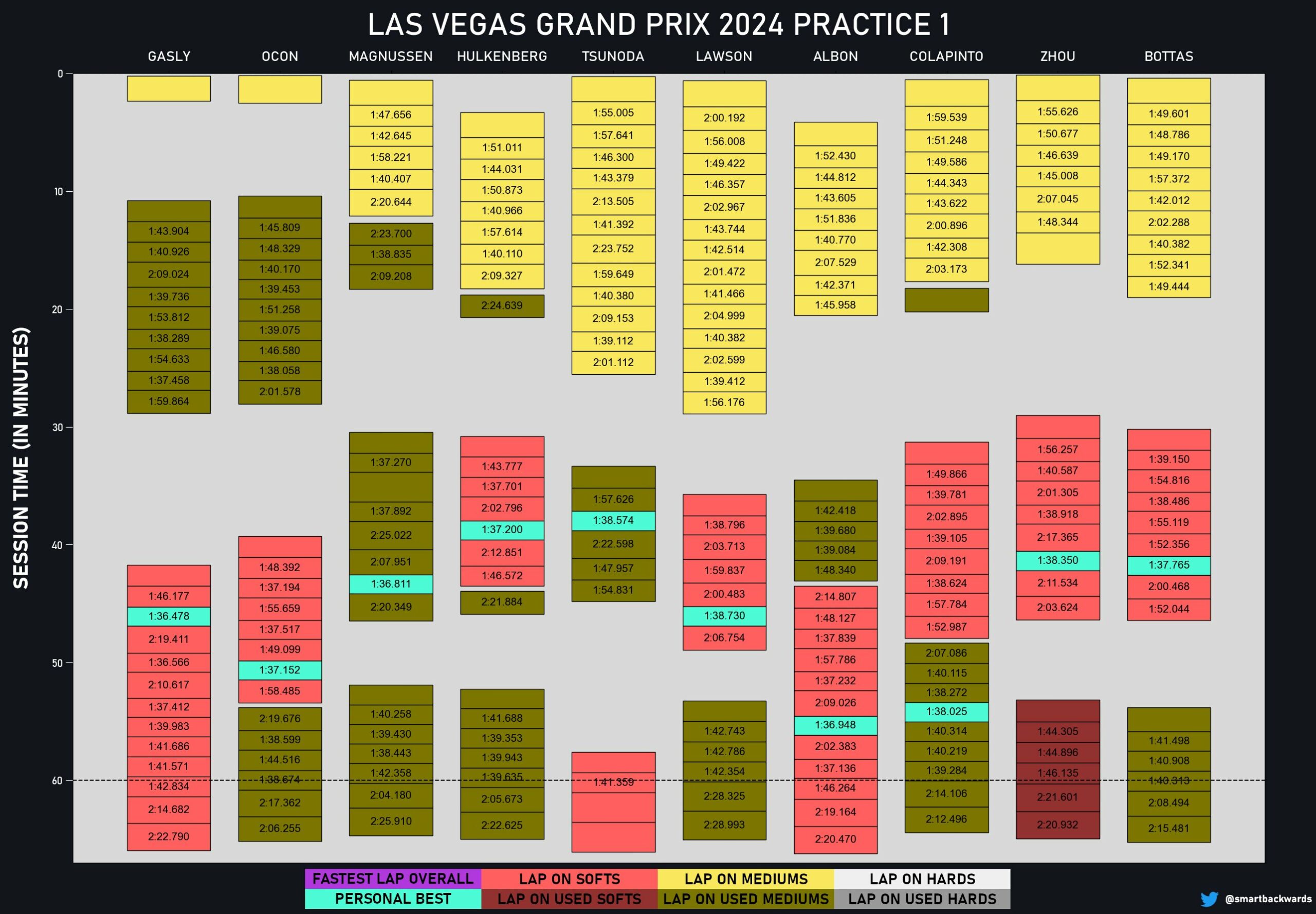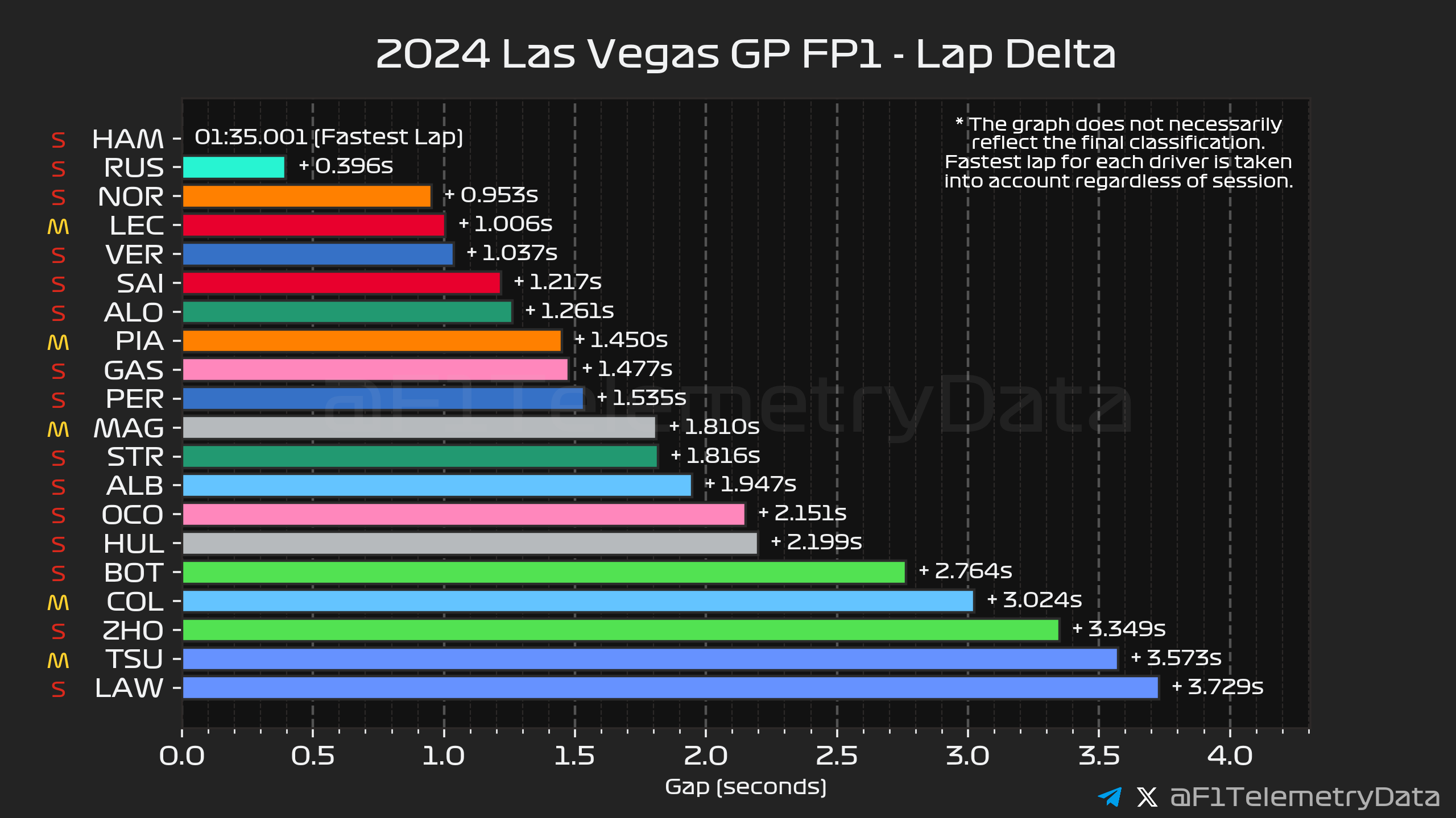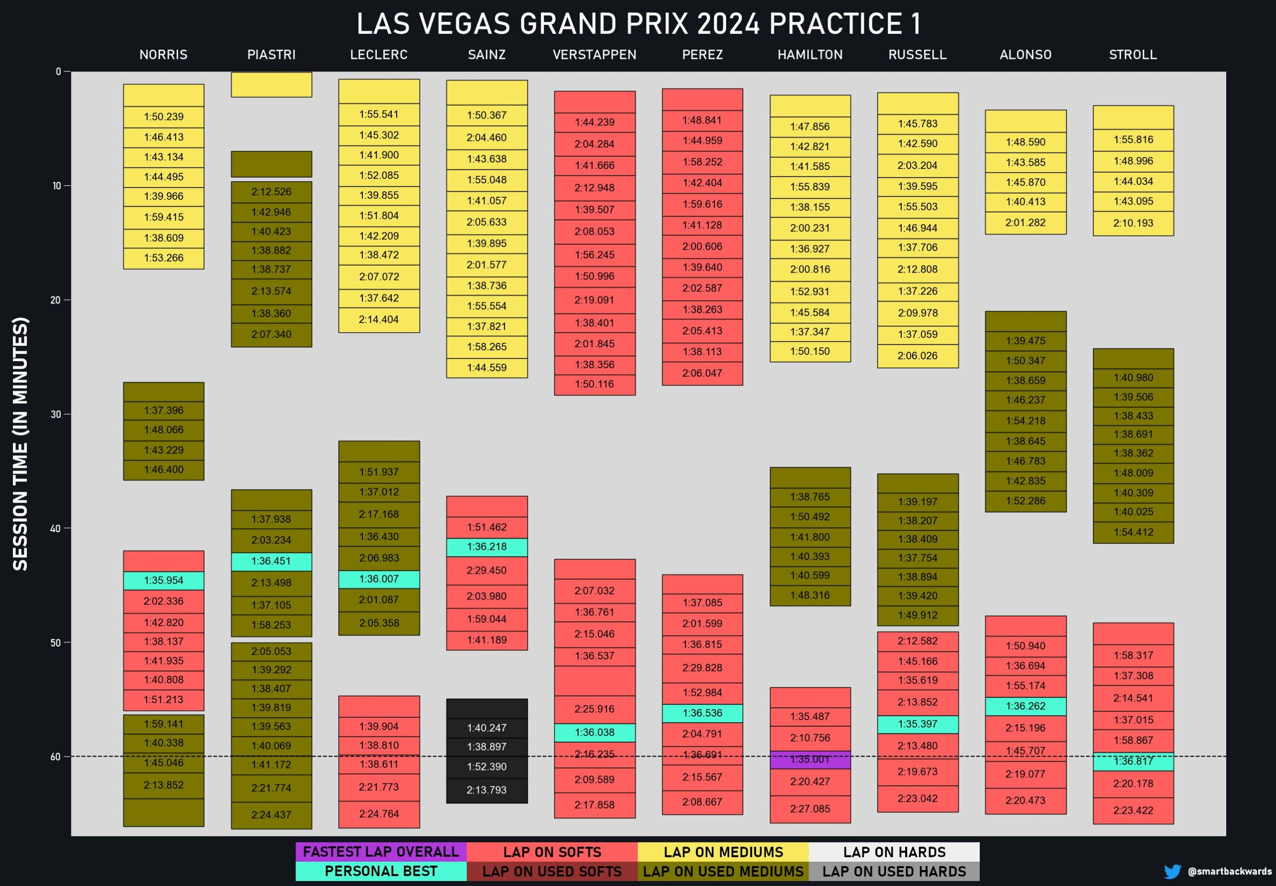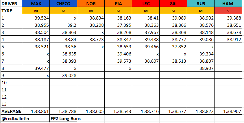 Η Ferrari προσέγγισε πιο συντηρητικά την αρχή του stint, για να αποδειχθεί ταχύτερη στη συνέχεια, πάντα με τη μέση γόμα. Η Mercedes βρέθηκε πιο πίσω με τα ίδια ελαστικά, ενώ ο Hamilton χρησιμοποιούσε τα μαλακά, τα οποία καταπονήθηκαν νωρίτερα. Οι χρόνοι του Verstappen εντωμεταξύ δεν ήταν εντυπωσιακοί, με τον Ολλανδό να αναφέρει ότι δεν είχε καθόλου πρόσφυση. Φαίνεται ότι η πίσω αεροτομή που διαθέτει η Red Bull είναι πολύ μεγάλη για την πίστα του Λας Βέγκας και παράγει υπερβολικές τιμές οπισθέλκουσας, μεταθέτοντας παράλληλα την ισορροπία πρόσφυσης προς τον πίσω άξονα.
