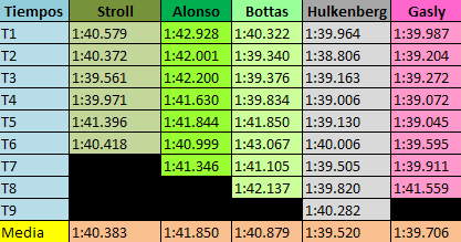 Στην ουρά του πίνακα των χρόνων βρέθηκαν οι δύο οδηγοί της Red Bull. O Max Verstappen αναγκάστηκε να εγκαταλείψει την πρώτη του γρήγορη προσπάθεια με τη μαλακή γόμα, έχοντας υπερβολική υποστροφή, για να βρεθεί εκτός ορίων πίστας στην 3η στροφή, πιθανώς επειδή δεν είχε αναπτύξει επαρκείς θερμοκρασίες στα εμπρός ελαστικά του.