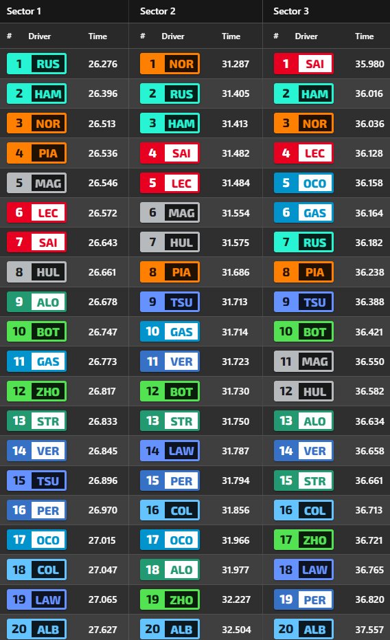 Πίσω από τον Russell βρέθηκαν οι δύο Ferrari με τον Carlos Sainz 0,28 δλ. μακριά από την κορυφή και τον Charles Leclerc σχεδόν μισό δλ. Το γεγονός ότι ο Sainz σημείωσε τον ταχύτερο χρόνο στο τελικό sector της πίστας, δείχνει ότι πέραν από την αποδοτικότητα της Ferrari στις ευθείες, ίσως δυσκολεύεται λίγο να φέρει τα ελαστικά της στις κατάλληλες θερμοκρασίες σε ένα γρήγορο γύρο.
