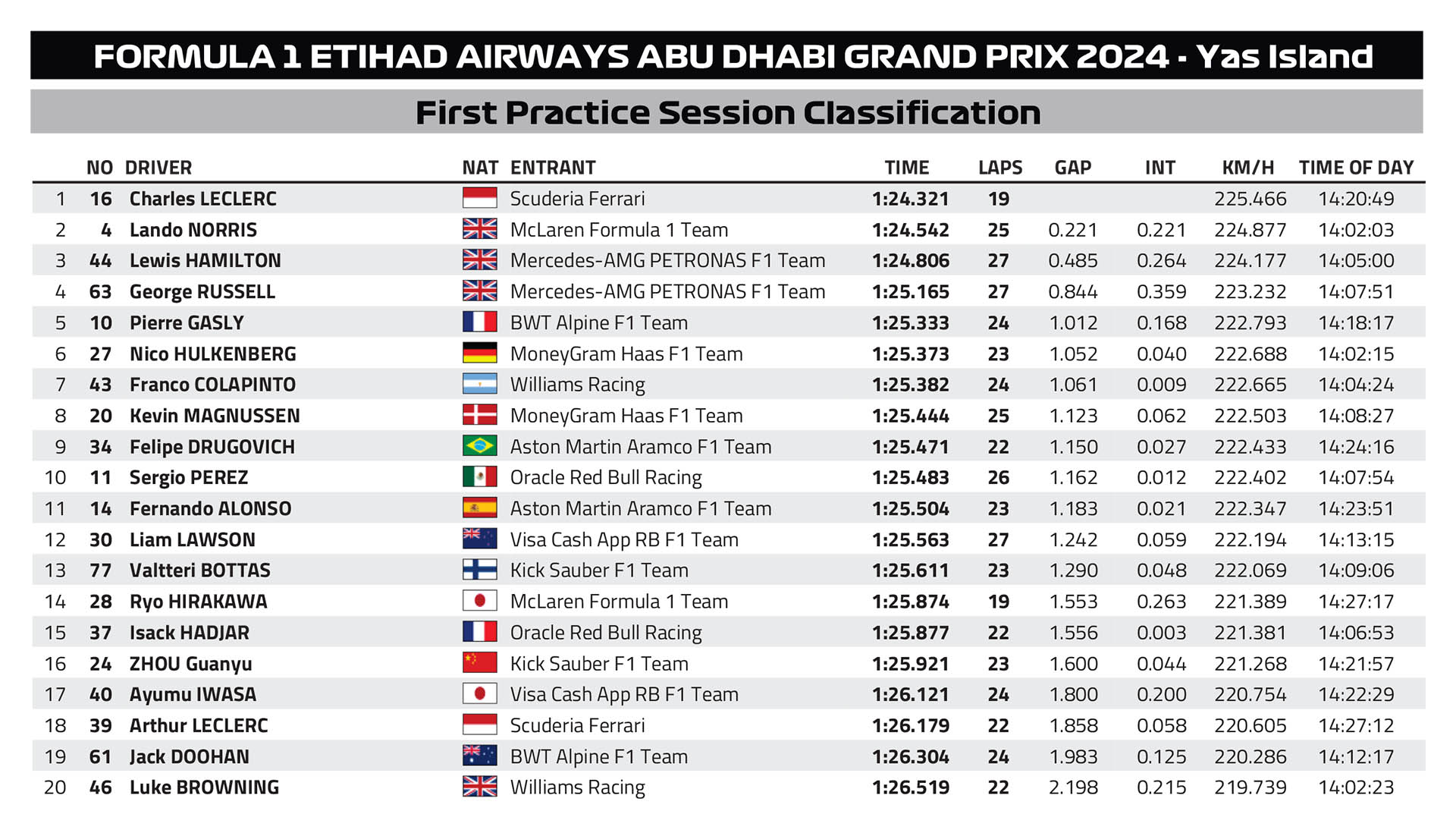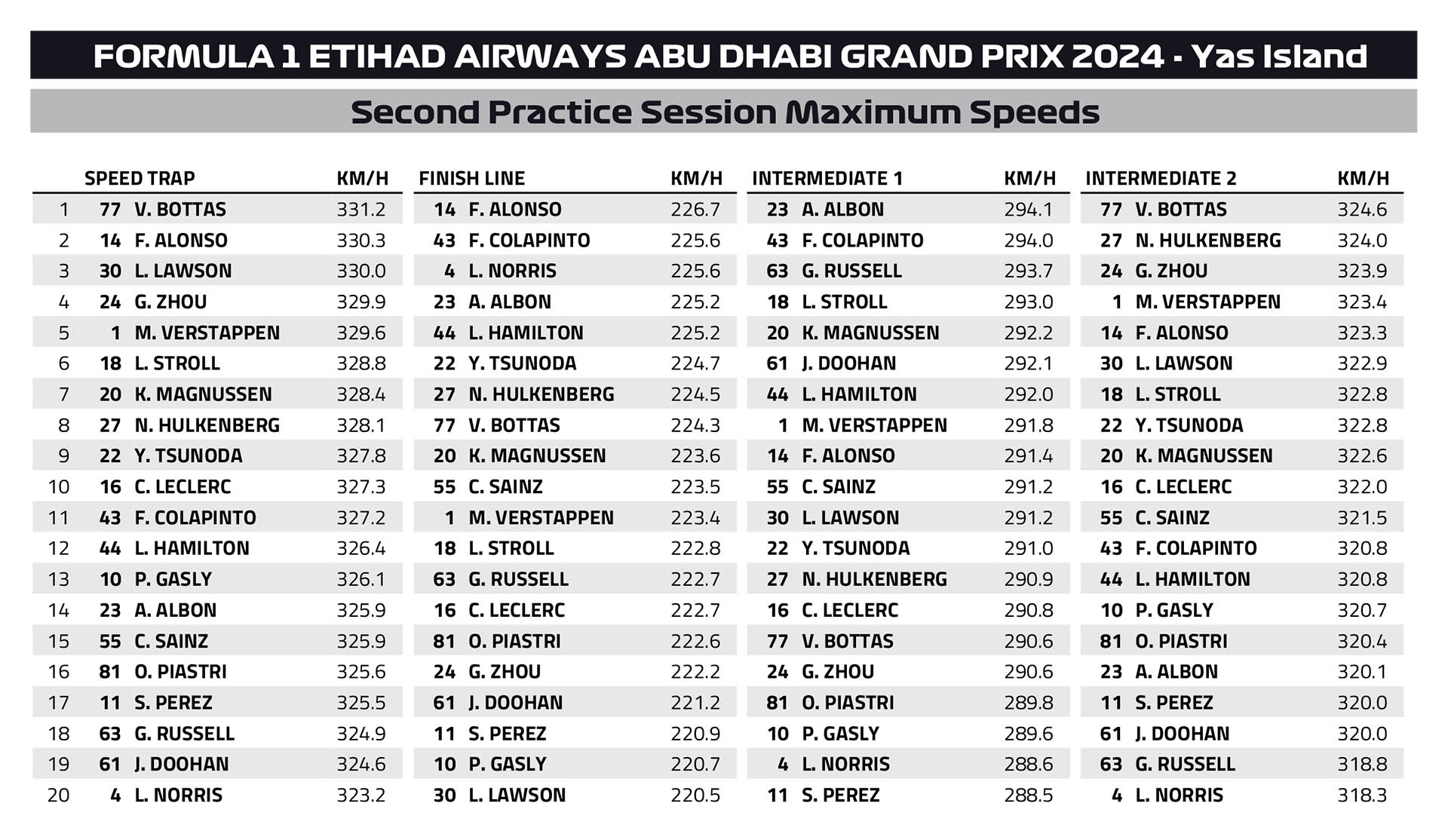 Το FP2 είναι η μοναδική περίοδος ελεύθερων δοκιμών του Grand Prix Άμπου Ντάμπι, το οποίο ολοκληρώνει τη φετινή σεζόν της Formula 1, που διεξάγεται σε αντιπροσωπευτικές συνθήκες και κατά συνέπεια είναι η πιο σημαντική από τις τρεις. Σε αυτήν, οι δύο οδηγοί της McLaren σημείωσαν τους δύο ταχύτερους χρόνους.